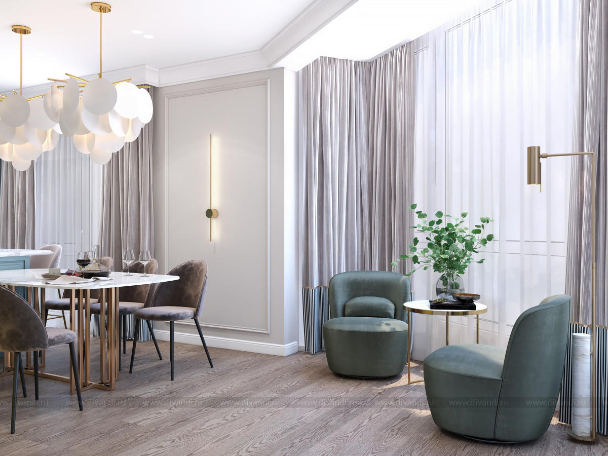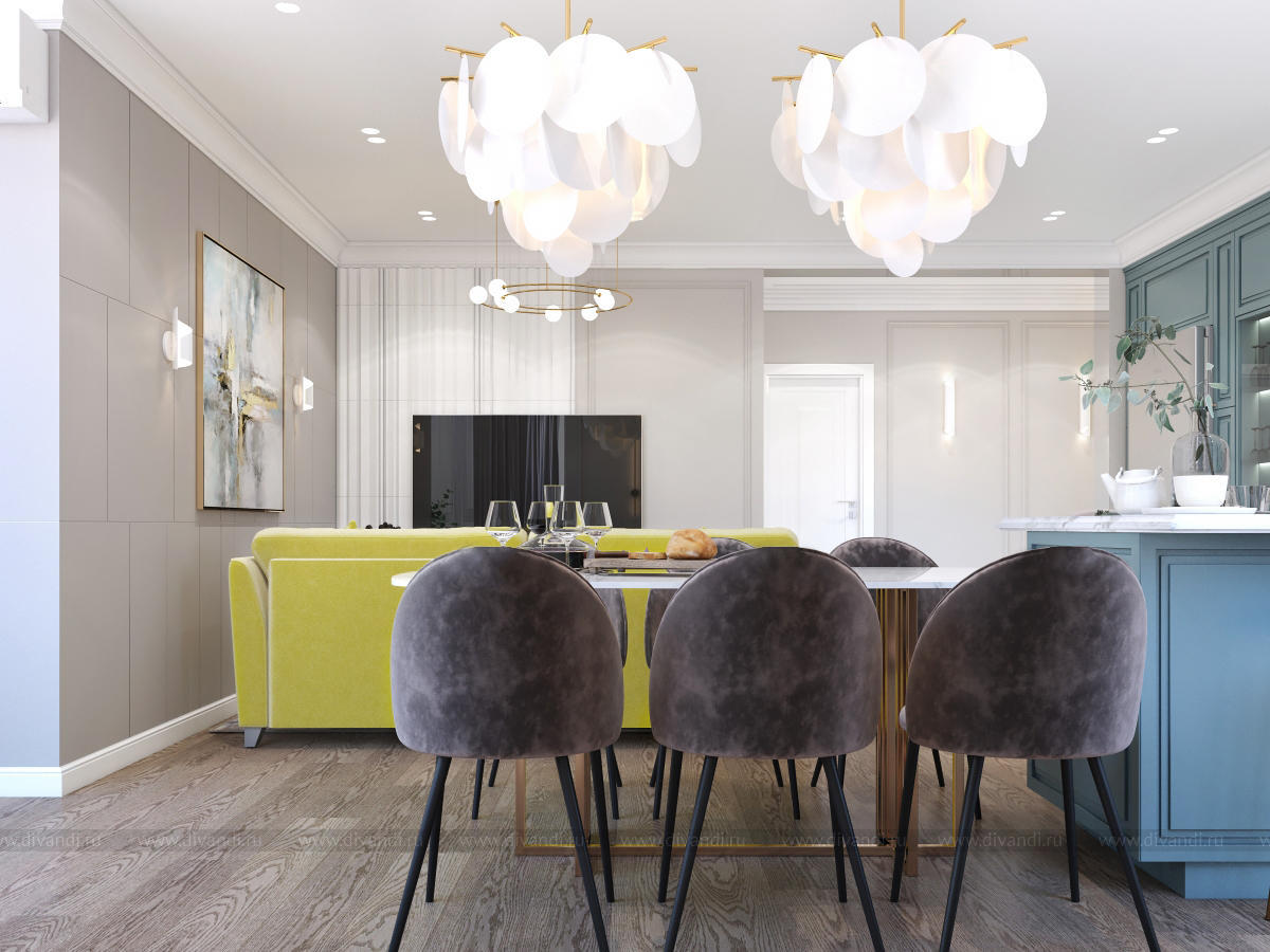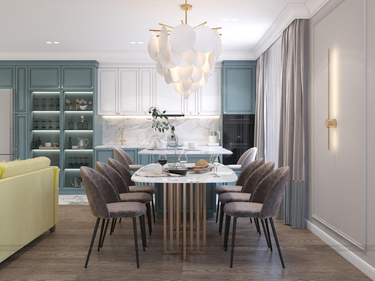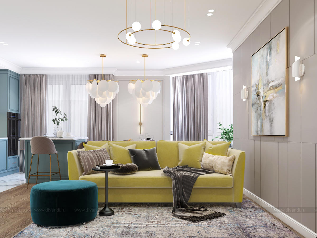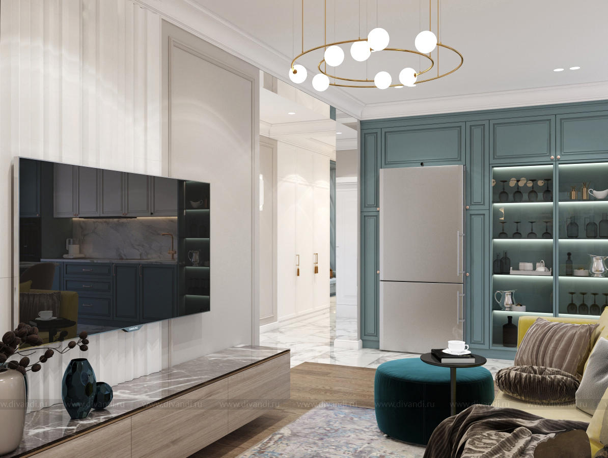 Гостиная-кухня в квартире г. Сочи в стиле неоклассика.