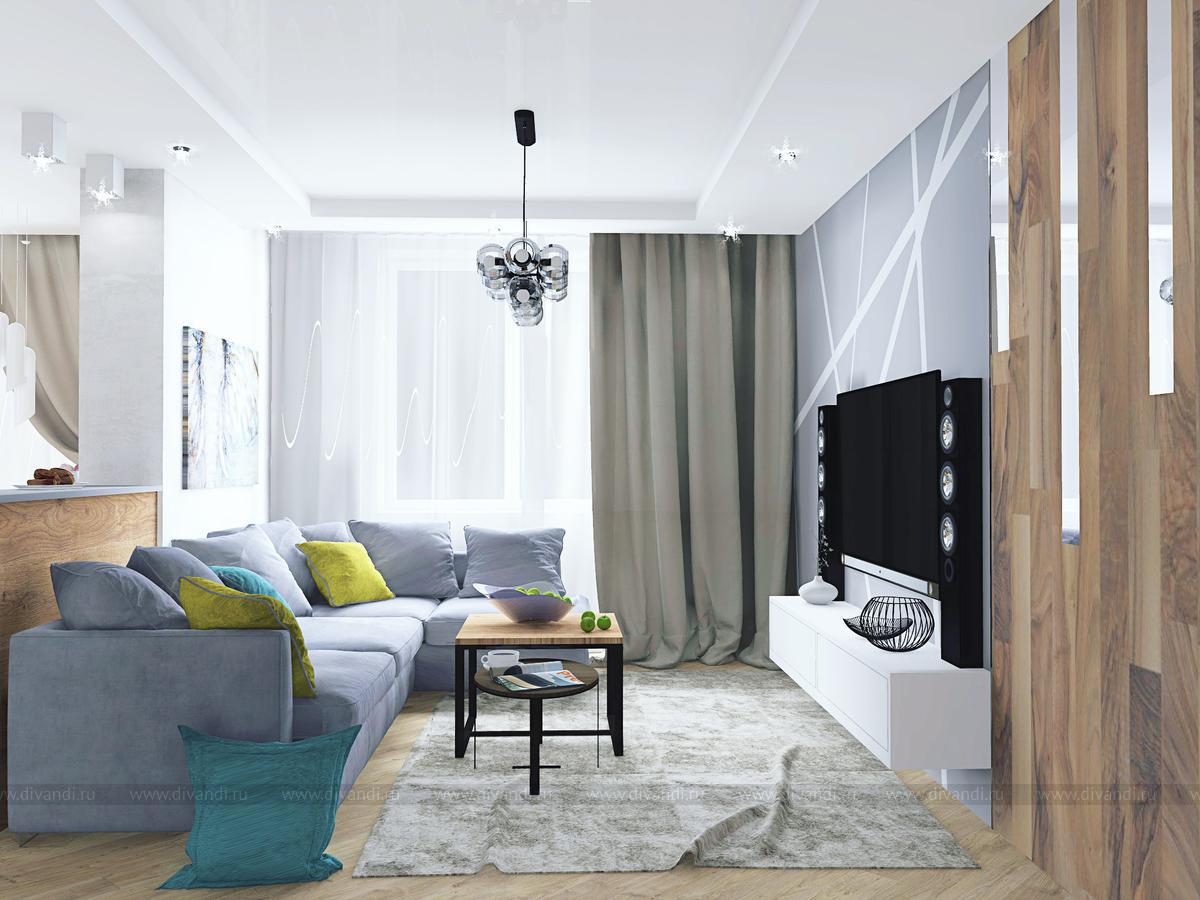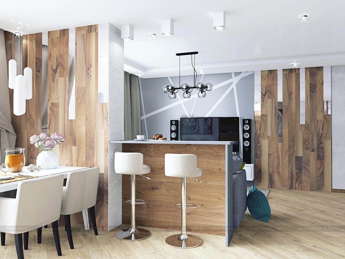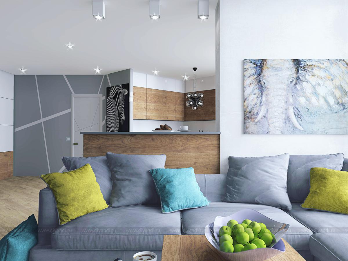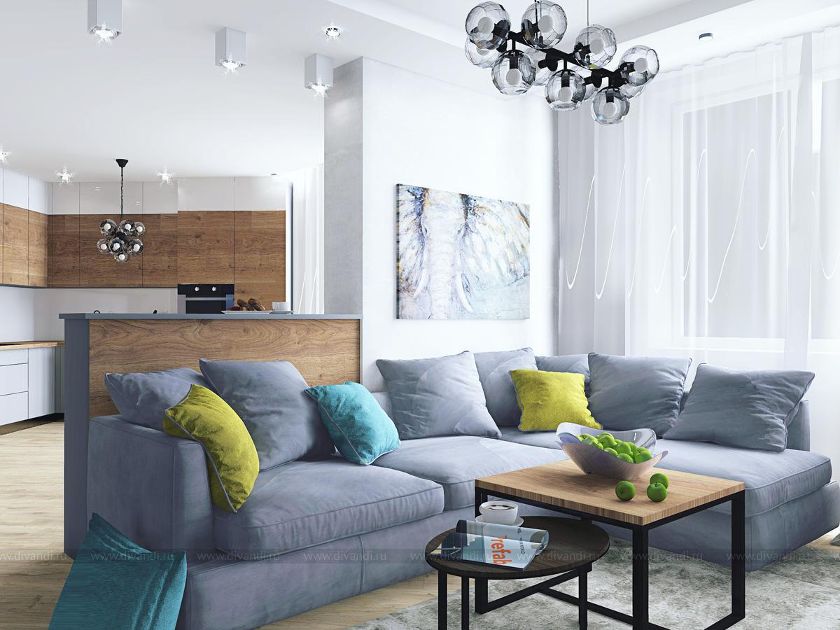 Гостиная,объединенная с кухней,в четырехкомнатной квартире для семьи из 4х человек