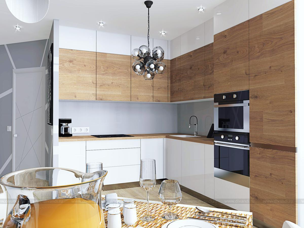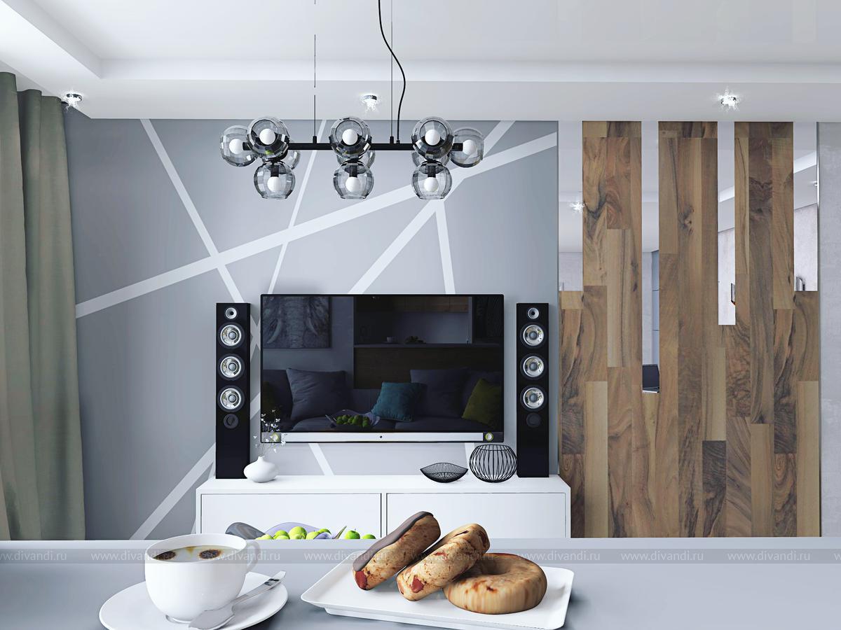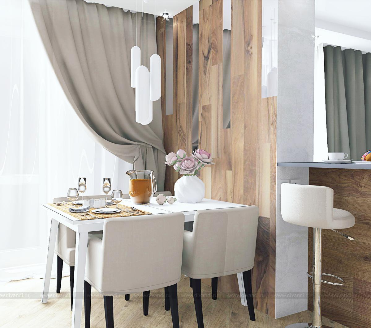 Гостиная,объединенная с кухней,в четырехкомнатной квартире для семьи из 4х человек