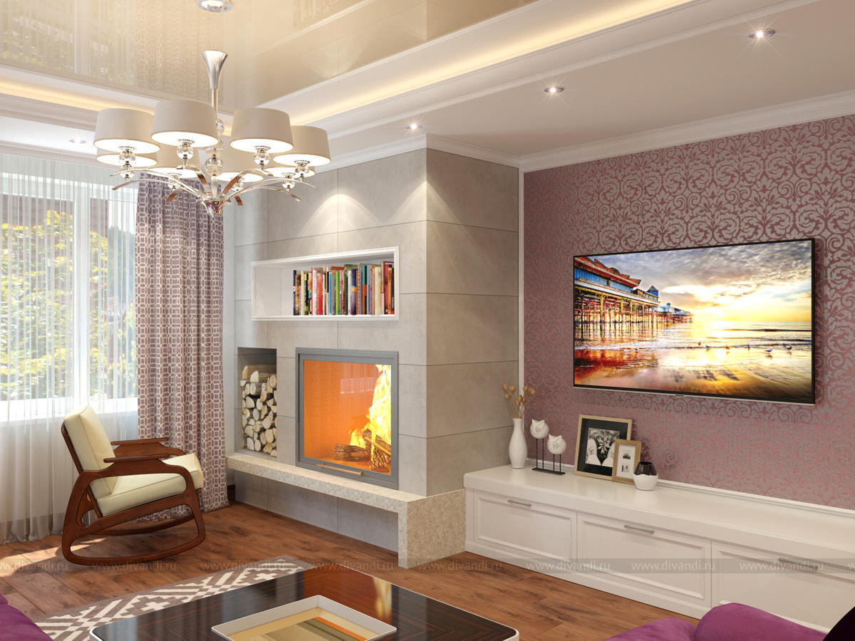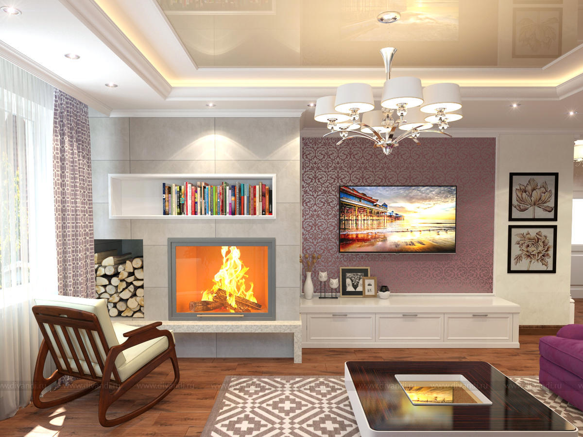 Сиреневый диван в гостиной с камином. Легкая классика.