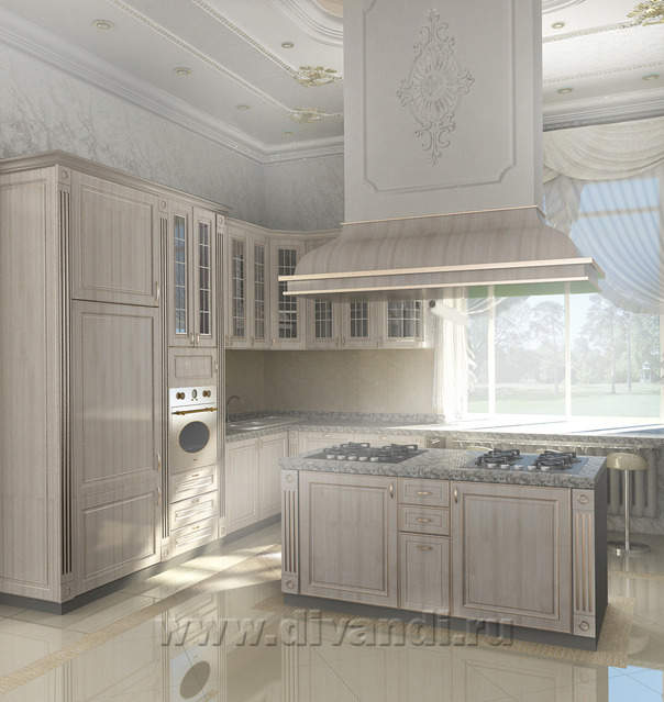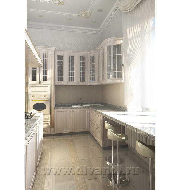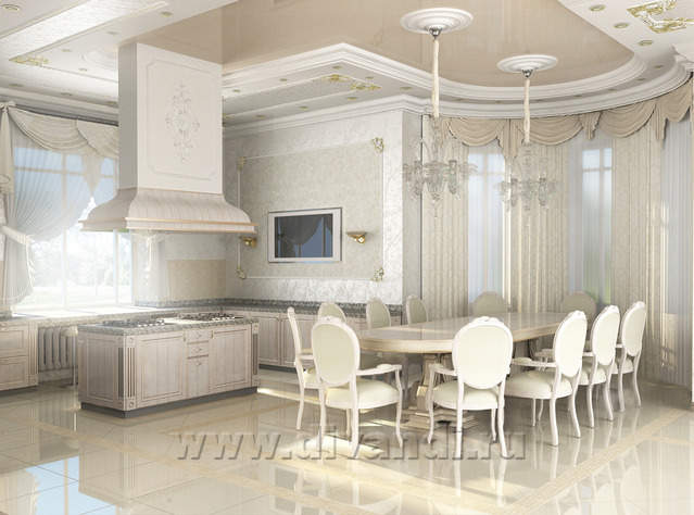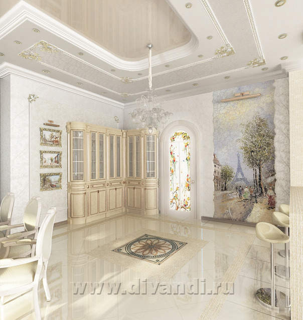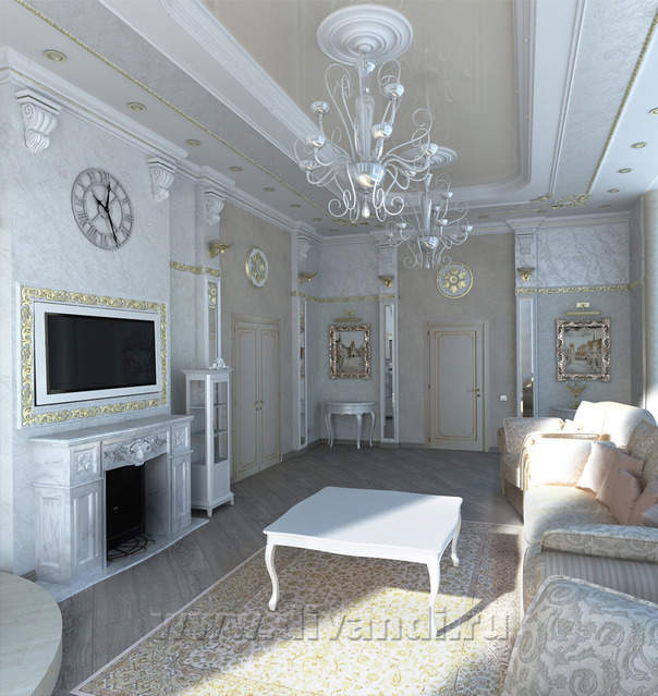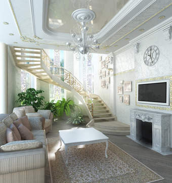 Пространство этого помещения заинтересовало наших дизайнеров своими масштабами. Задача состояла в том, чтобы сделать это пространство уютным и функциональным, при этом не нарушая концепции гостиная + кухня-столовая. Интерьер мы решили сделать на нюансном соотношении белых, кремовых и розовато-серых цветов. Так как объект находиться в городе Сургуте нас вдохновила идея заснеженного города и мы попытались перенести её в интерьер. Пол в гостиной зоне выполнен из ламината бельгийской фабрики Balterio коллекция Дуб Веллингтон, а в зоне кухни-столовой выложен из керамогранита и мозаики. Стены решено было декорировать различными видами штукатурок и обоями, а так же лепниной Gaudi. В интерьере гостиной присутствует лестница, которая была разработана нашими конструкторами и дизайнерами. Перед ними стояла задача, чтобы через несущие элементы лестницы проникал естественный свет.
