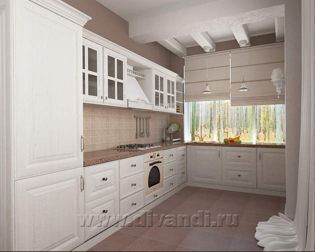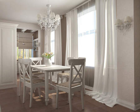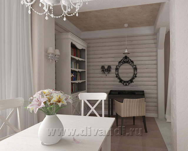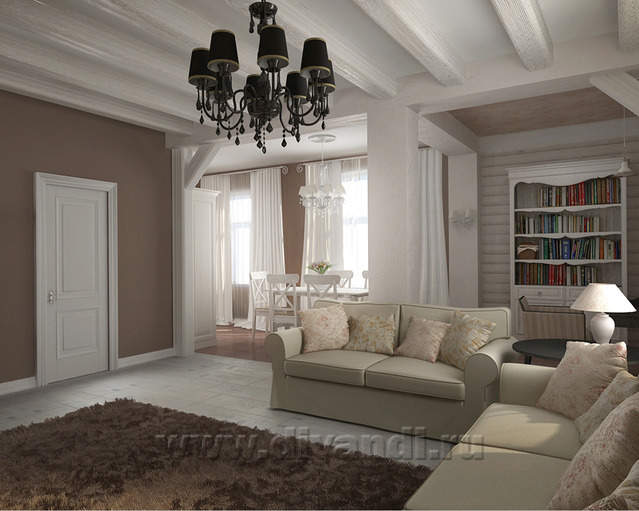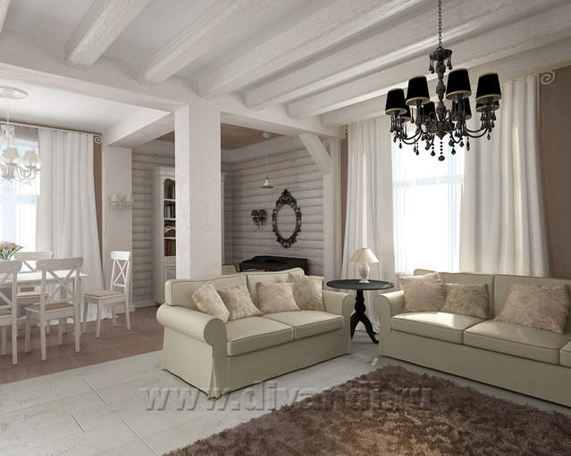 Хозяевам этого загородного дома хотелось, чтобы после Екатеринбургской суеты, приехав в дом на выходные, их окружал спокойный уютный интерьер. Это требование вдохновило нас выполнить интерьер гостиной с кухонной зоной в стиле Прованс. Прованс - это французский провинциальный стиль, для него характерны выцветшие пастельные цвета, старая или искусственно состаренная мебель, пол из грубых фактурных досок или плитки. Одним из требований клиентов было, сохранение напольных покрытий в помещении, именно они задали интерьеру цветовую гамму. Все помещение решено было разделить на три зоны: кухня-столовая, рабочая зона, зона гостиной. Гордостью столовой является стол, он перешел по наследству от родителей и прекрасно вписался в интерьер помещения. Над столом появилась люстра фабрики MASSIVE (Бельгия) её дополнили бра этой же фабрики. Стены рабочей зоны решено было выделить от основного цвета помещения, окрашенными фактурными досками, а потолок декоративной штукатуркой. В гостиной расположились два мягких дивана IKEA, колоритом гостиной стала черная люстра и бра фабрики WUNDERLICHT (Германия).