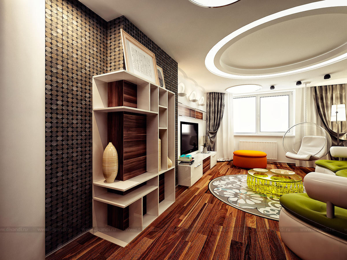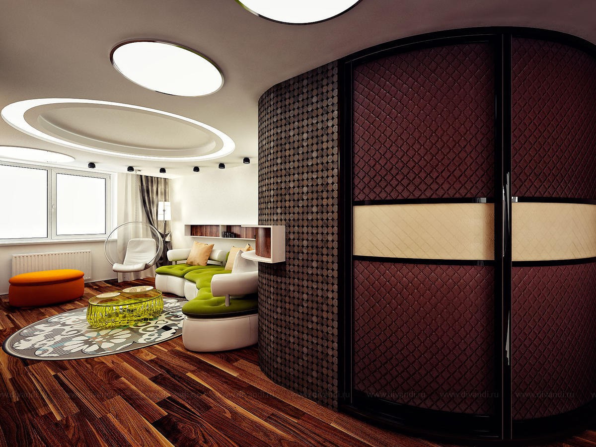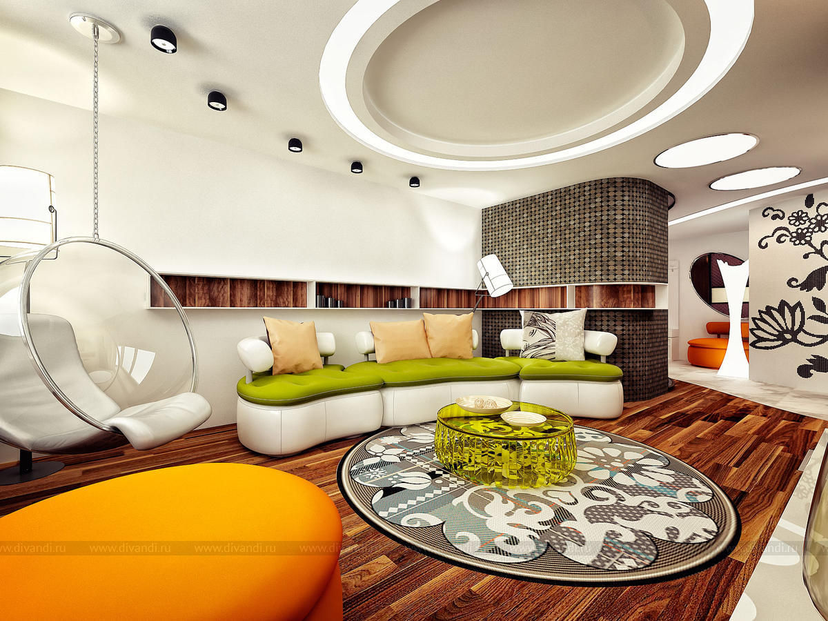 Гостиная в 4-х комнатной квартире, радиальные композиции и яркое на болом