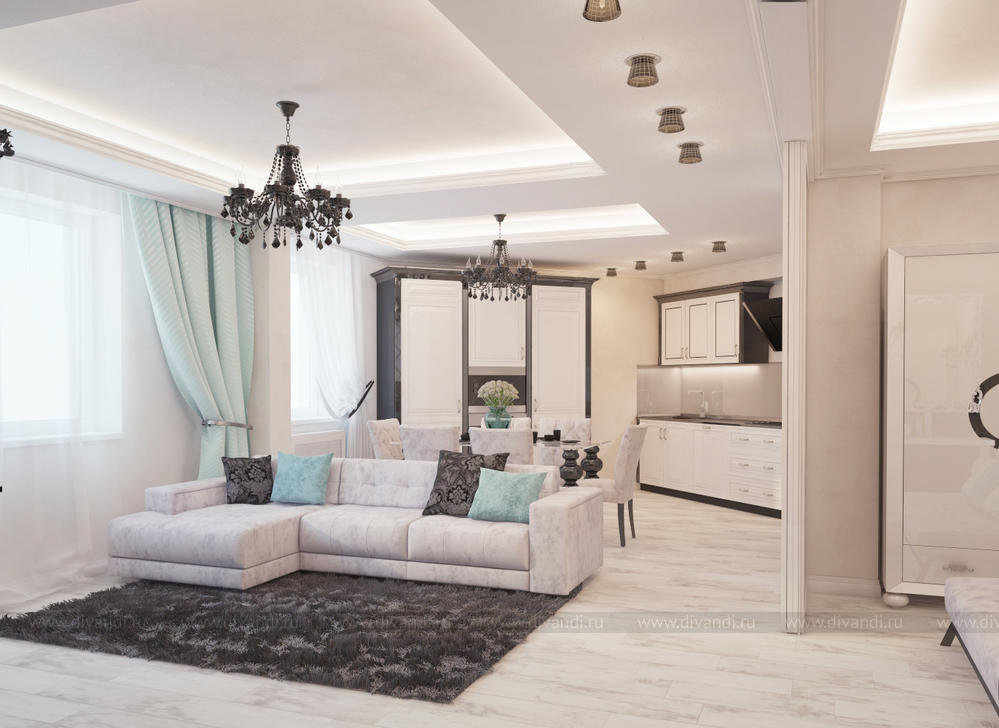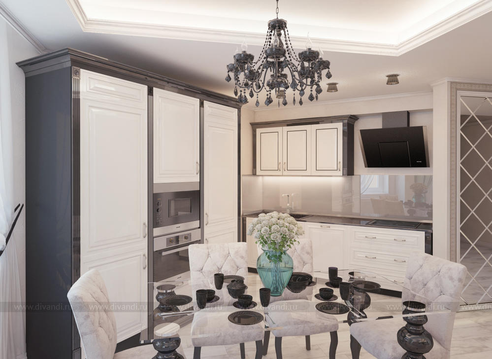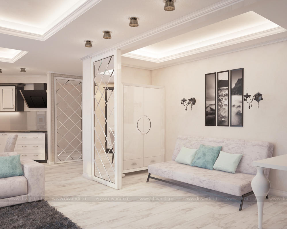 Гостиная может быть разделена на две комнаты при помощи зеркальной раздвижной перегородкой. Гостиная это единое пространство, а перегородка в закрытом виде выглядит как зеркало.В этой небольшой комнатке за перегородкой могут остановиться гости или уединиться любой из членов семьи. Тут же располагается кухня с большим обеденным столом. Изначально это были раздельные кухня и гостиная. Заказчикам очень хотелось большое и светлого пространства для большой семьи из 5 человек.