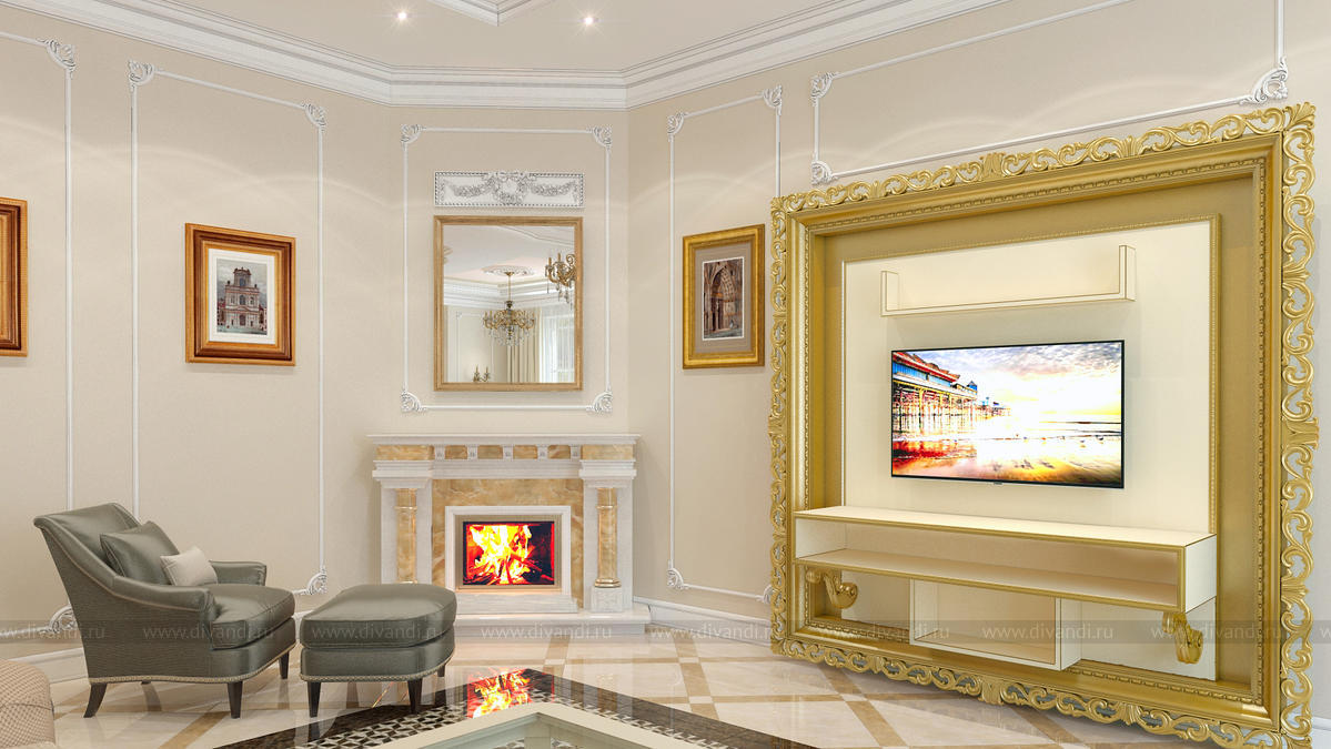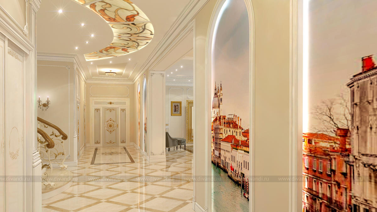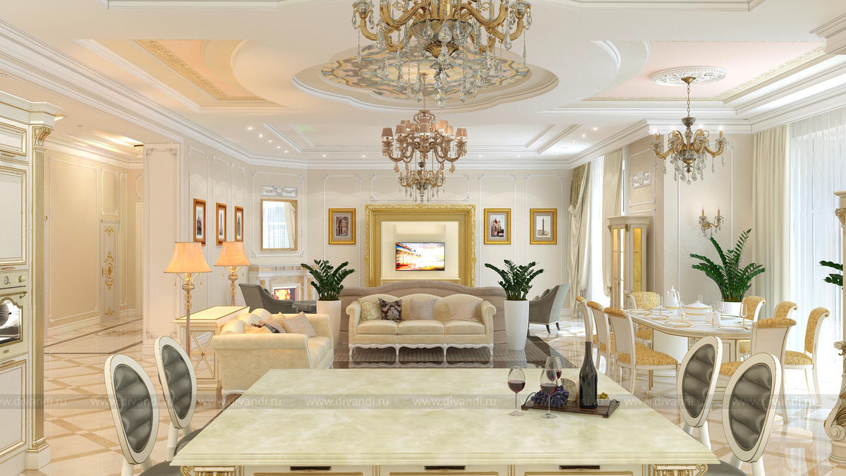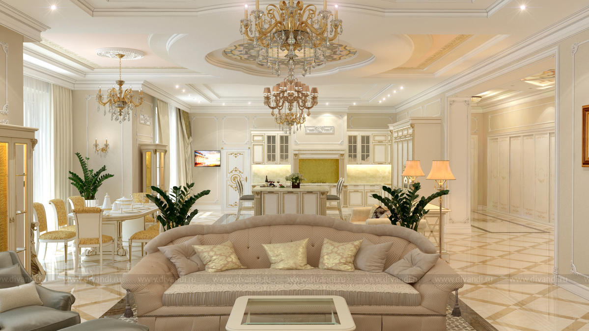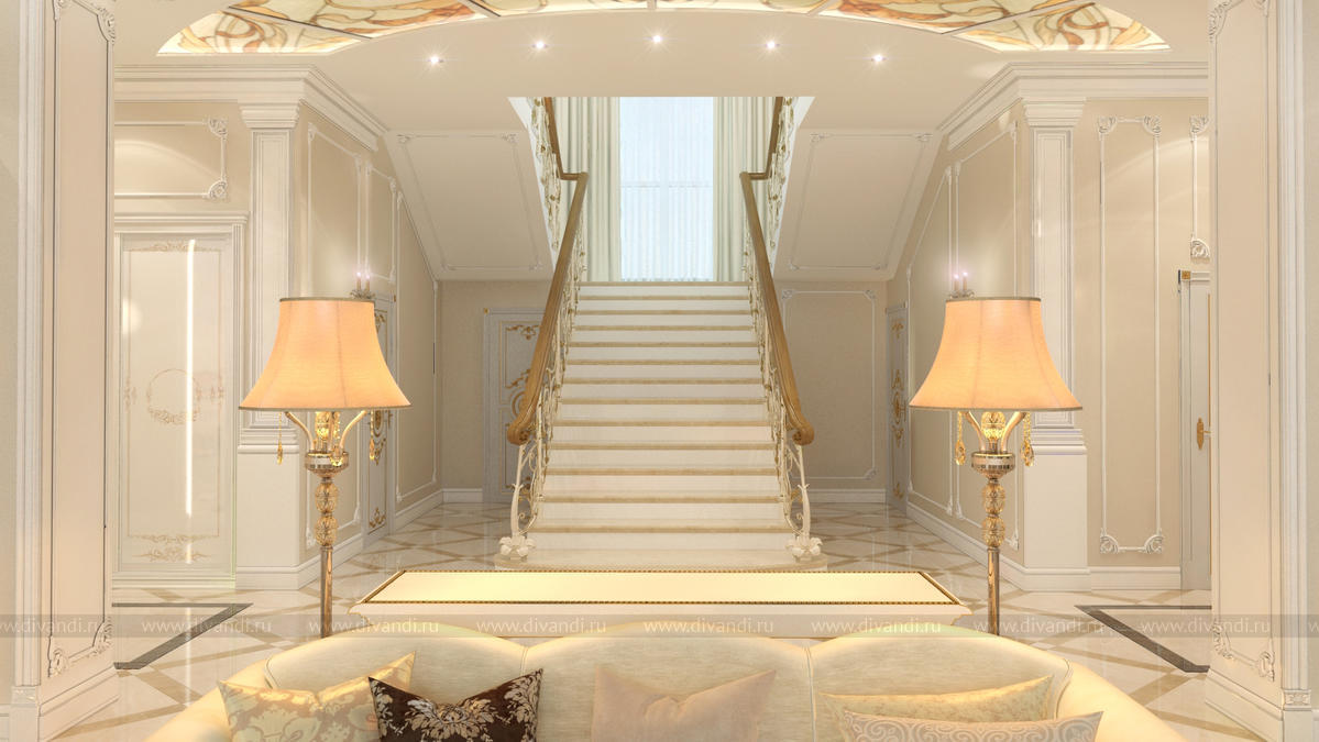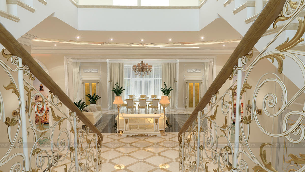 Первый этаж с лестничным холлом, столовой, кухней и гостиной в коттедж 850 кв.м.