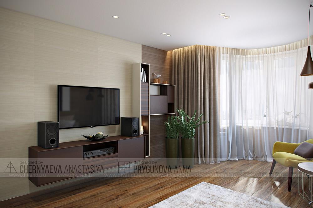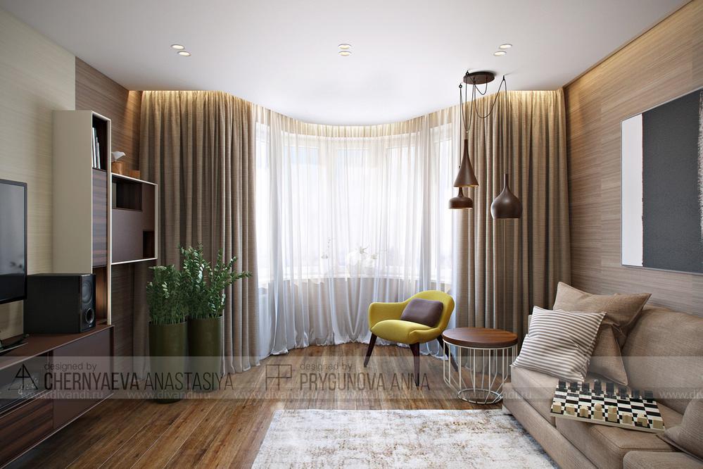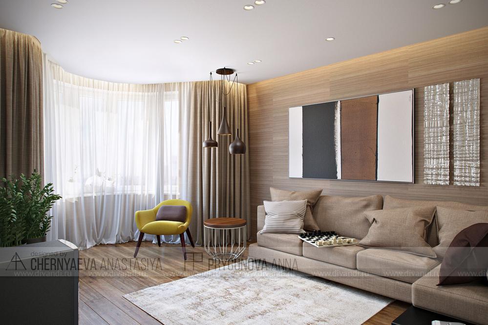 Гостиная выполненная в натуральных материалах. Простая и уютная. На стенах текстильные обои, на полу паркетная доска.
