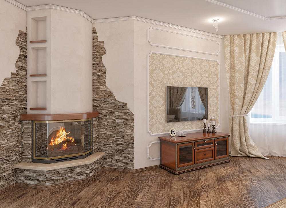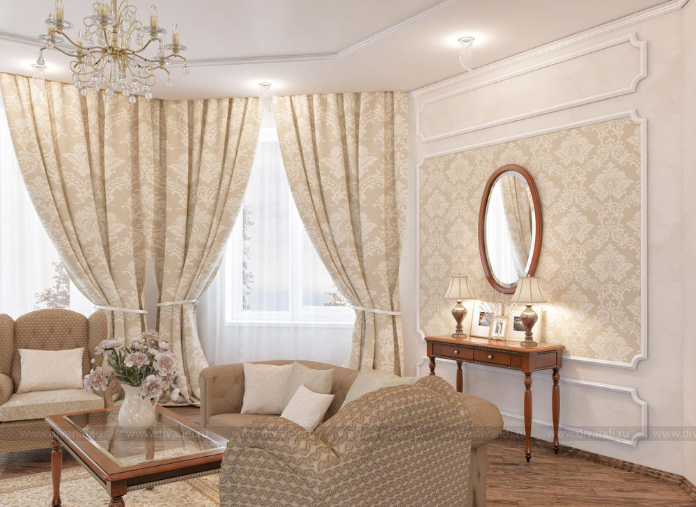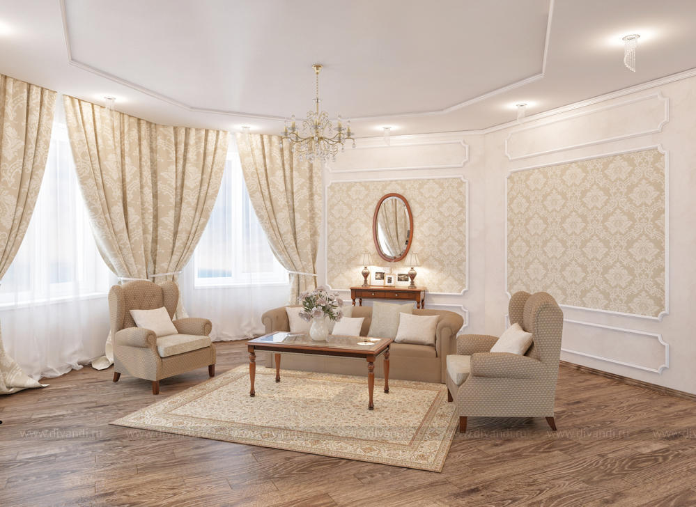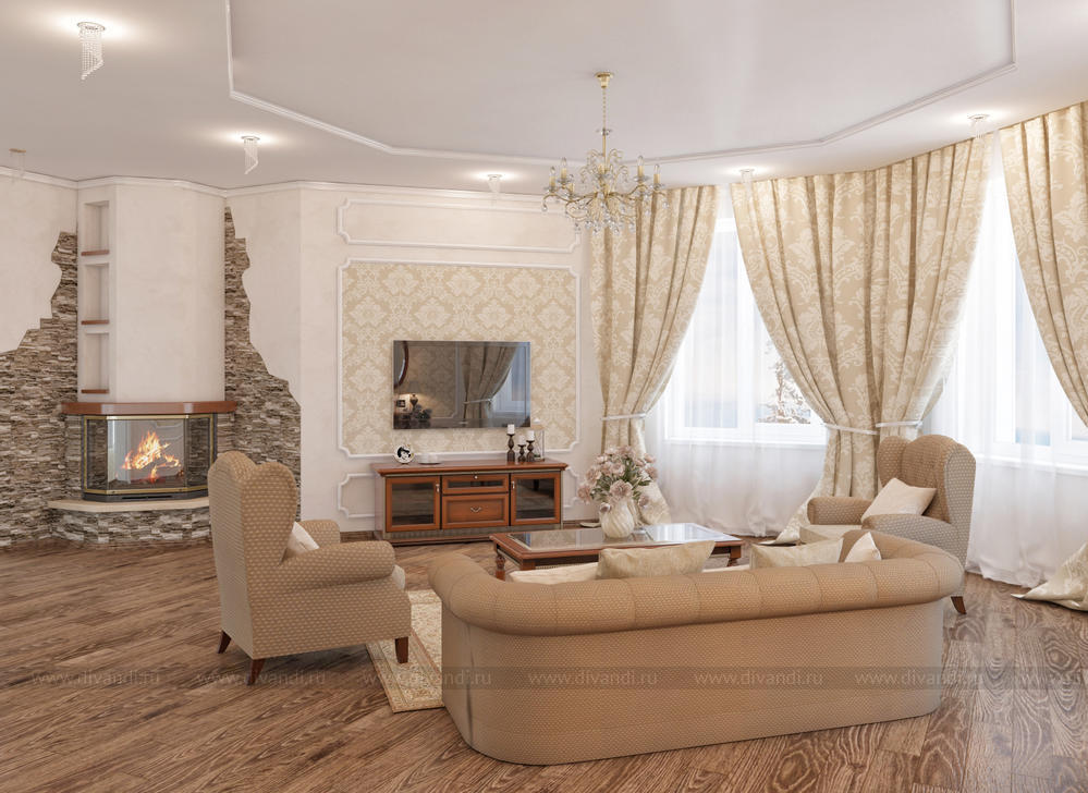 Гостиная в загородном доме выполнена в легком классическом стиле.