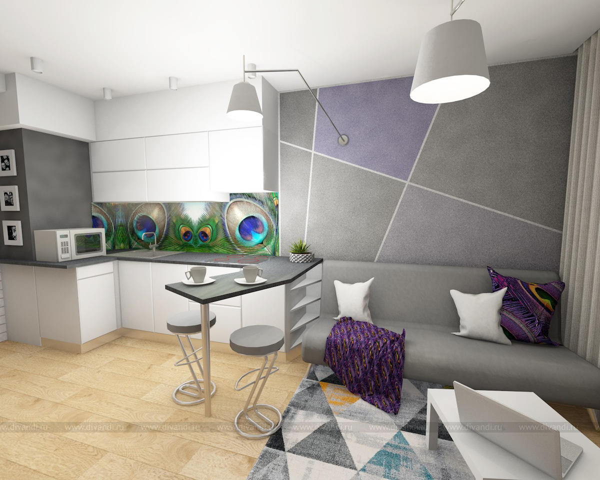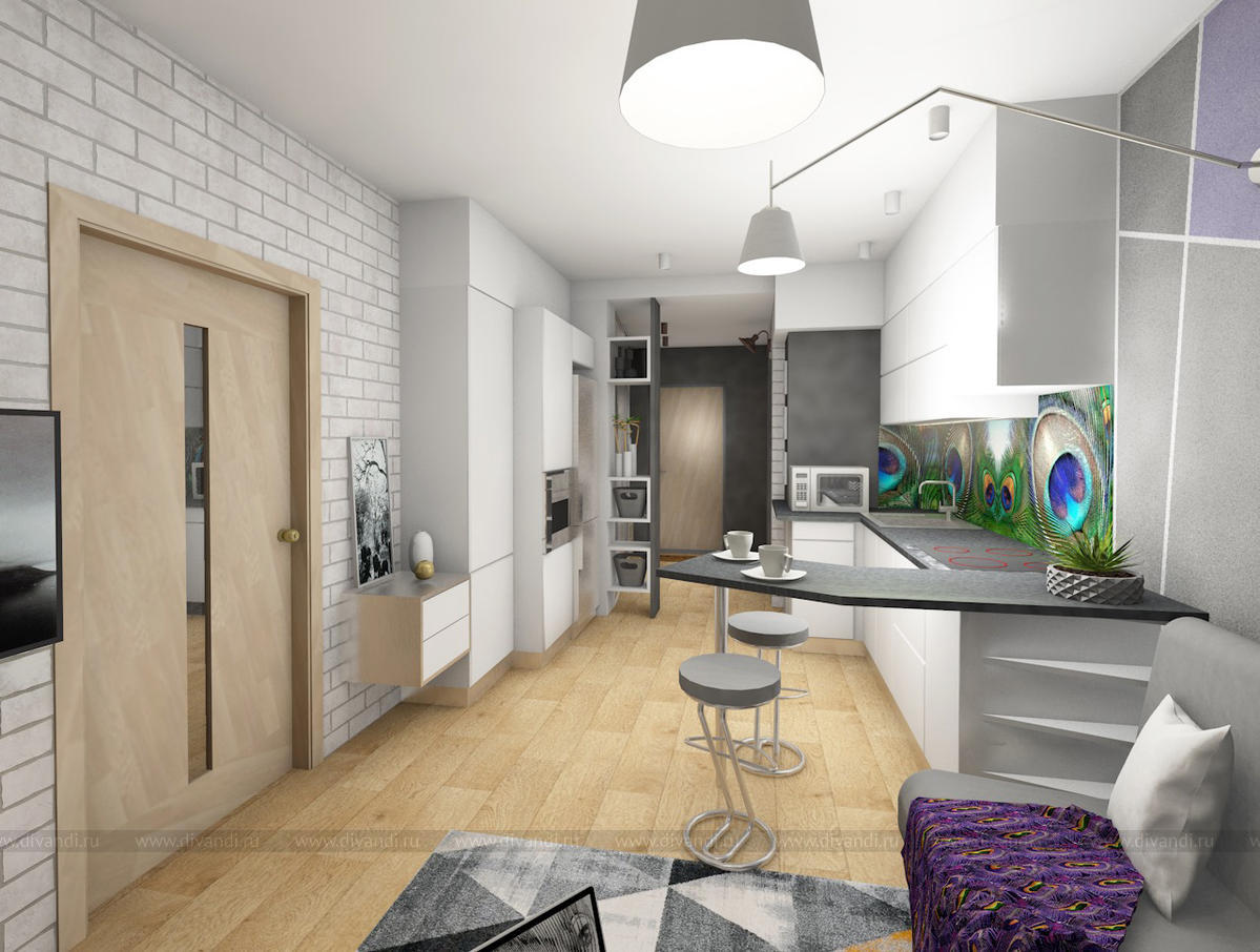 Пространство в квартира-студии разделено перегородкой - стеллажом. Функциональные полочки со стороны прихожей вмещают много хозяйственных мелочей.