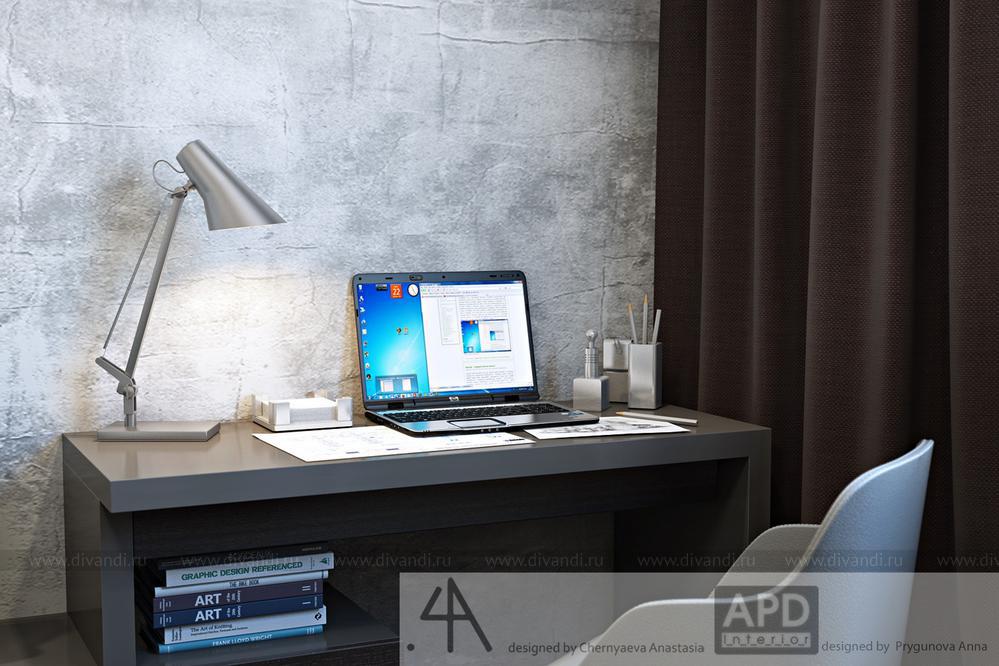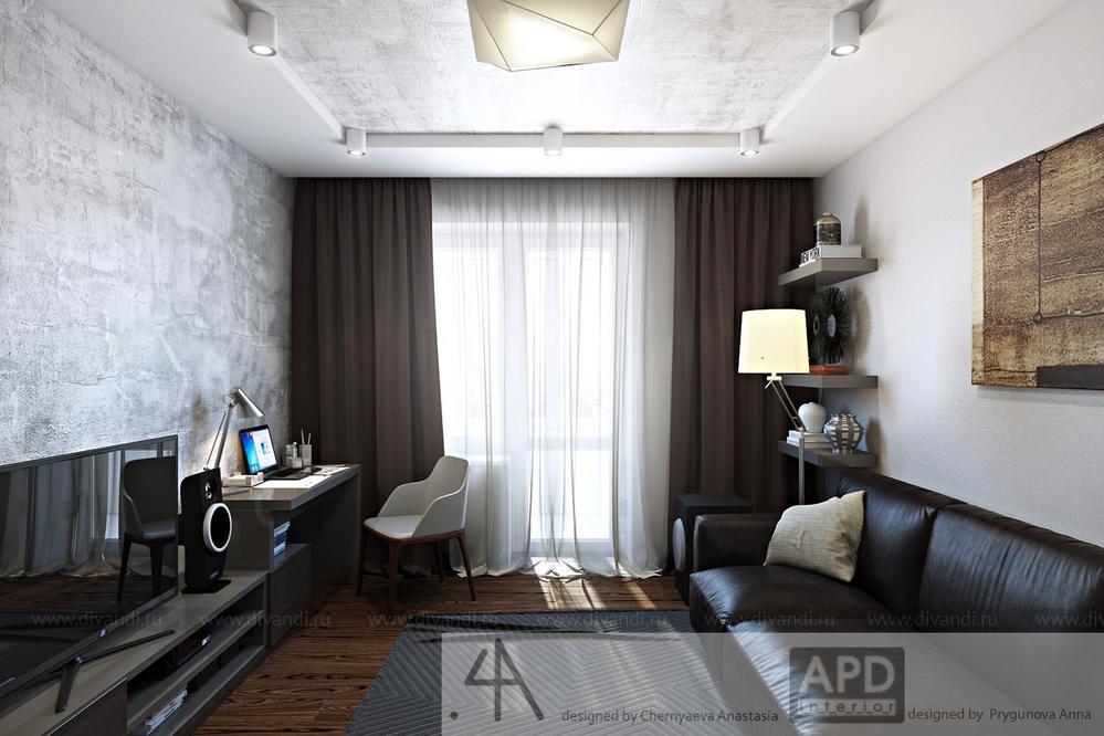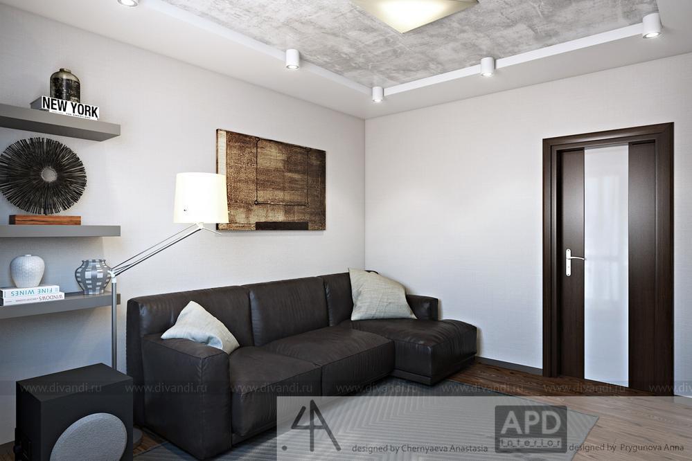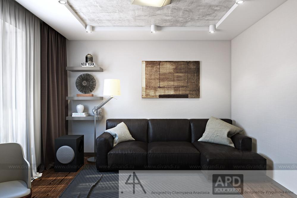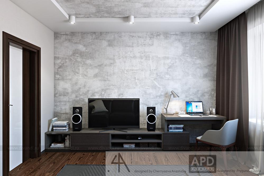 Небольшая современная гостиная в популярном стиле лофт. На потолке и стене за телевизором используется декоративная штукатурка под бетон, на остальных стенах сдержанные фоновые обои. Мебельная композиция изготавливается на заказ. Дизайнер Анна Прыгунова.