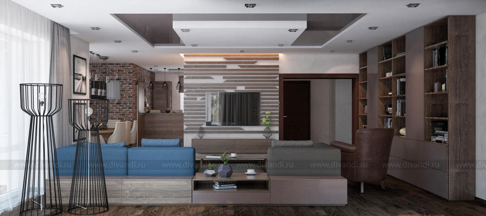 Гостиная в загородном доме выполнена в современном стиле с элементами лофта.