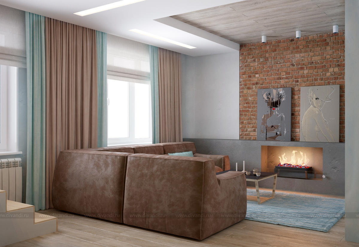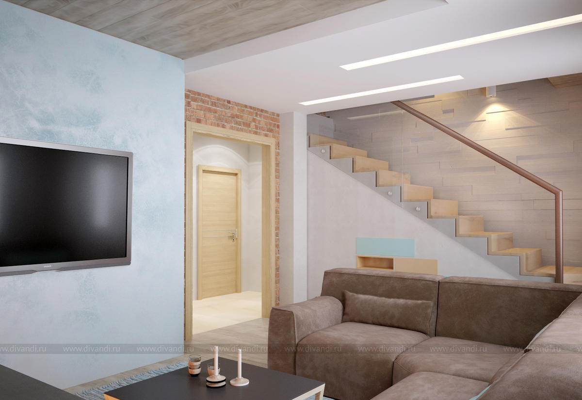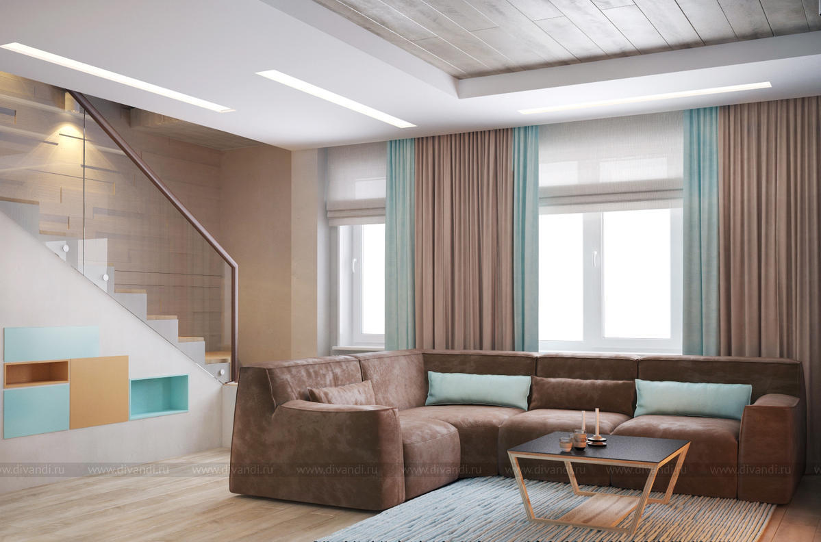 Функциональный, современный интерьер гостиной. Предпочтение светлым, спокойным тонам и экологичным материалам.