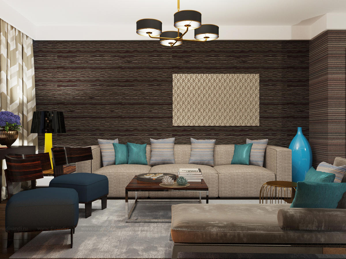 Дизайн интерьера гостиной в стиле 60-х с камином.