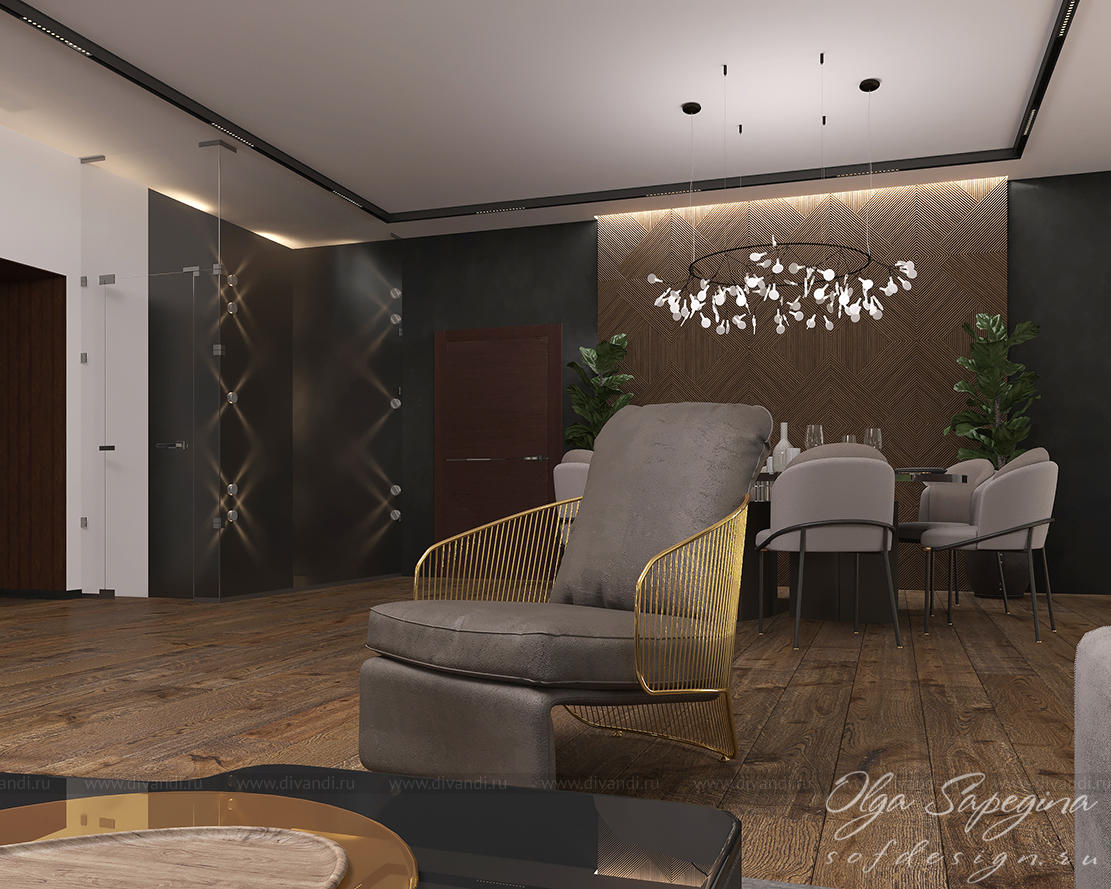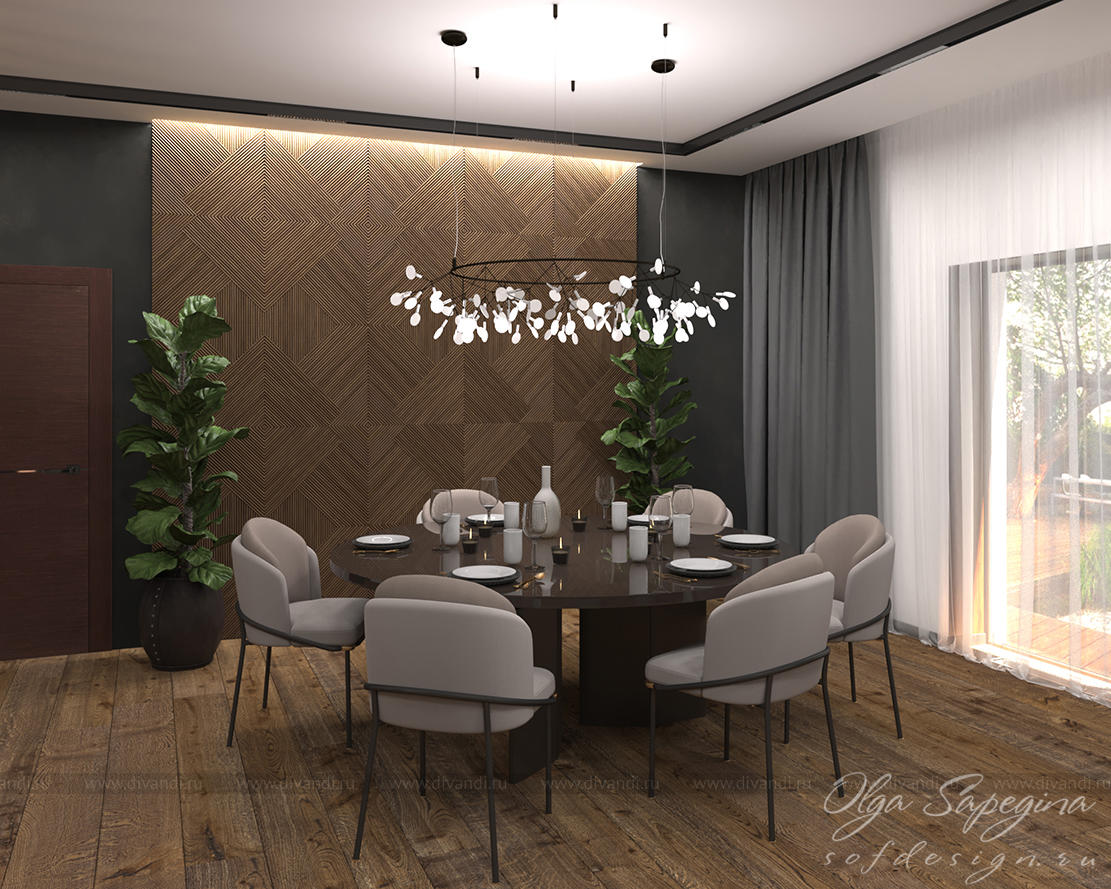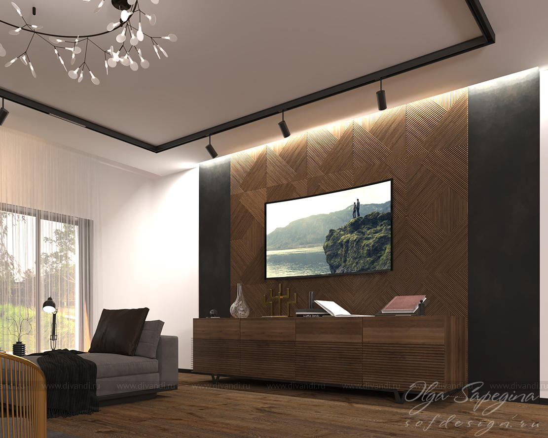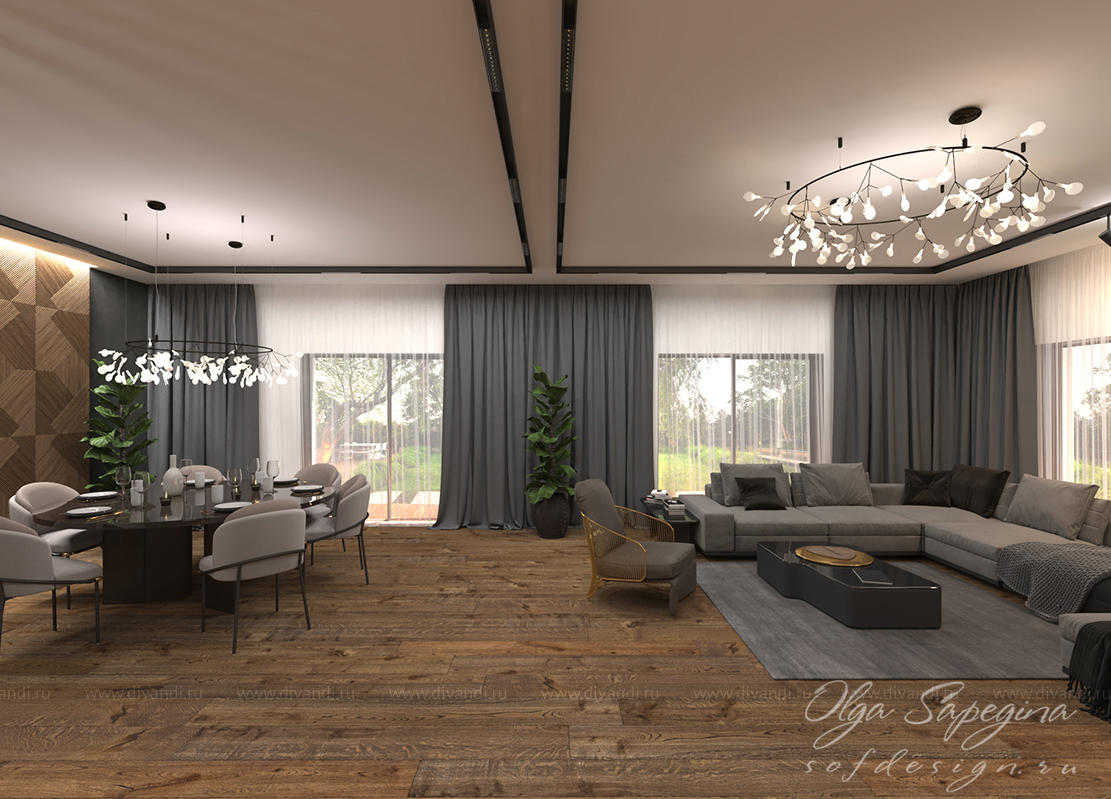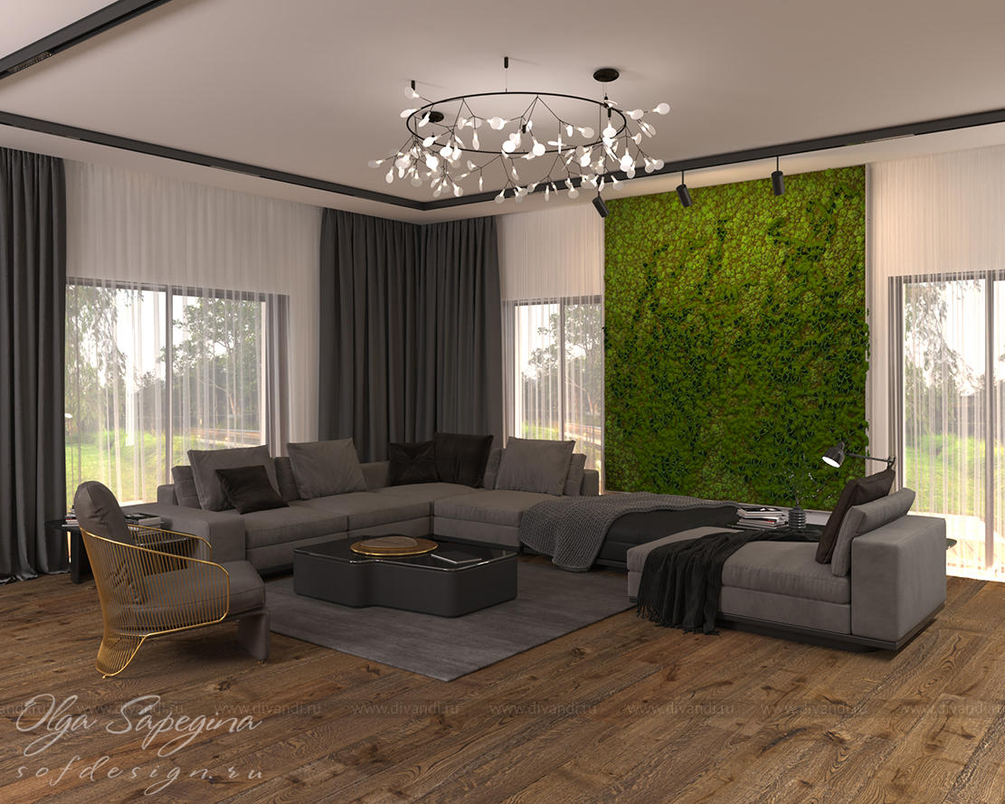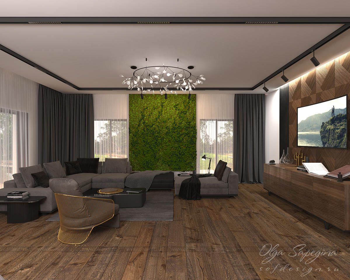 Гостиная в загородном доме. В проекте максимально использовались натуральные материалы и фактуры: дерево, сланец, стабилизированные растения.