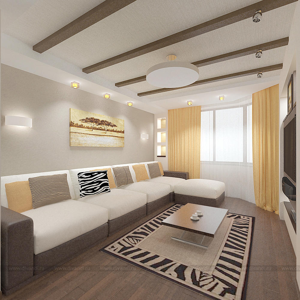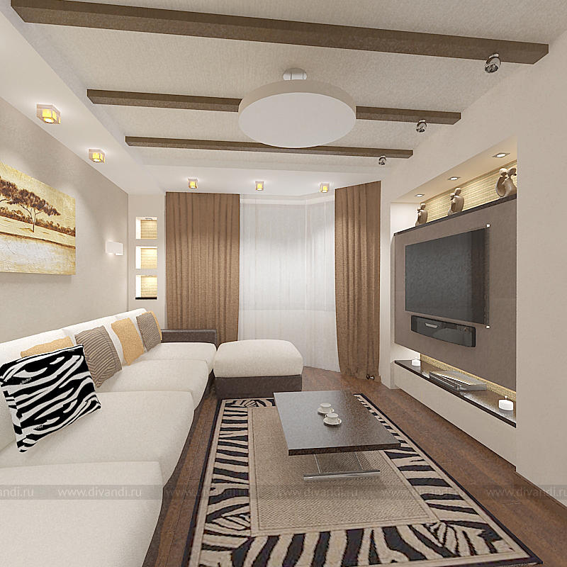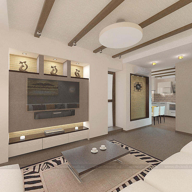 Гостиная решена достаточно лаконично и функционально в естественных природных оттенках с акцентом на деталях.