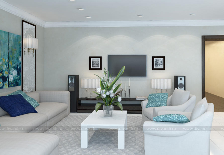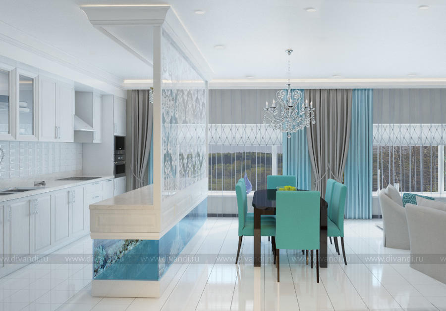 Современна гостиная с элементами классики и арт-деко. Светлое объемное пространство разбавленное контрастными элементами и цветовыми акцентами. За декоративной стеклянной перегородкой расположилась белая кухня-невидимка.