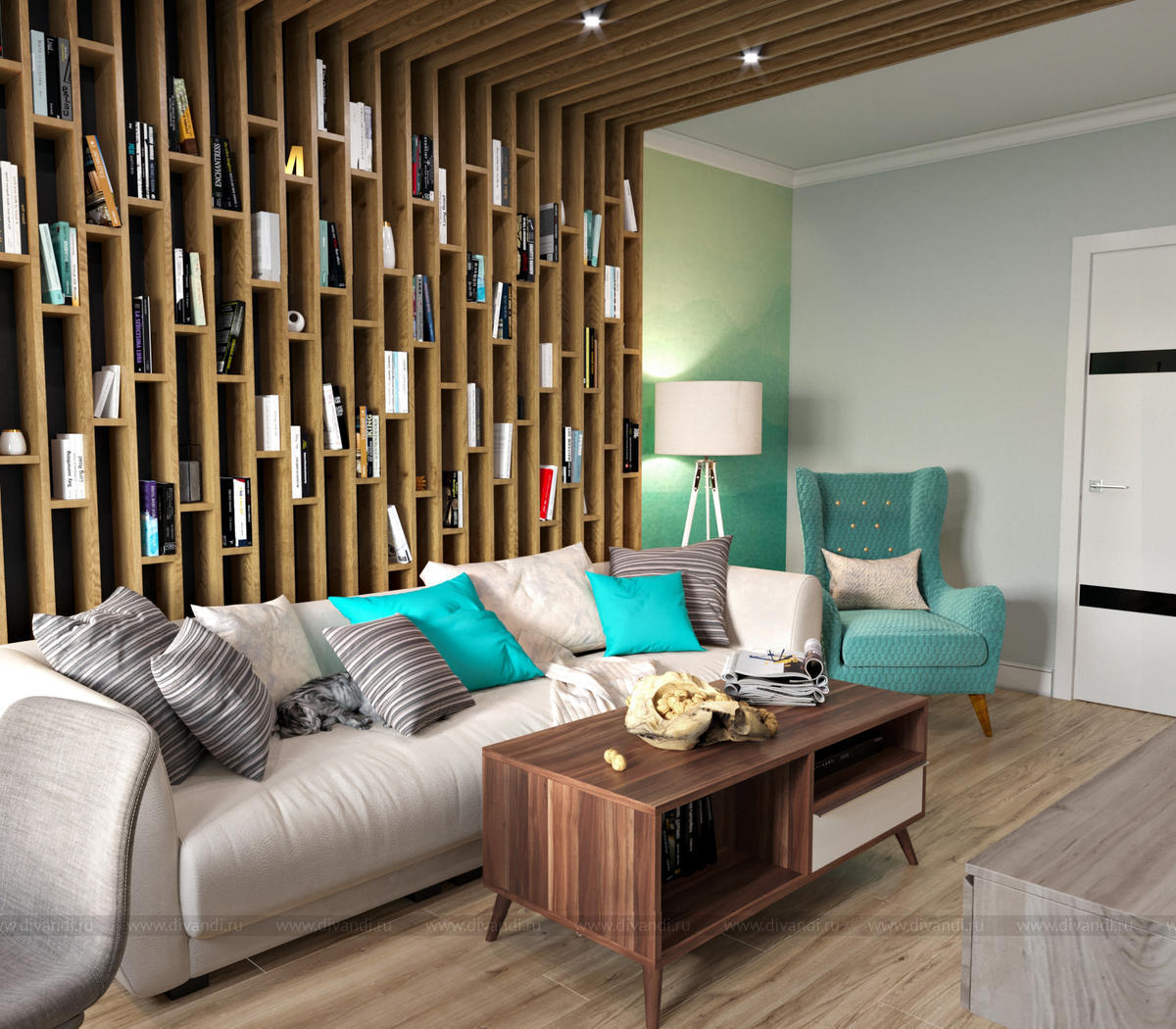 Гостиная в ЖК Первый Николаевский Интересная особенность проекта: стеллаж переходящий со стены на потолок.