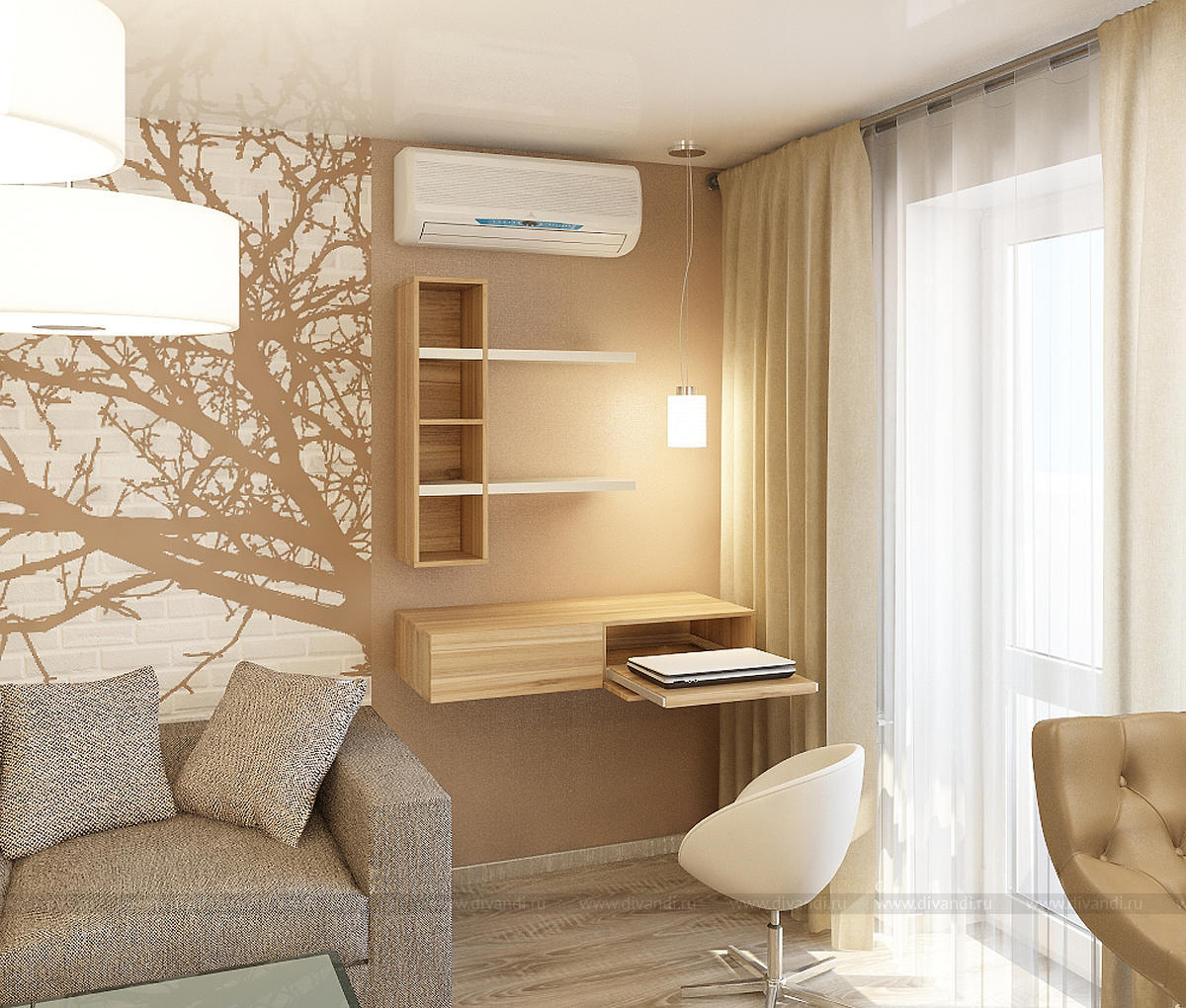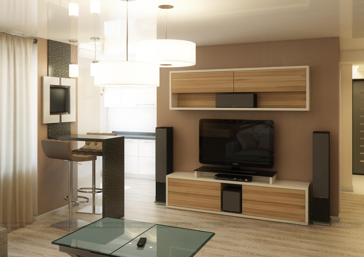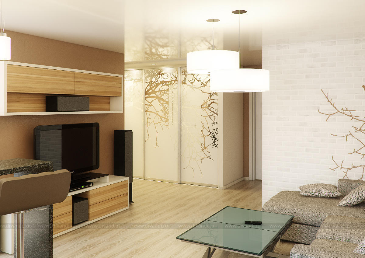 Выразительный рисунок дерева, выполненный на стене гостиной, находит отклик в оформление стеклянных дверей шкафа-купе в прихожей. Природные цвета отделки стен, полов и мебели гармонизируют пространство, делают его цельным и теплым. Выполненный в стилистике минимализма, интерьер отражает характер и динамичный ритм жизни хозяев: минимум мебели, высокая барная стойка вместо обеденного стола.