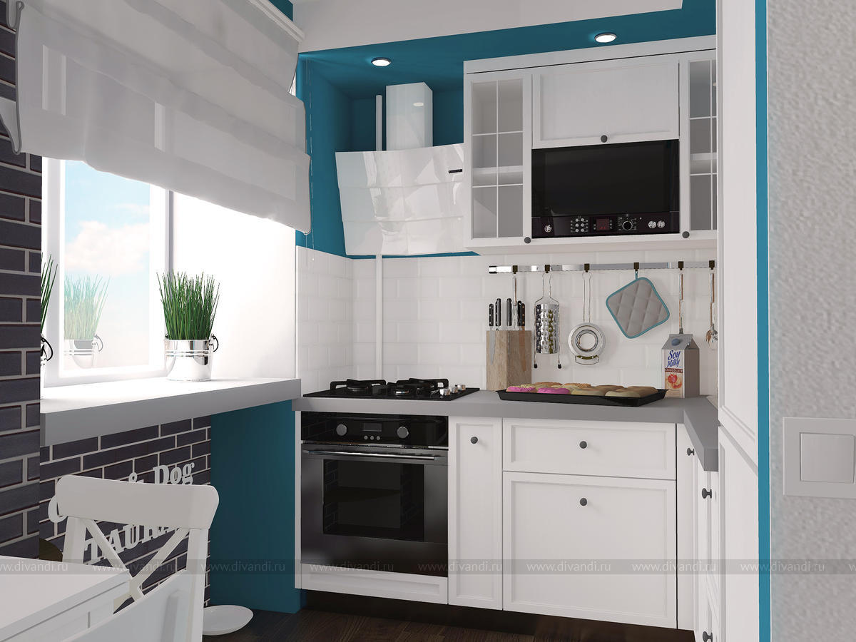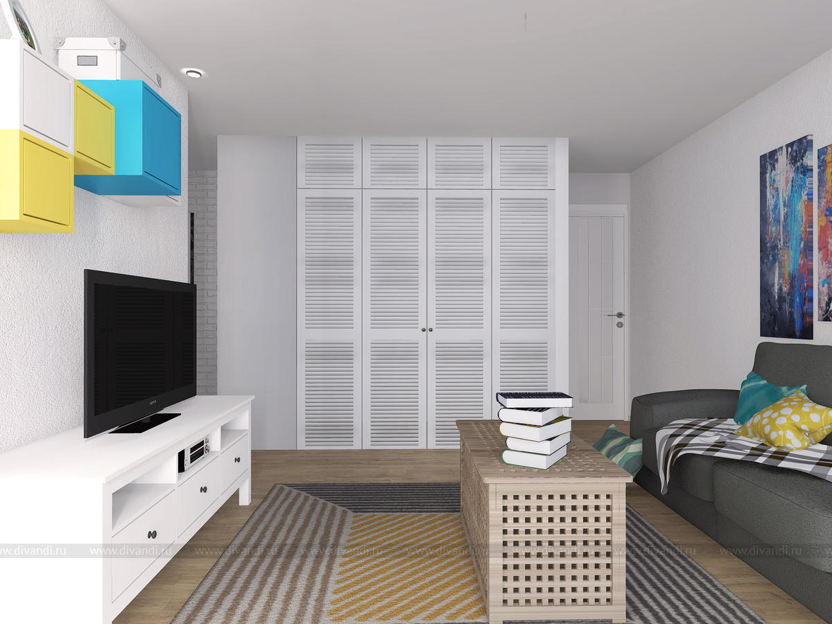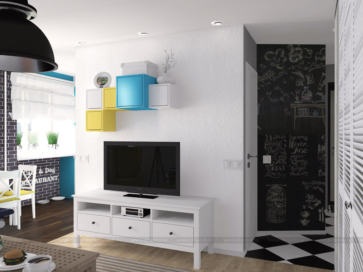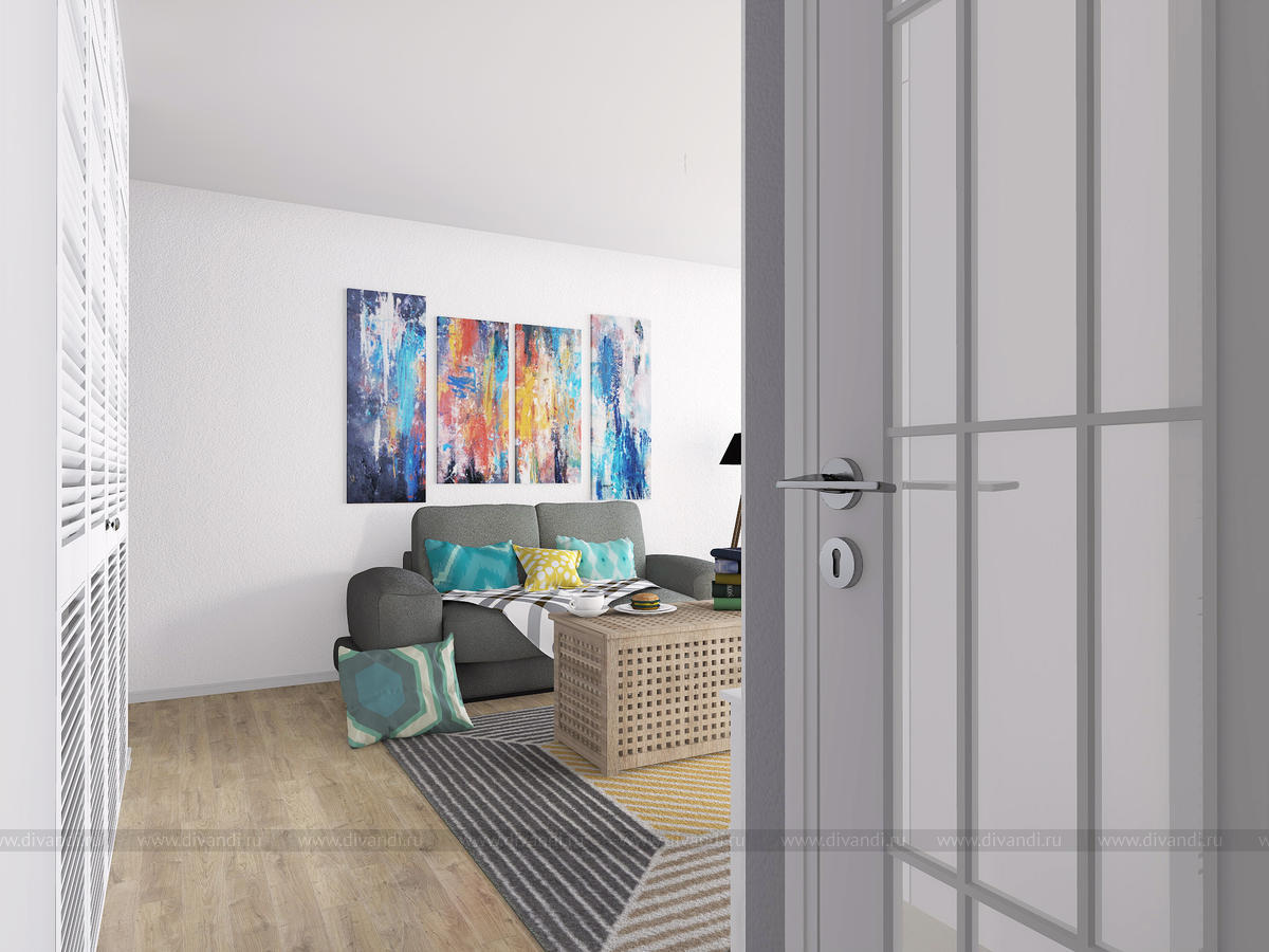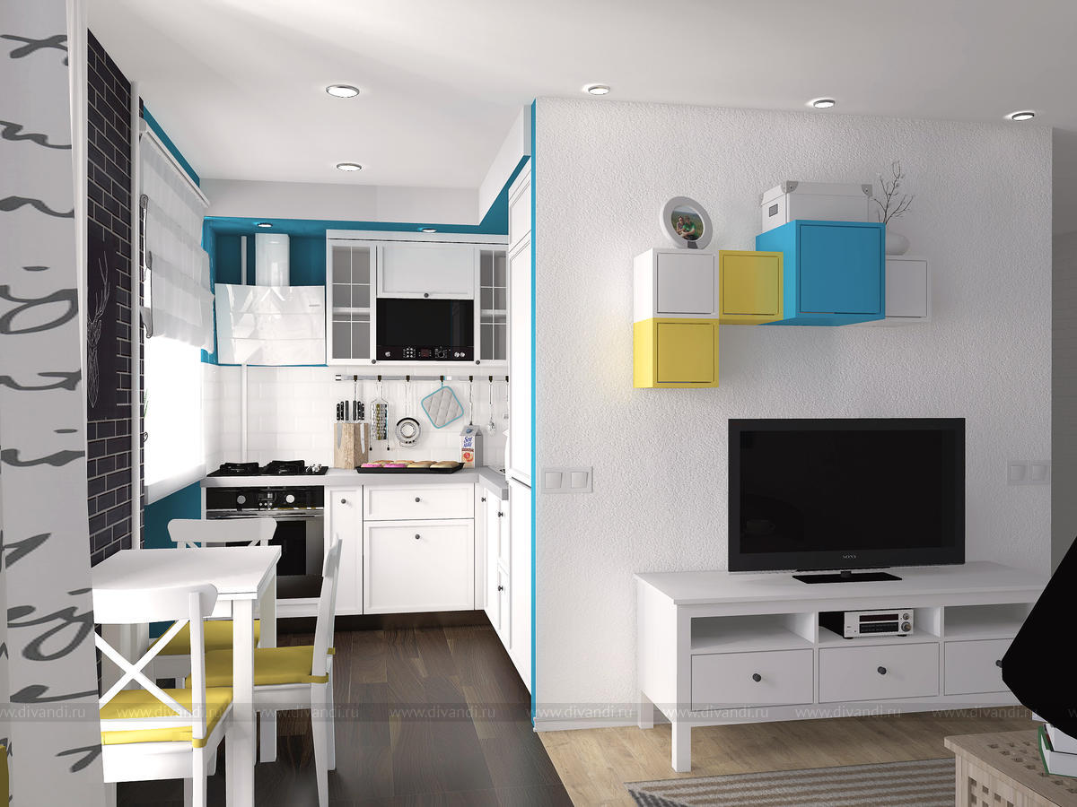 Гостиная зона и зона кухни в двухкомнатной "хрущевке" для молодой пары. Интерьер квартиры в скандинавском стиле