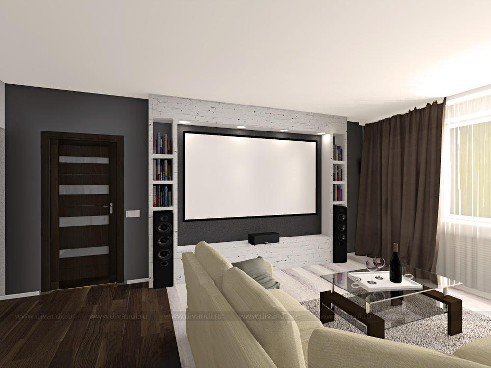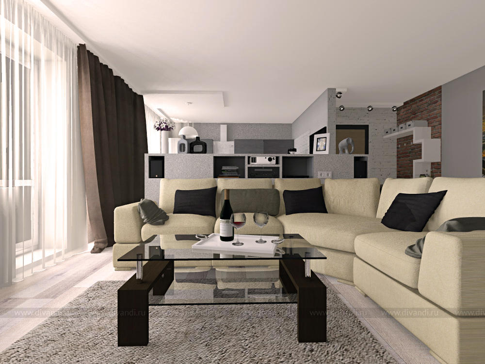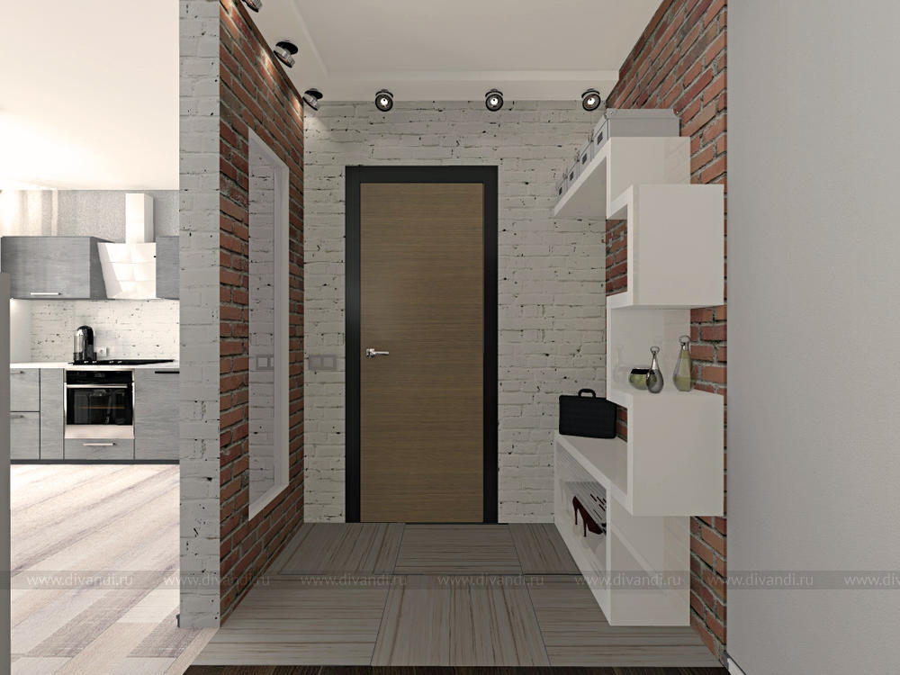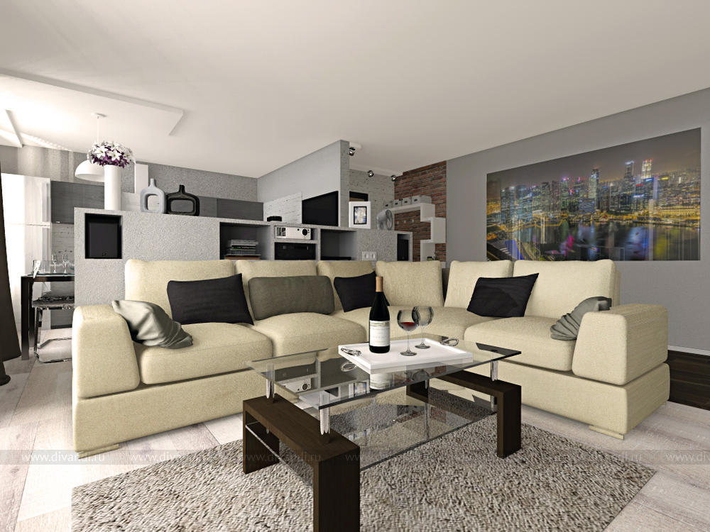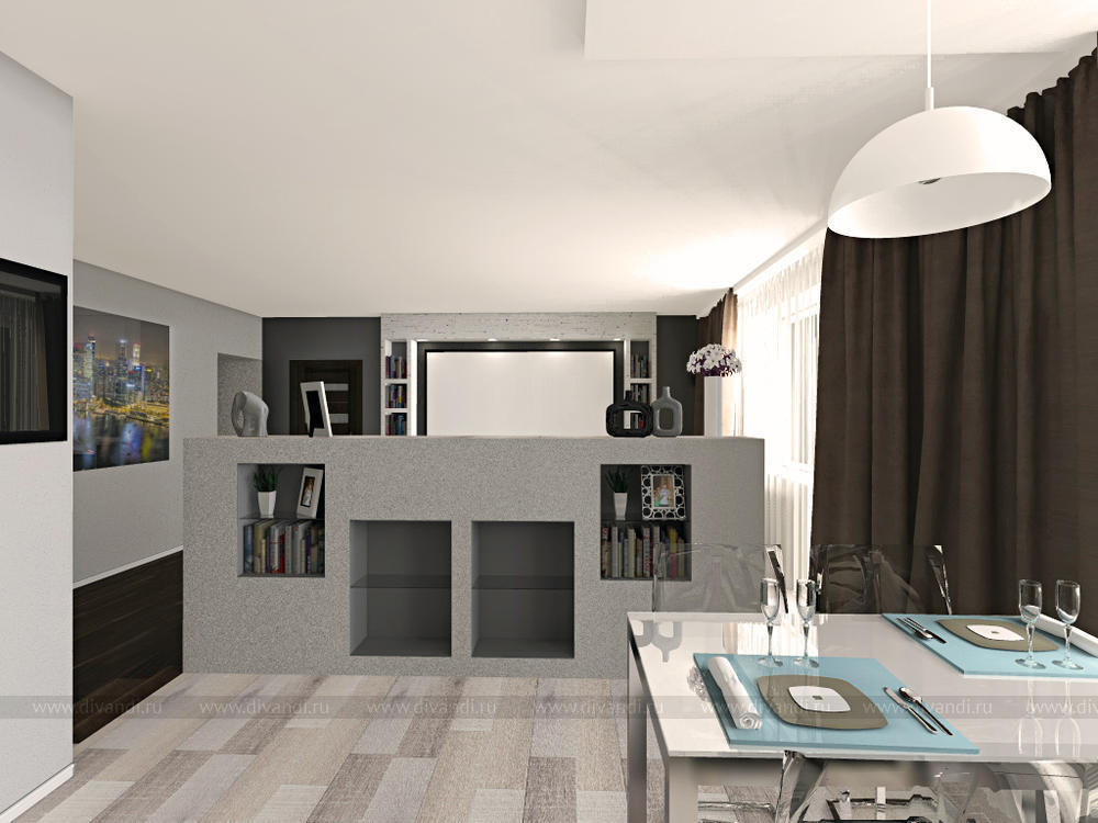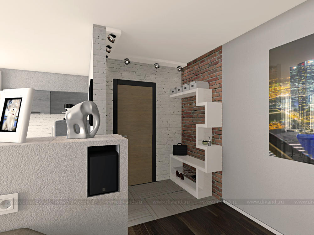 Гостиная/кухня/прихожая в трехкомнатной квартире для молодой пары