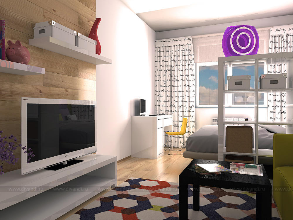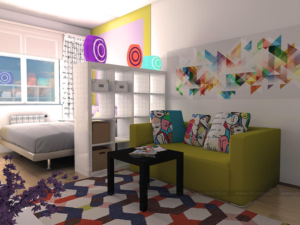 Так как квартира однокомнатная-комната разделена на зоны гостиной, спальни и рабочую зону.