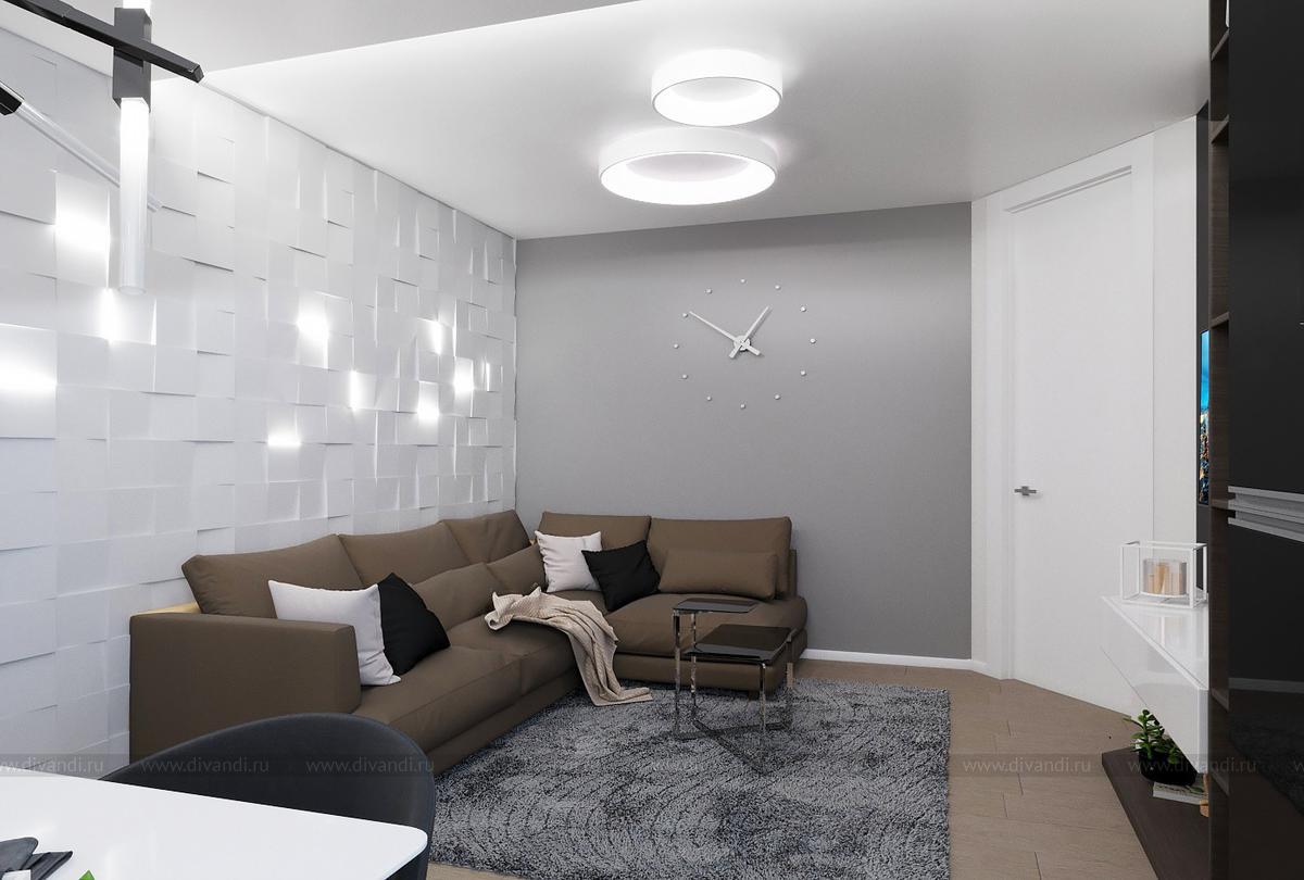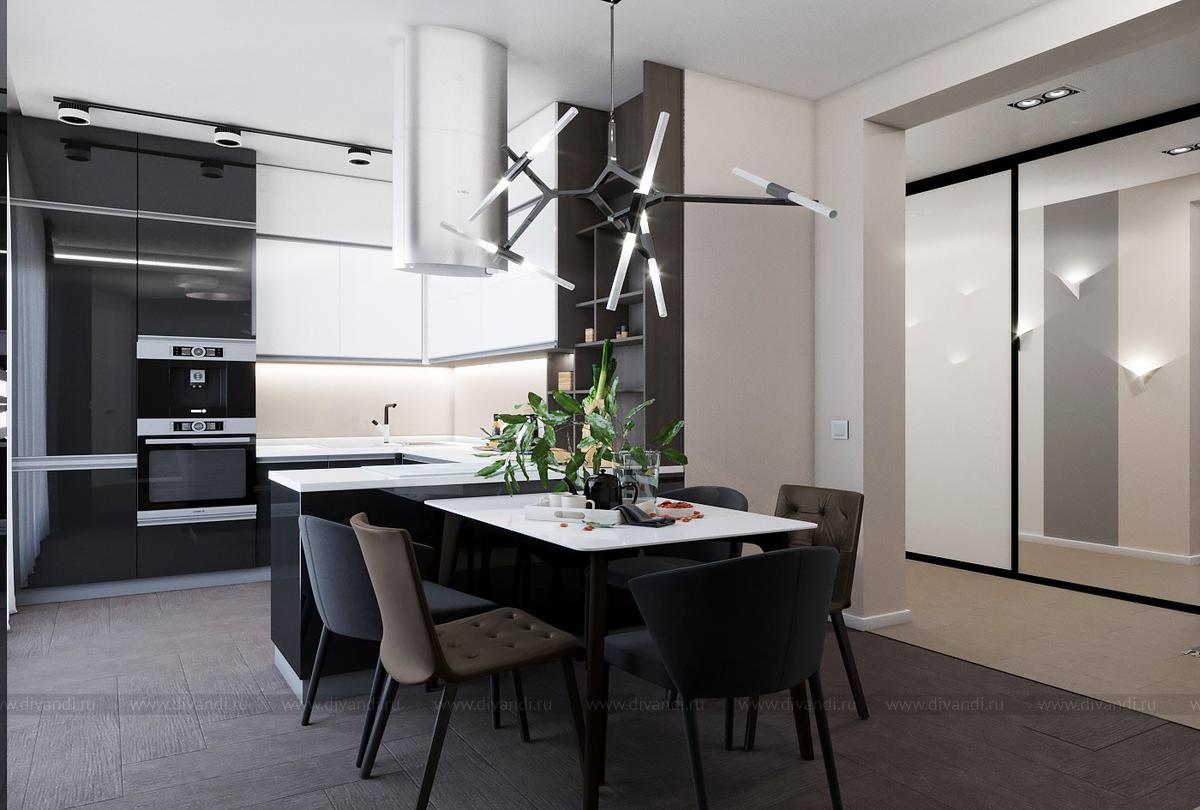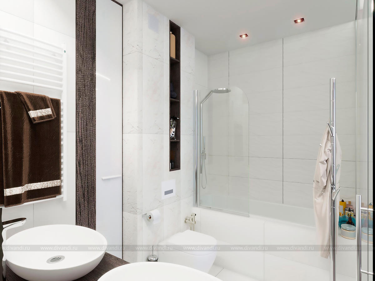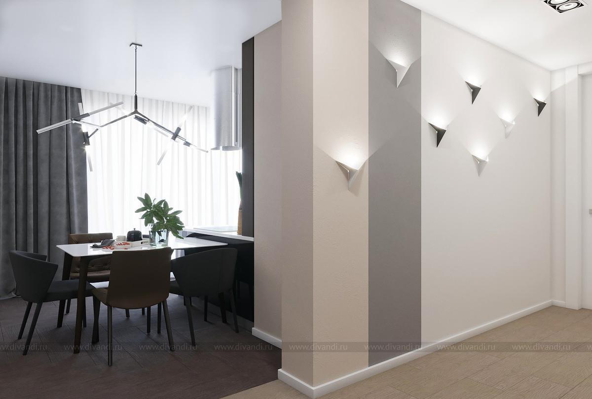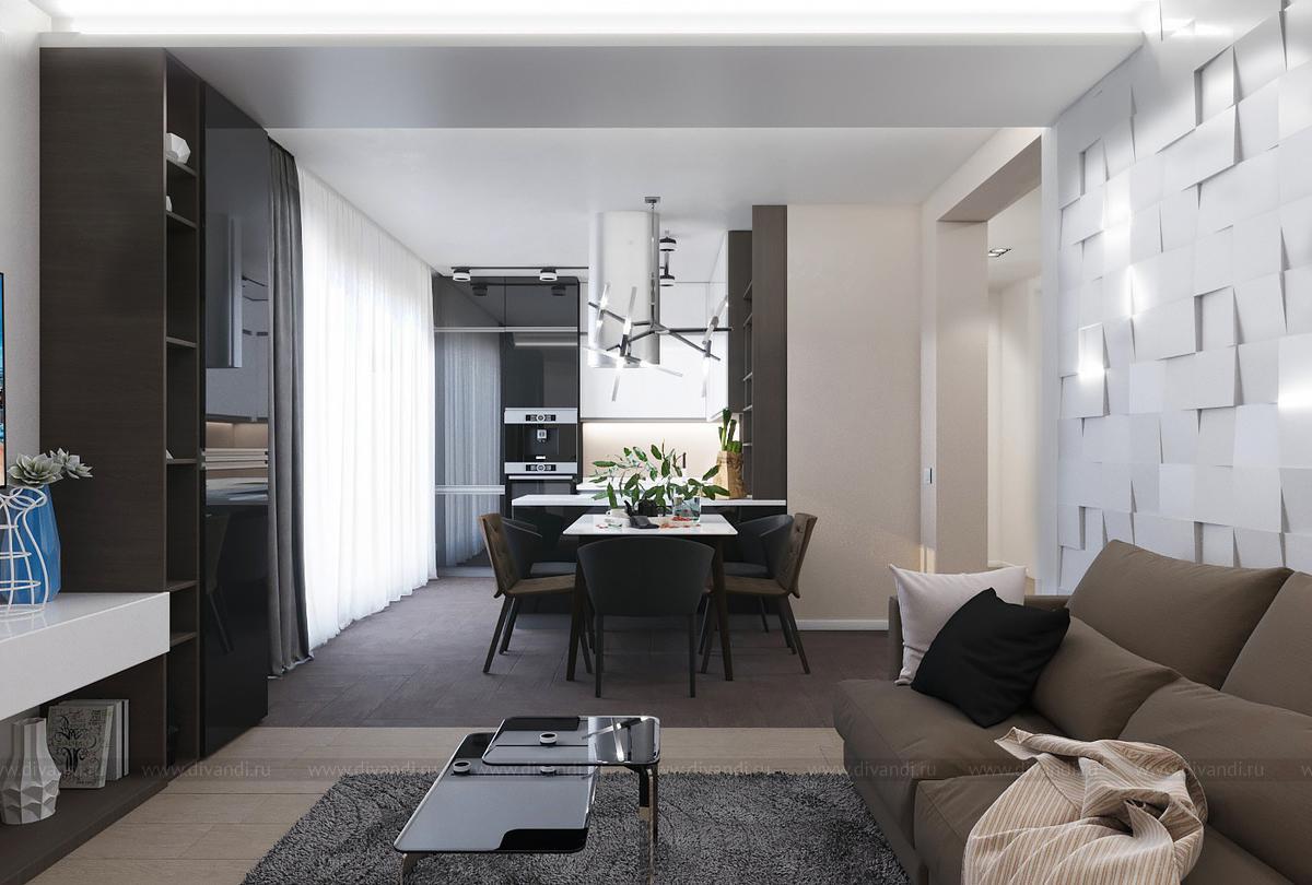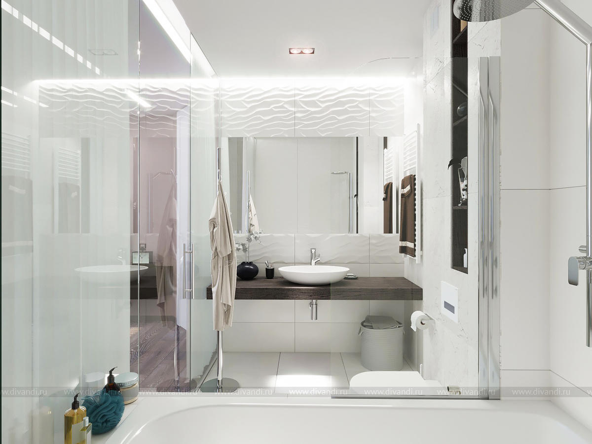 Проект выполнен в современном стиле, в спальне была выбрана планировка "гостиничного номера" со стеклянными стенами ванной комнаты. Проходной коридор объединили с кухней, получив общее пространство кухни-столовой с гостиной зоной, а небольшой балкончик заменила складная теплая дверь-перегородка, позволяя летом наслаждаться широким проходом на террасу. Интересен проект получился и в плане оформления - это и 3Д панели со встроенными светильниками, деревянные рейки и мягкие панели, и керамогранит в санузлах Итальянских и Испанских производителей.