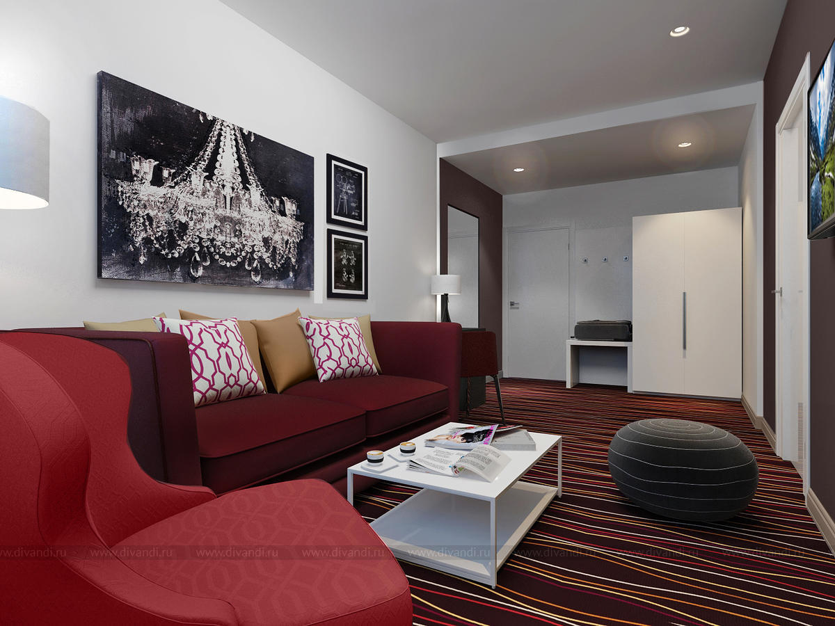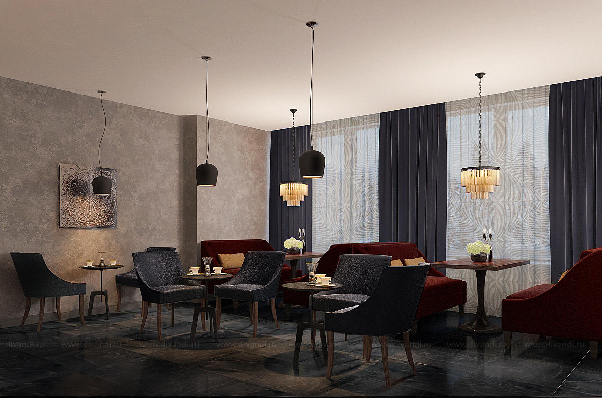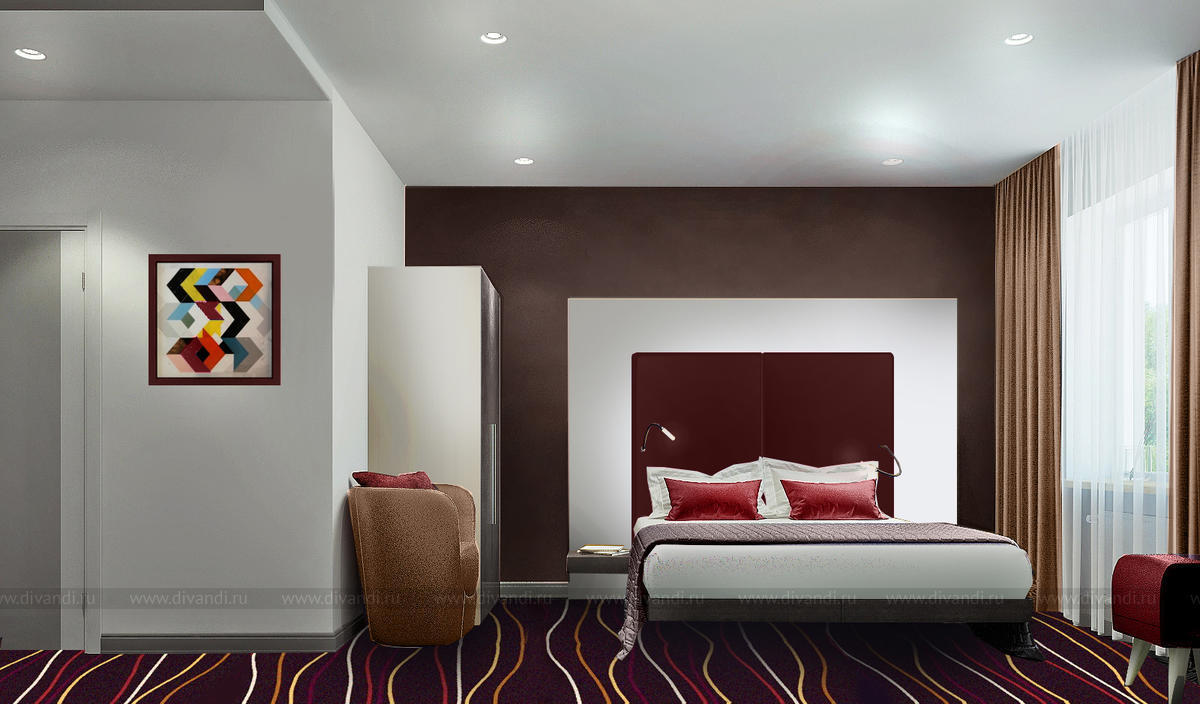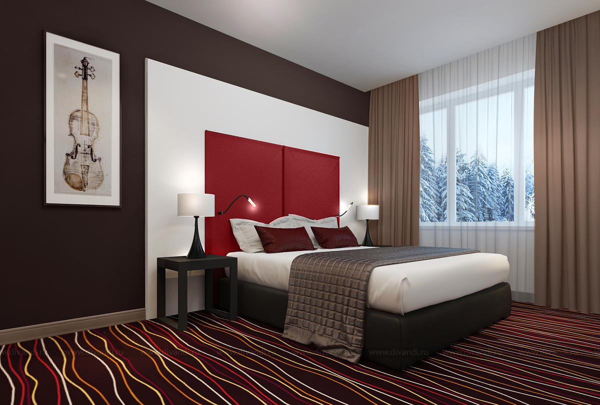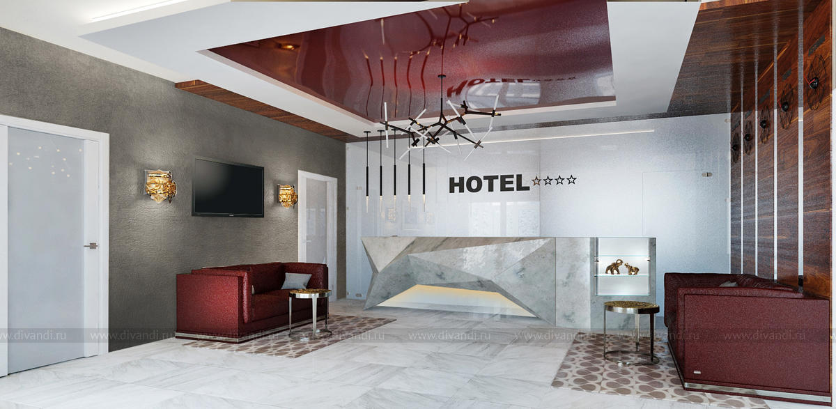 Гостиница 4****. Гостиницу проектировали в соответсвии с нормами и стандартами, поэтому выбор многих материалов отделки был обусловлен этими требованиями. Номерной фонд отеля 22 штуки, есть тренажерный зал, банкетный, обеденный и конференц залы.Также комната переговоров. Номера от одноместных стандартов до джуниор сьютов. Для релакса в отеле предусмотрен каминный зал. Отель спроектирован в современном стиле, цветовые решения достаточно контрасные.Работа над проектом шла долго, но интересно.