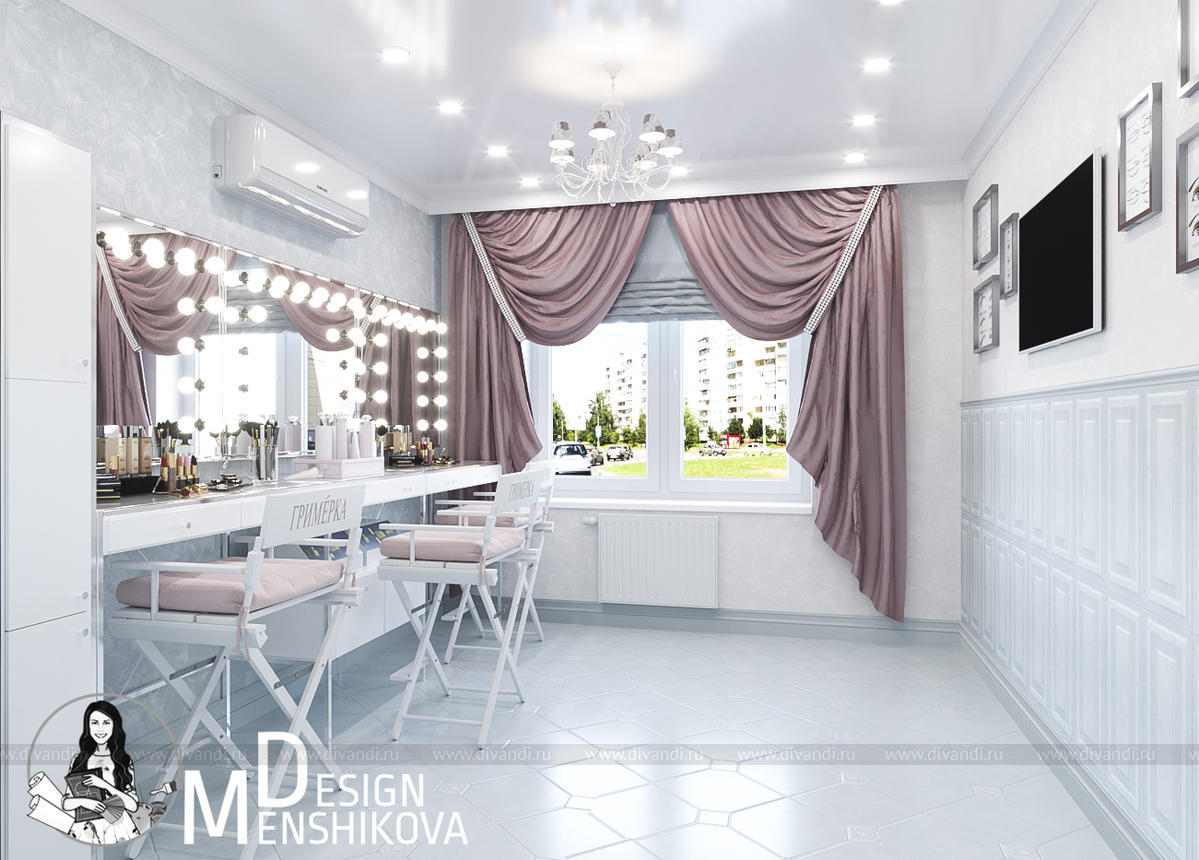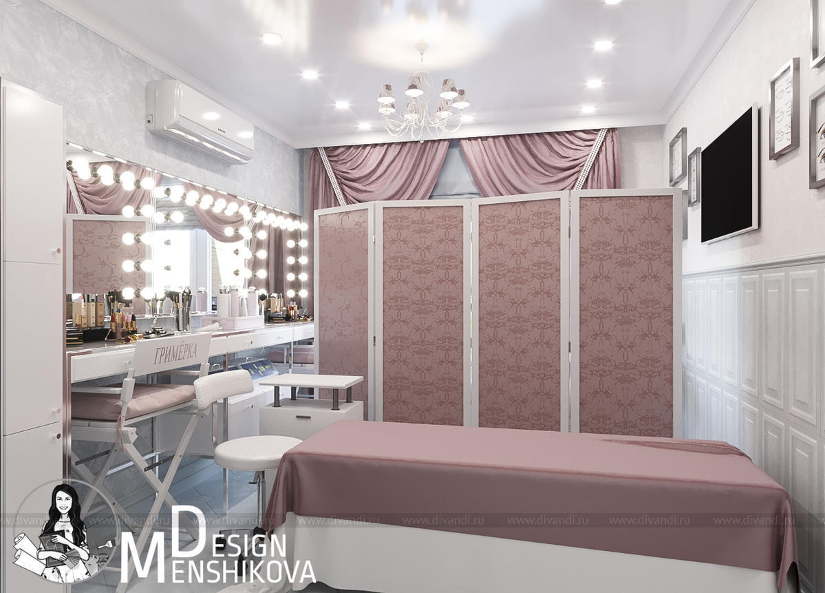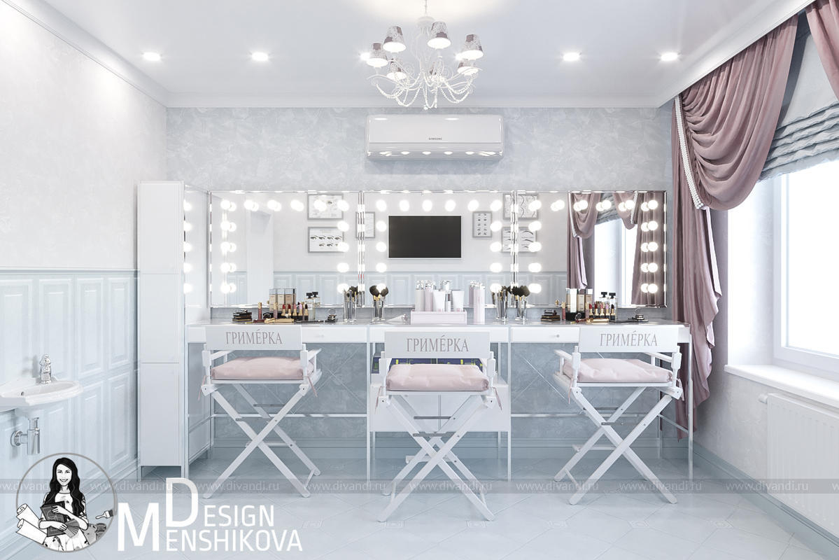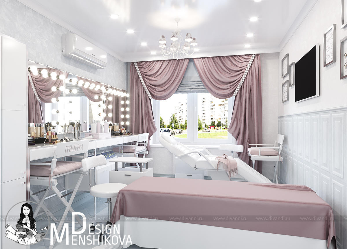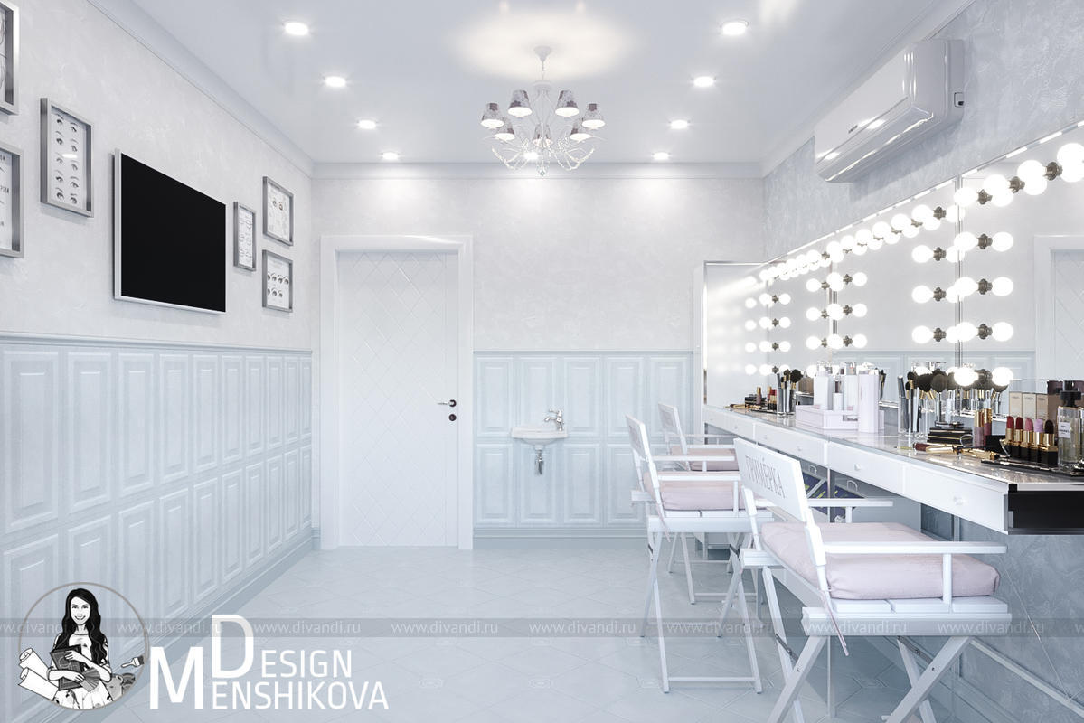 На эскизах представлен зал лектория и перманентного макияжа. Помещение легко трансформируется в лекторий так как в студии красоты можно пройти обучение.