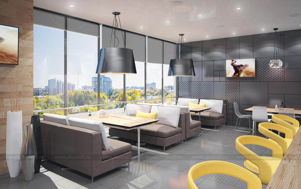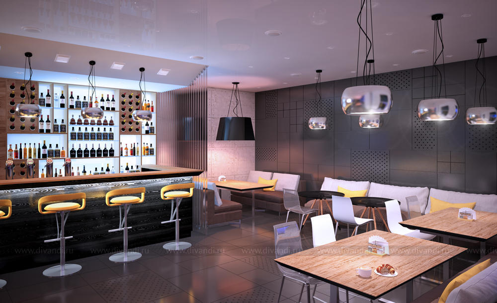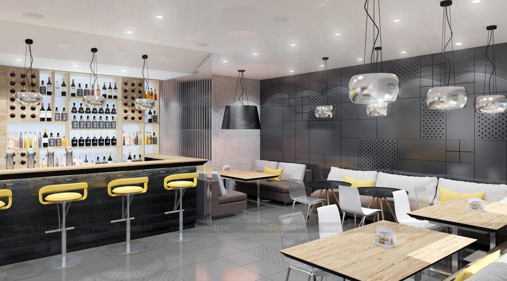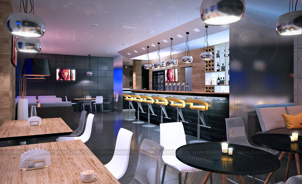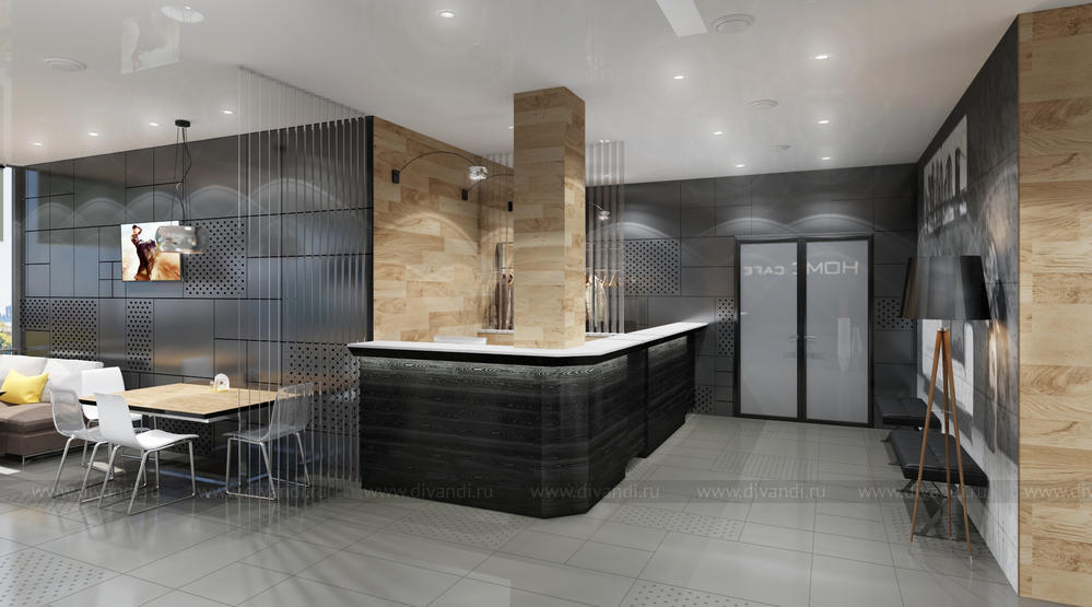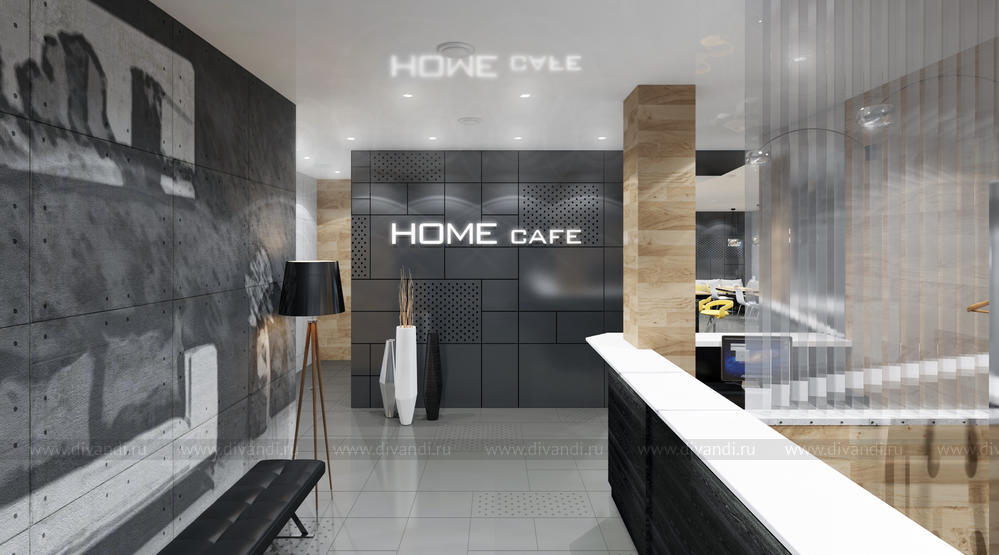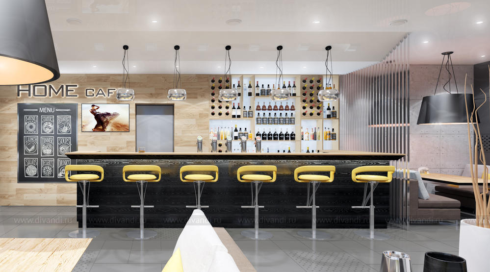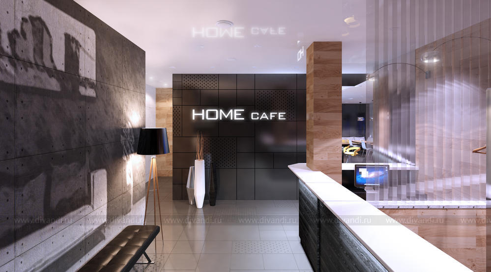 "Home cafe" - это небольшой панорамный ресторан, в интерьере которого использовано много дерева темных и светлых оттенков, стеновые панели, наливной пол, винный стеллаж и современная минималистичная мебель.