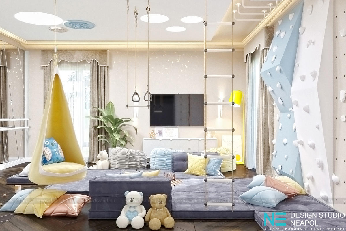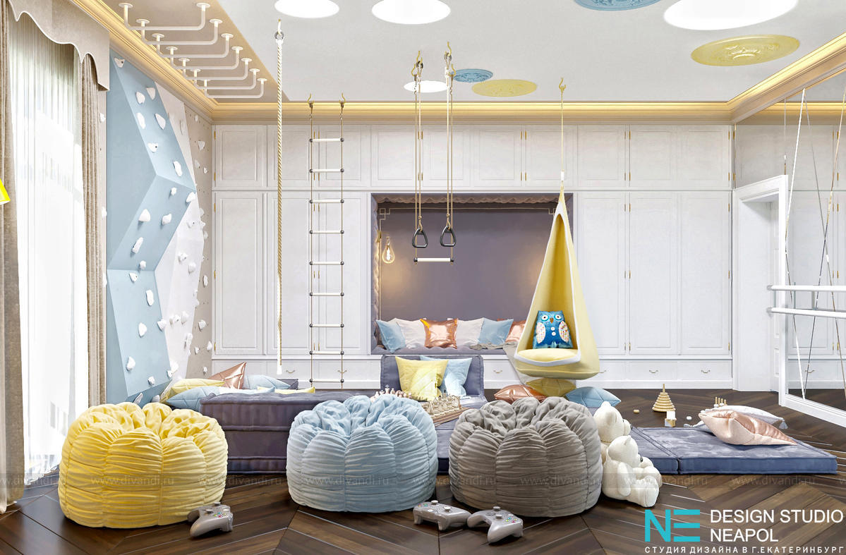 Много увлекательных игр и занятий ждут любознательных детей в игровой: это и маты для игр (из которых можно и дом построить!) и настольные игры и шведская стенка и стильные качели.