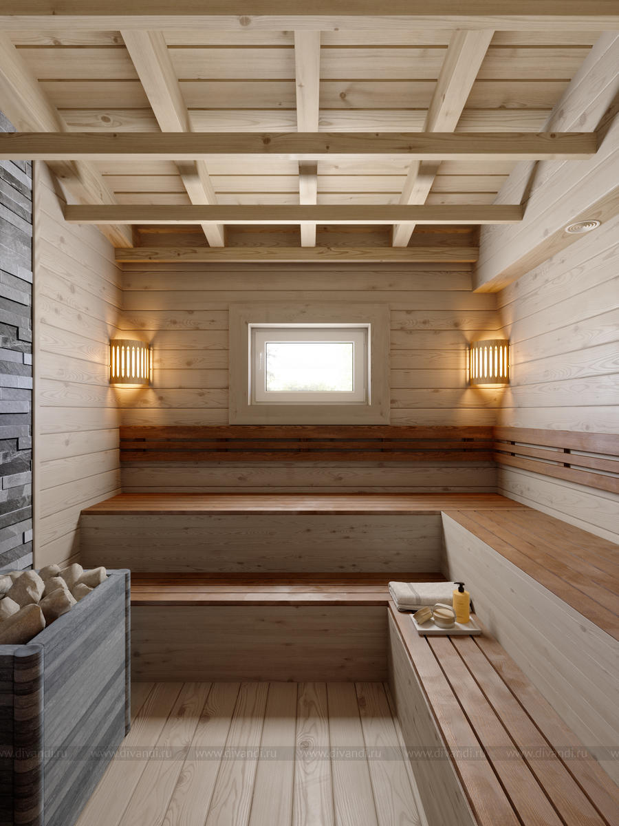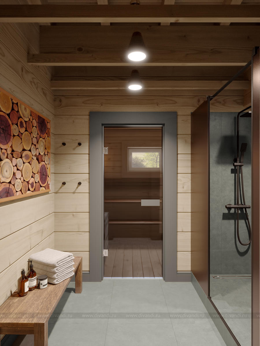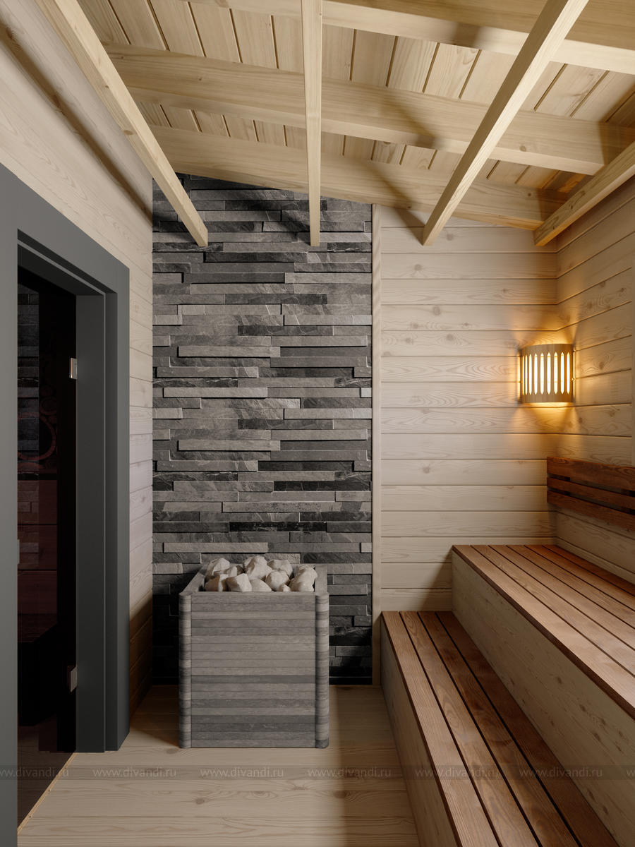 Мы спроектировали отдельно стоящую баню на участке, где есть парная, бассейн, комната отдыха и веранда для посиделок на природе с барбекю в летнее время