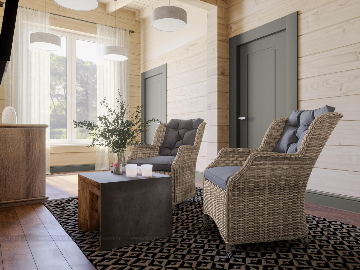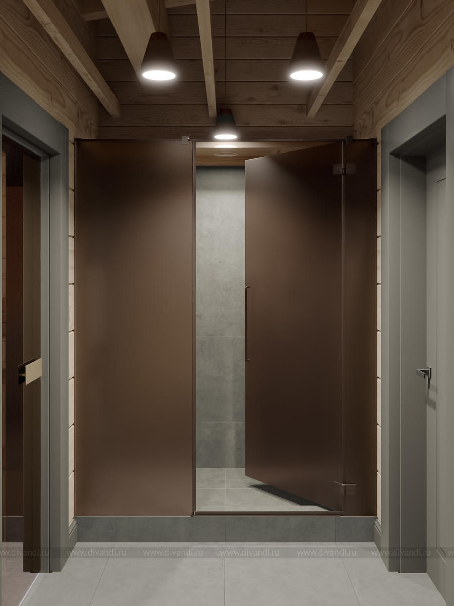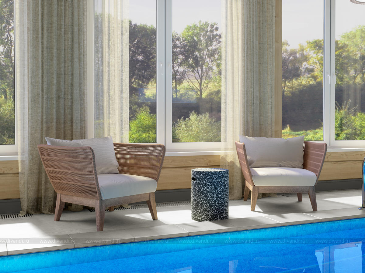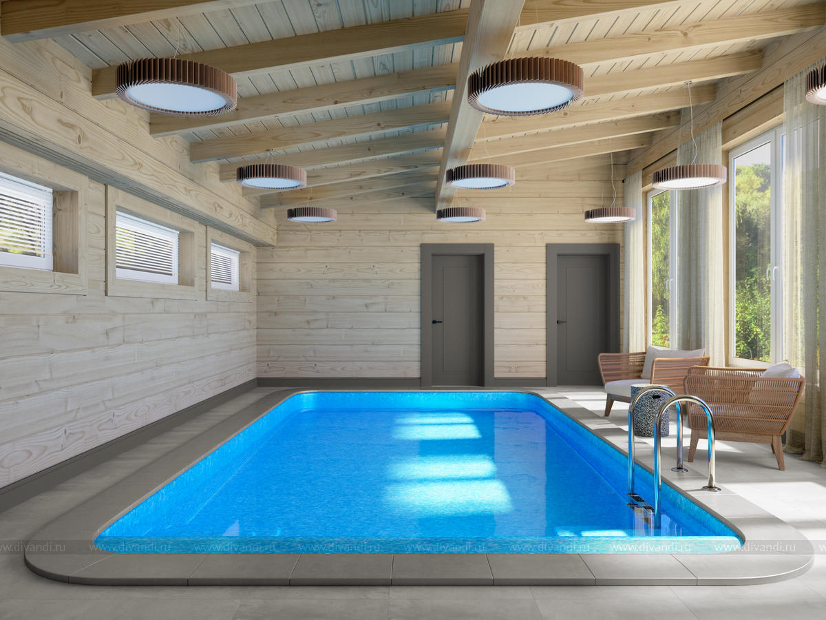 Мы спроектировали отдельно стоящую баню на участке, где есть парная, бассейн, комната отдыха и веранда для посиделок на природе с барбекю в летнее время