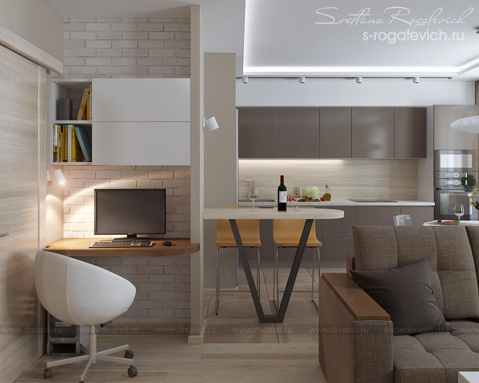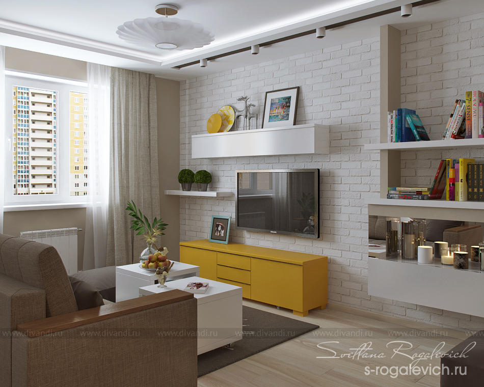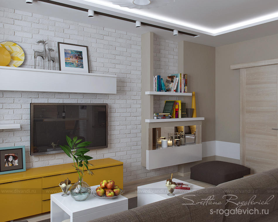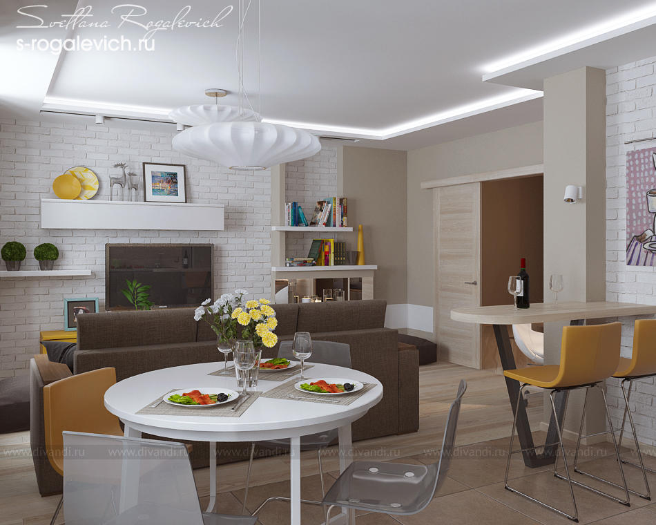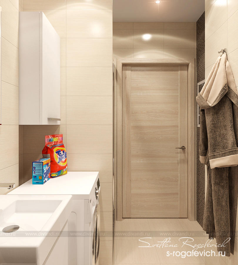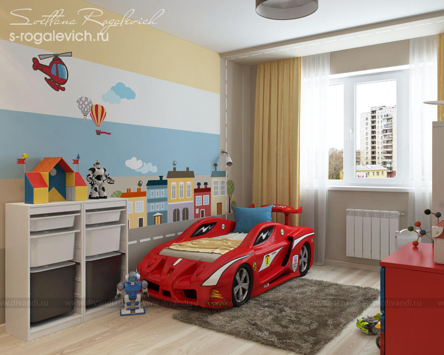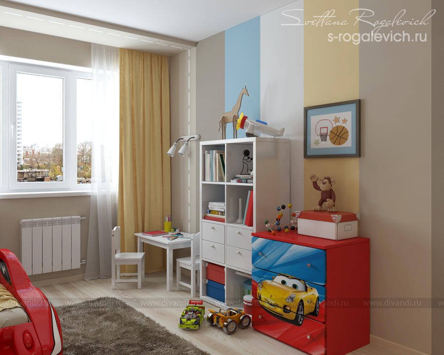 Проект разработан для молодой семейной пары с ребенком. Изначальная планировка квартиры была изменена путем объединения гостиной и кухни, а также увеличения санузла за счет коридора. В дизайне отражены предпочтения заказчиков относительно стилистики и цветовых сочетаний. В комнате сына вписана имеющаяся мебель - красные кровать-машинка и комод.