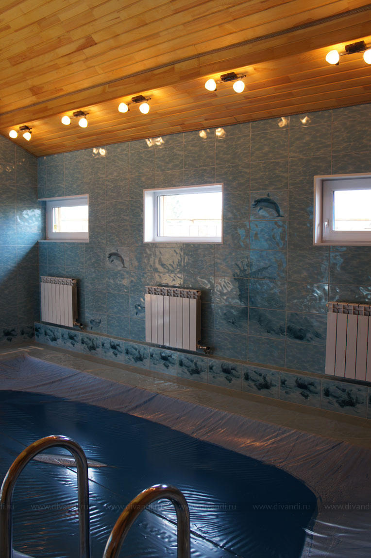 Интерьер бани с бассейном и комнатой отдыха