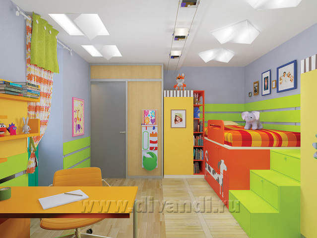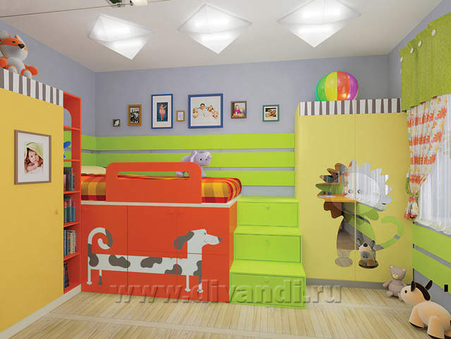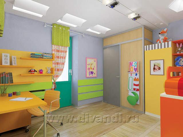Дизайн интерьера данной комнаты был выполнен для активного и творческого ребенка, у которого много игрушек, а так же огромное желание учиться и творить. Вся мебель в интерьере авторского дизайна и максимально удобна для ребенка. Львёнок на стене выполнен из зеркала с помощью лазерной резки, собачка - пленка Oracal.