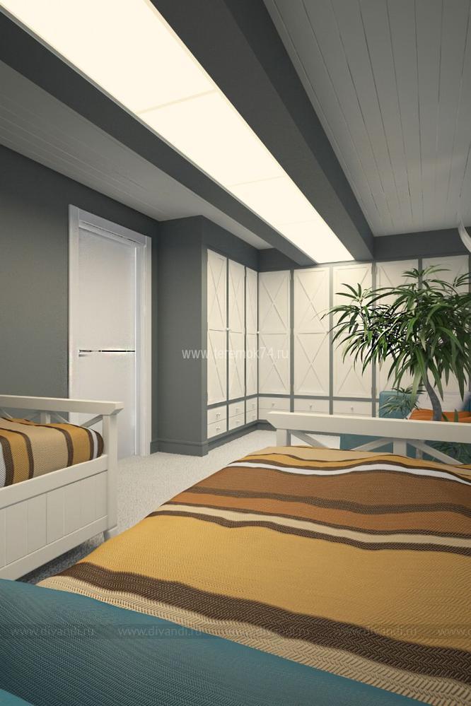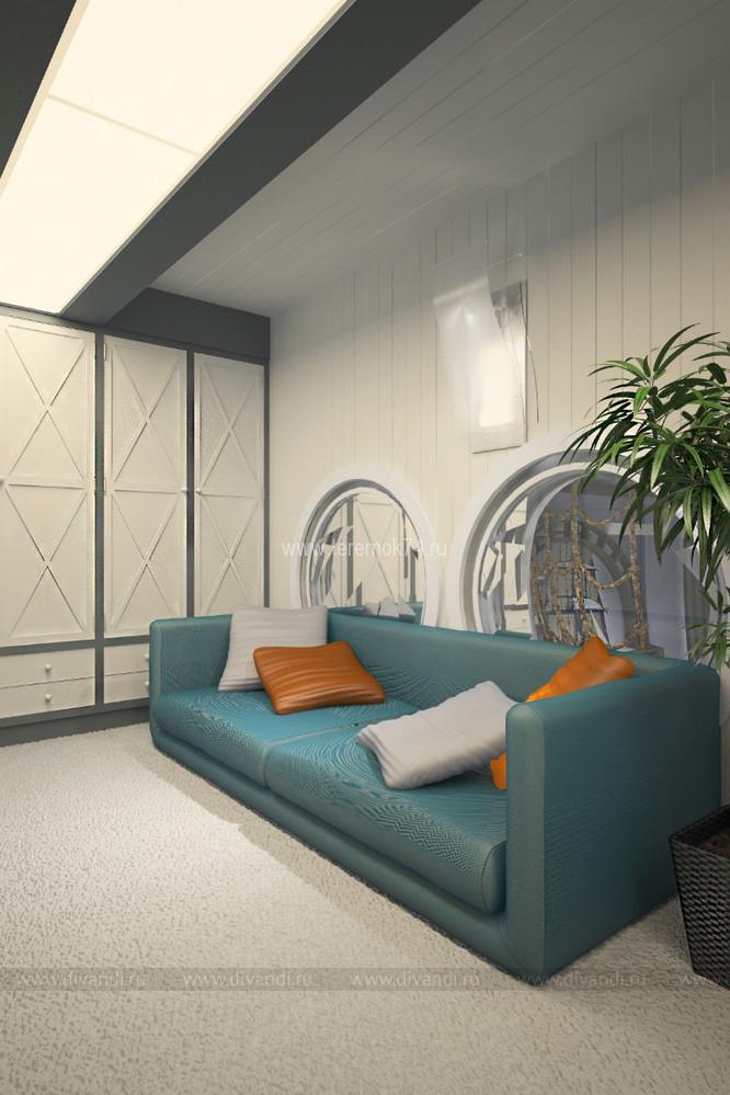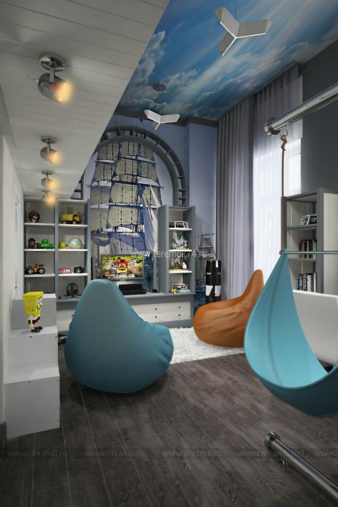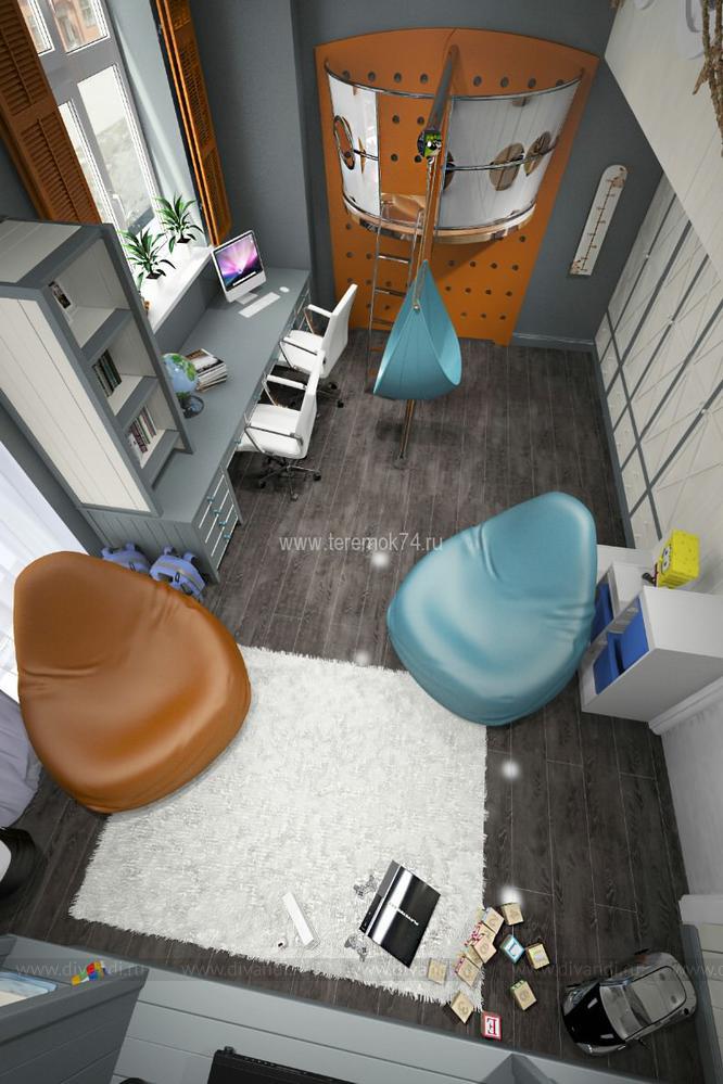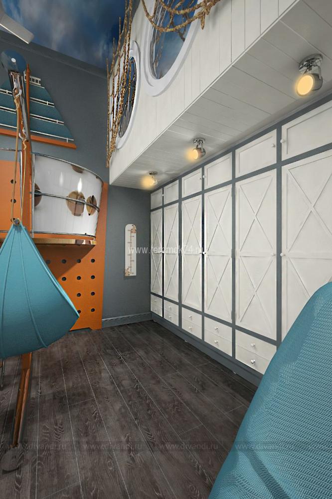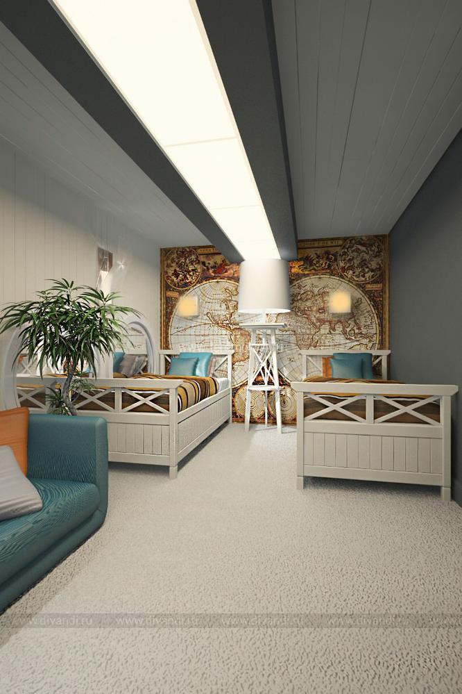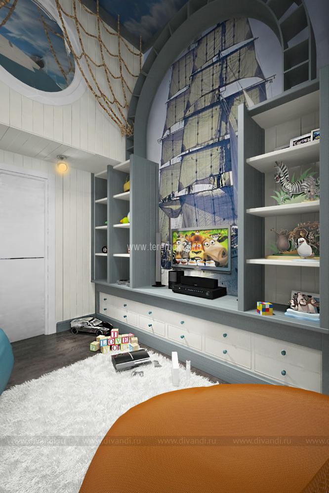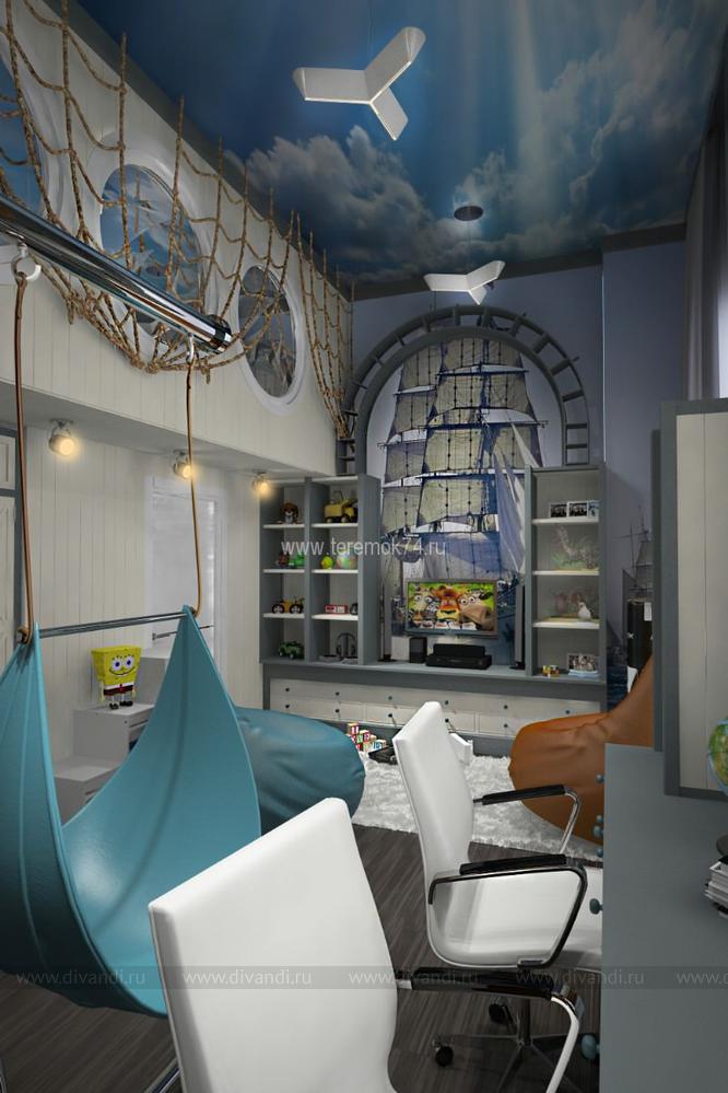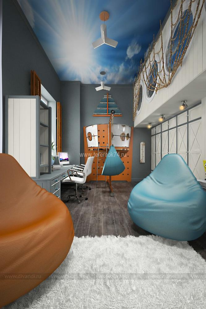 Детскую для 2-х братьев мы решили сделать в морском стиле. Вся корпусная мебель в этом интерьере разработана под индивидуальный заказ и стилизована под интерьер морского корабля. Сам интерьер делится на игровую и учебную зоны на первом этаже; и спальную и гардеробную на втором. В игровой комнате есть все, чтобы чувствовать себя настоящим пиратом: пиратский мостик, зона импровизированного «кабинета» с деревянными ставнями вместо штор, и конечно большой штурвал! Спальная зона на втором этаже сделана в виде каюты, и отделена от игровой при помощи иллюминаторов.