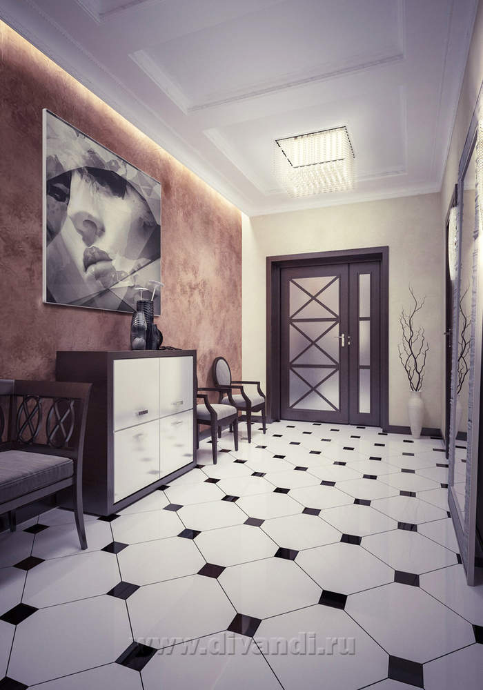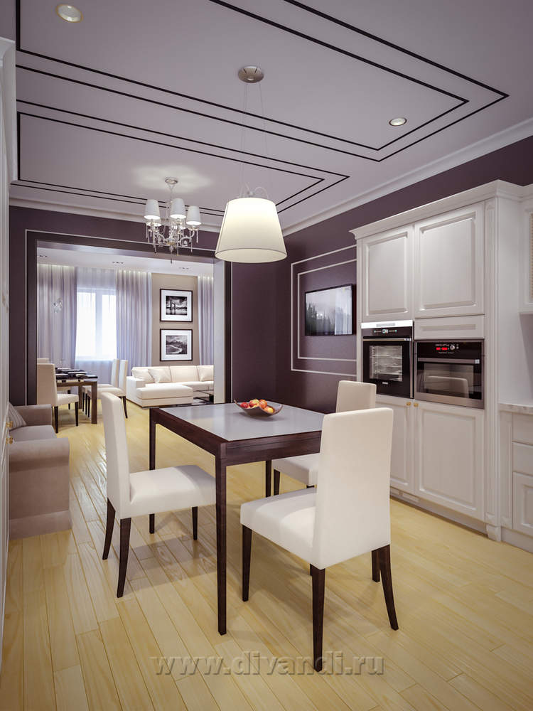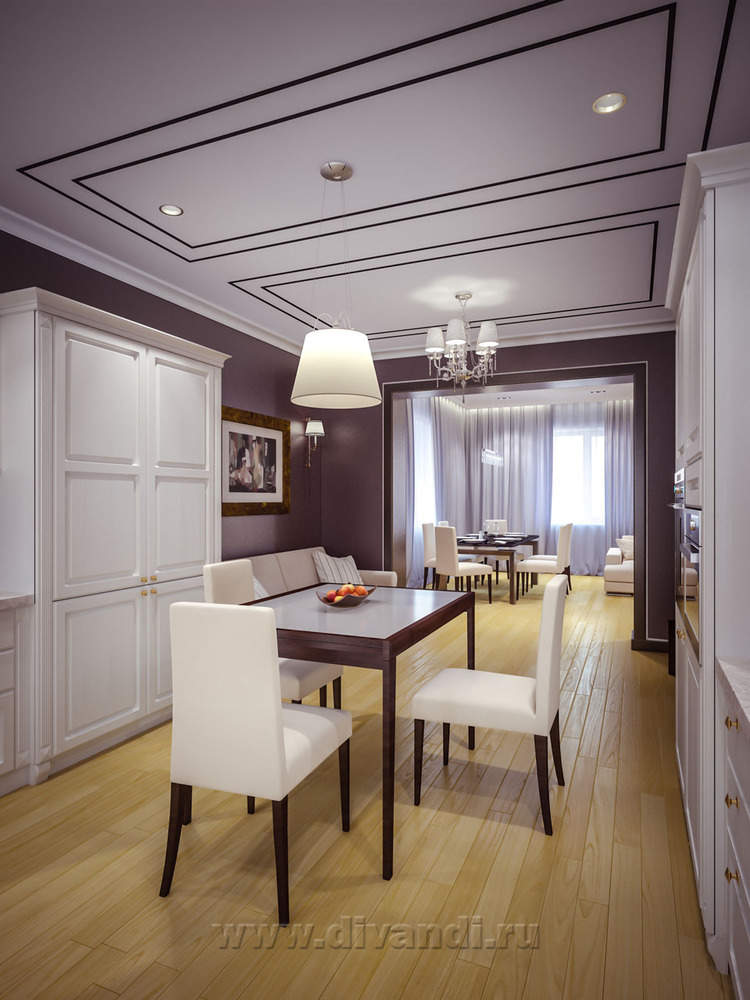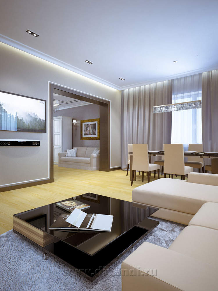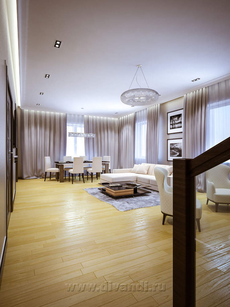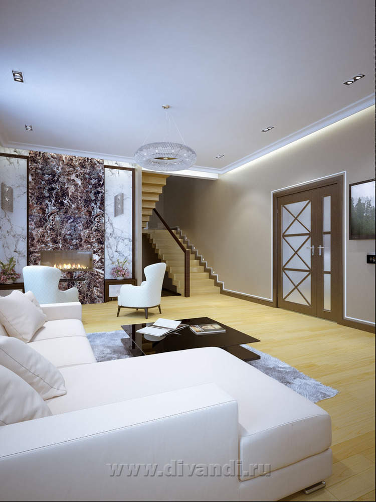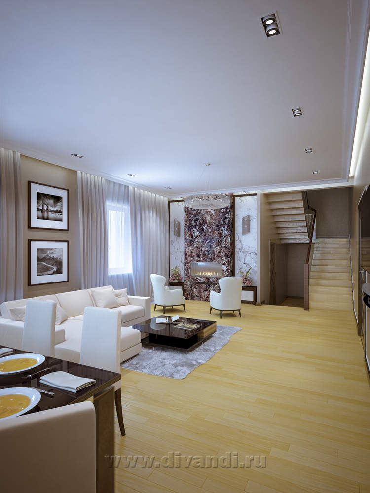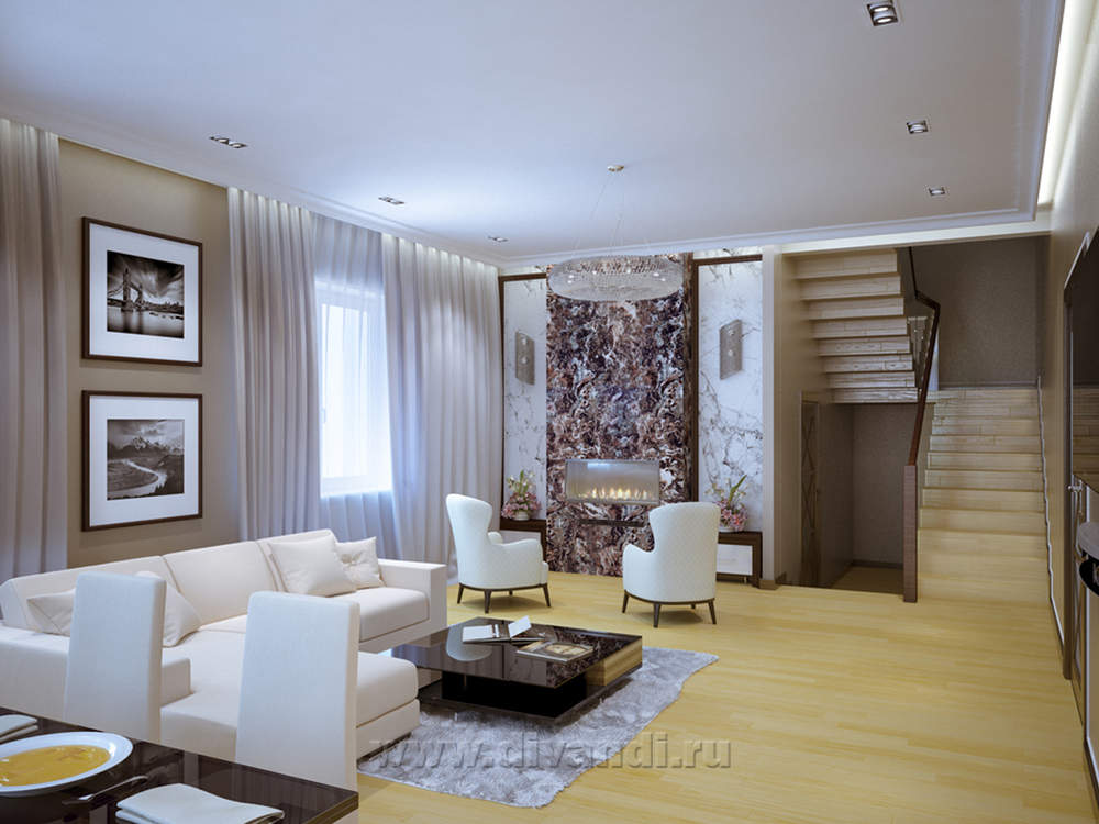Жилой дом для которого выполнен этот дизайн интерьер принадлежит молодой семье. Именно поэтому было принято решение сделать для них современный интерьер с элементами роскоши. Первый этаж - общественный. Из основных помещений, на этом уровне располагается кухня, столовая зона и гостиная. В общем отделка стен и форма потолка поддерживает идею современного интерьера, а мебель и присутствие камина придает этим помещением единство, торжественность, чувства комфорта и спокойствия.