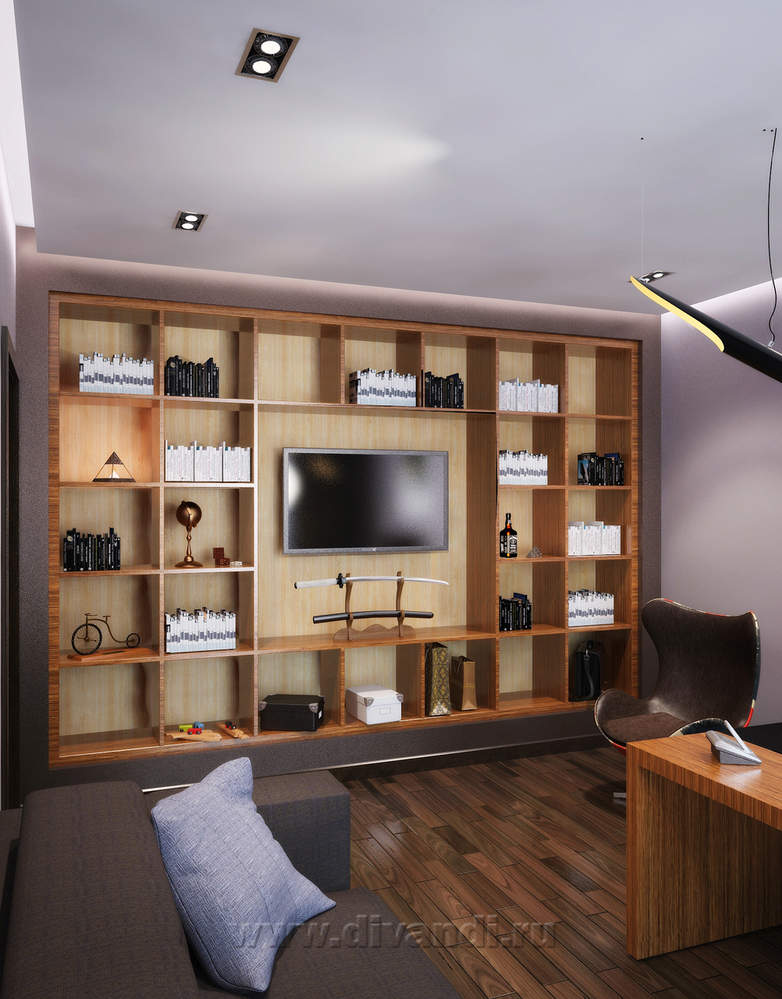 Кабинет так же расположен на втором этаже, что помогает хозяину дома обрести чувство уединения и отдалиться от шума и суеты на время работы. Его дизайн выполнен в сдержанном деловом стиле. Из дизайнерских находок здесь представлено интересное решение освещения.