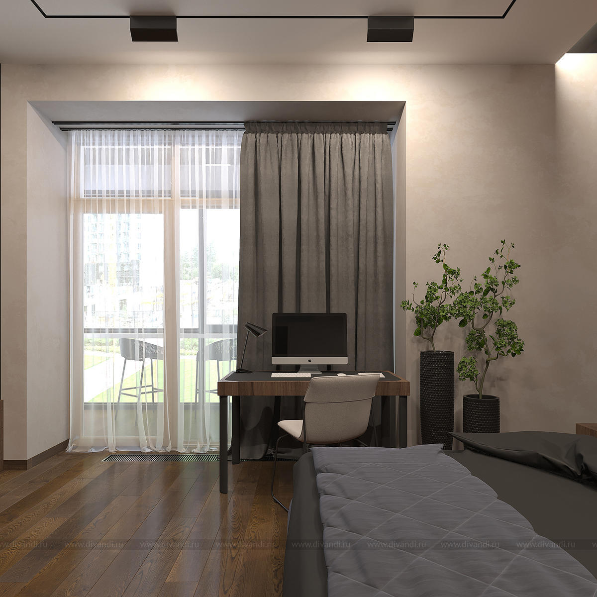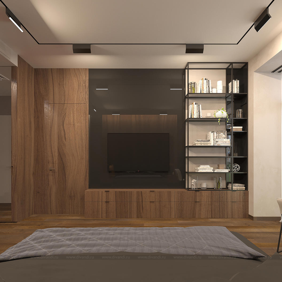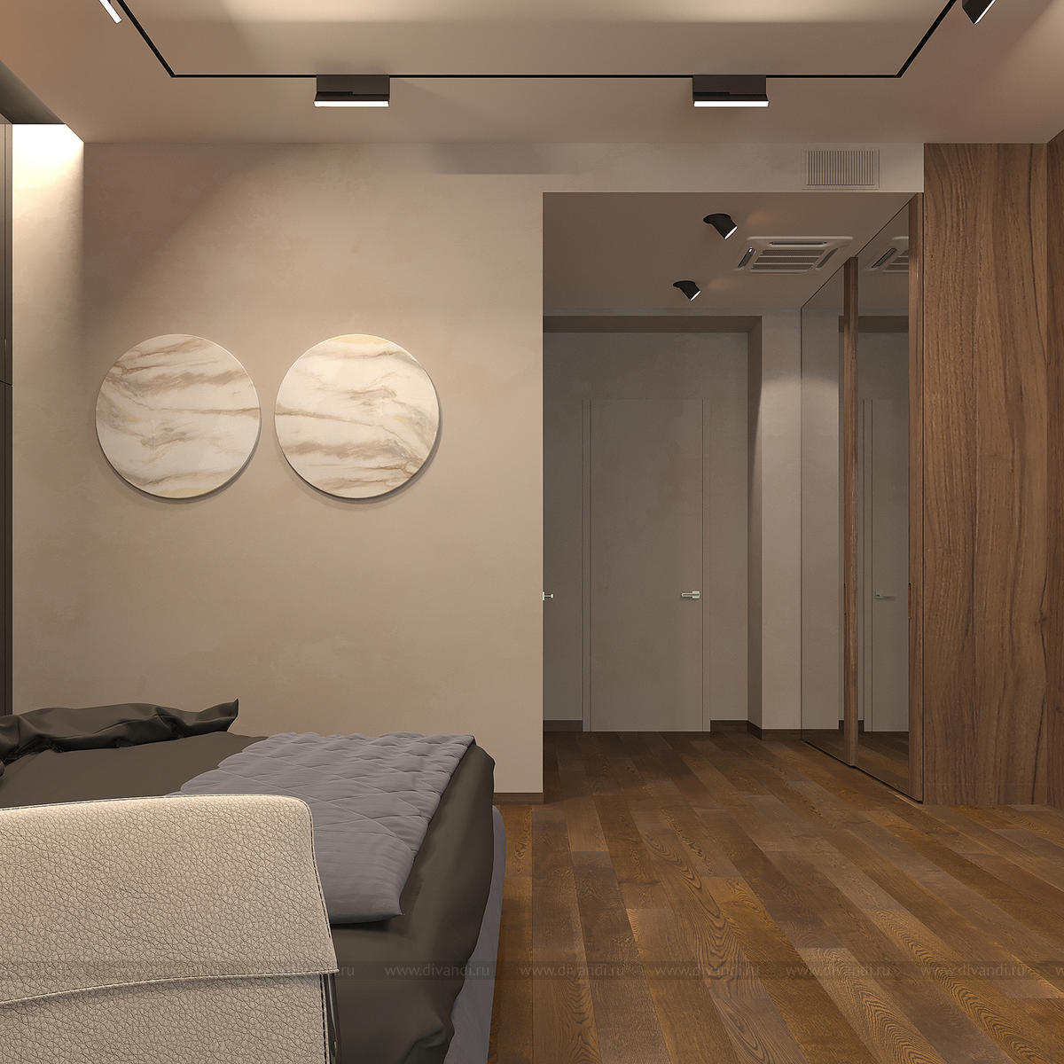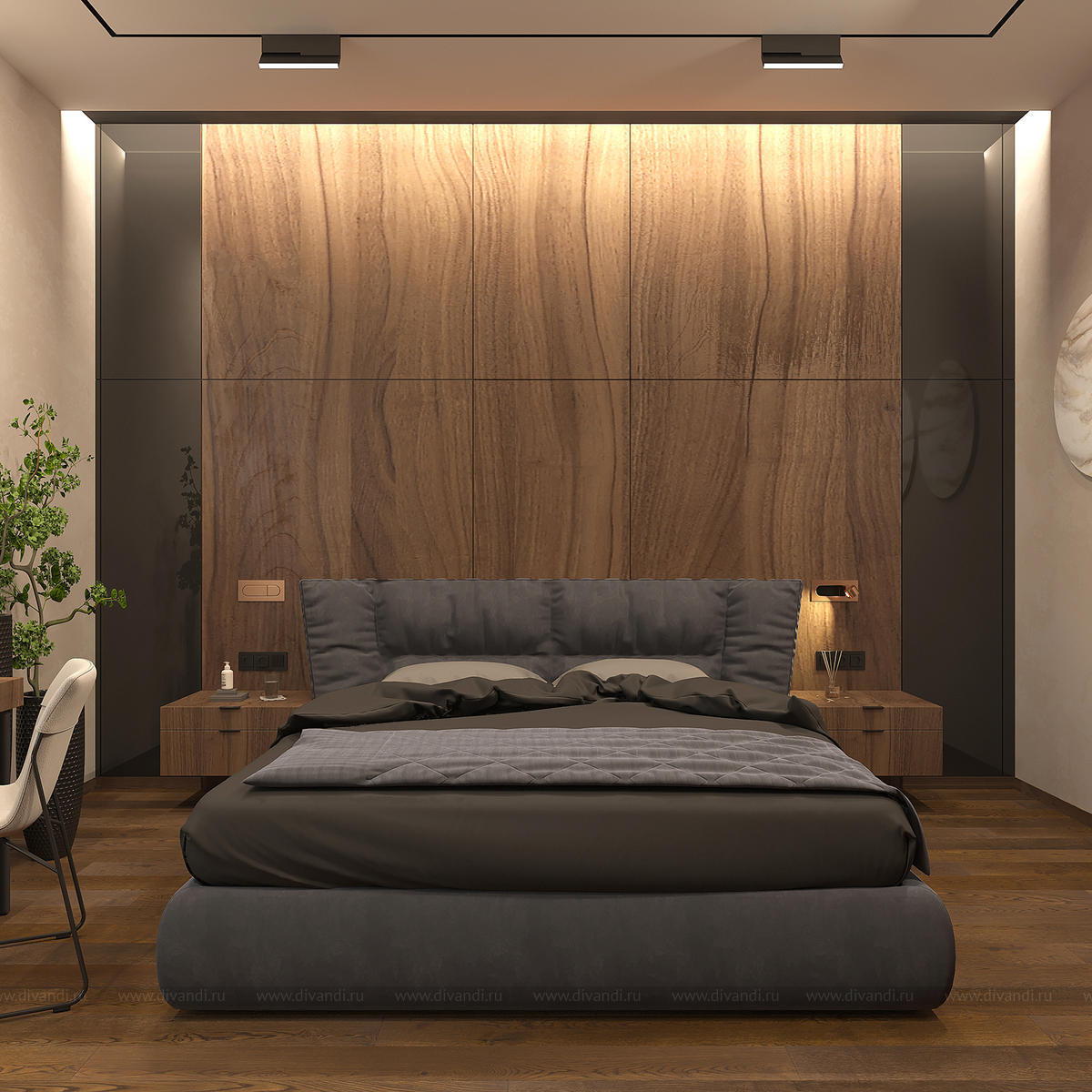Интерьер гостевой спальни в ЖК Макаровский квартал За изголовьем кровать стеновые панели со шпоном ореха
