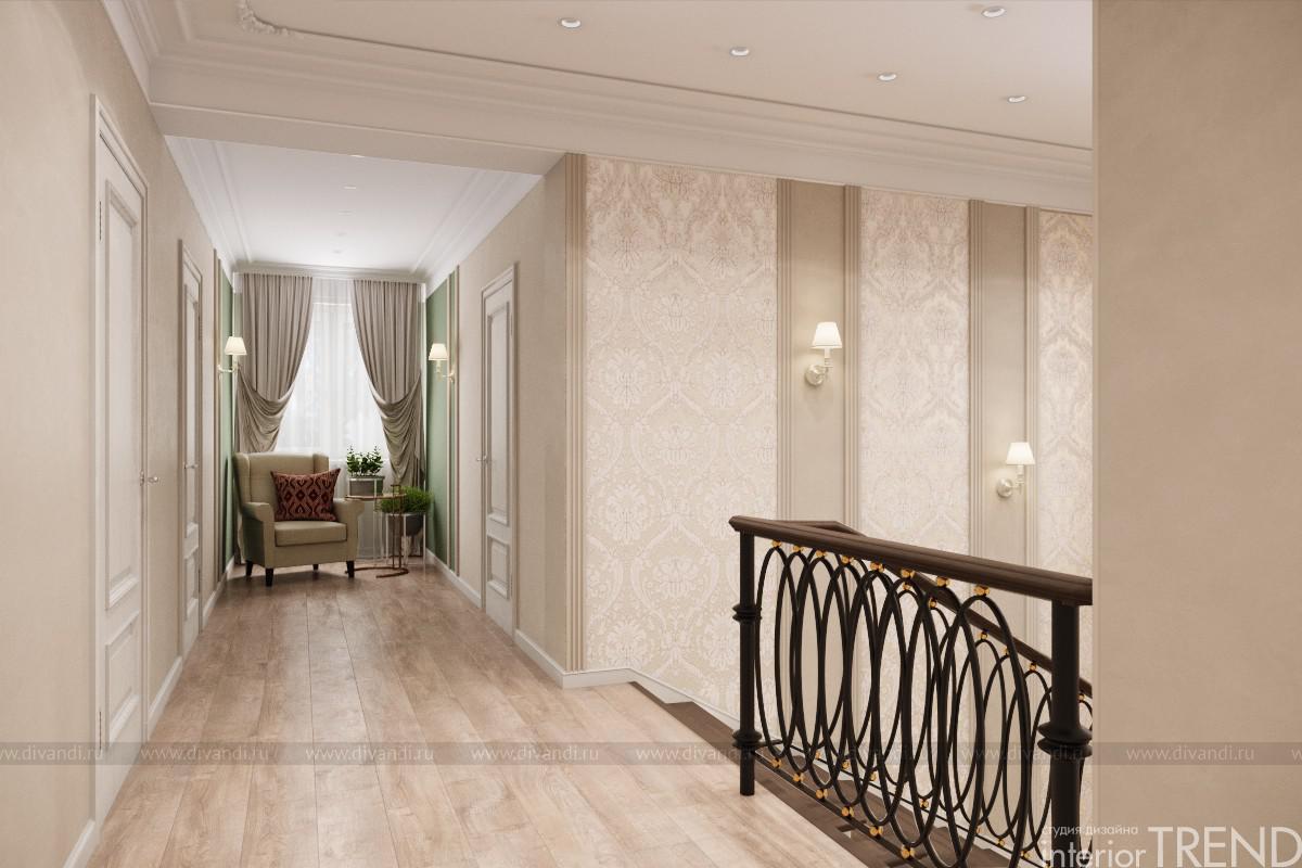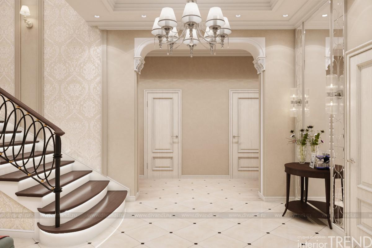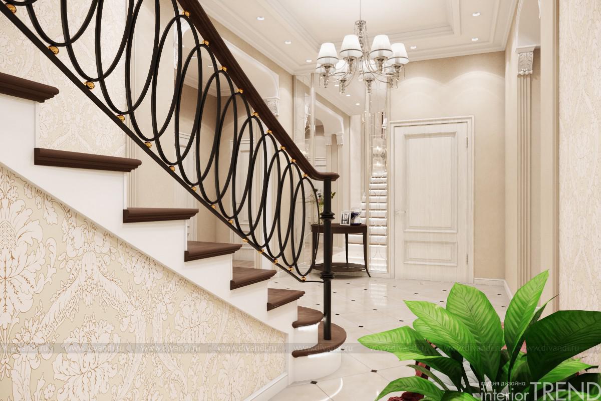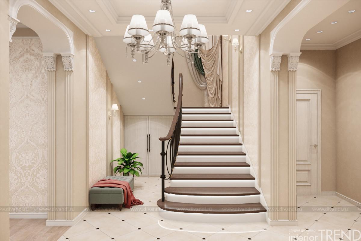 Современная гостиная с лестничным холлом для загородного дома в пос. Бобры | Modern living room with a staircase hall for a country house in the village
