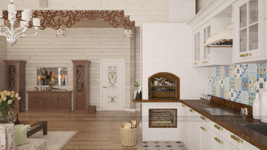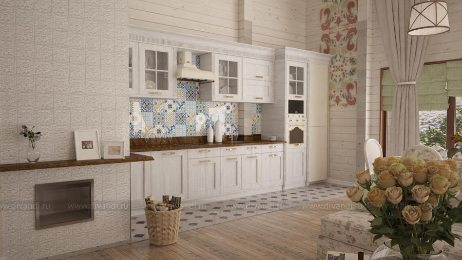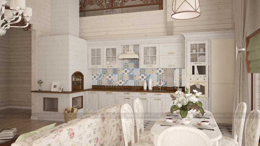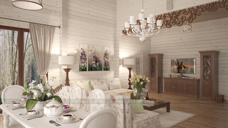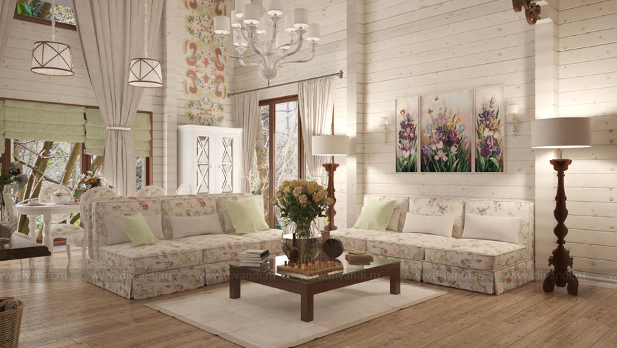 Легкая и светлая гостиная выполнена в стилистики "Русской усадьбы". Цветочные рисунки, роспись на стенах делают интерьер очень женственным.
