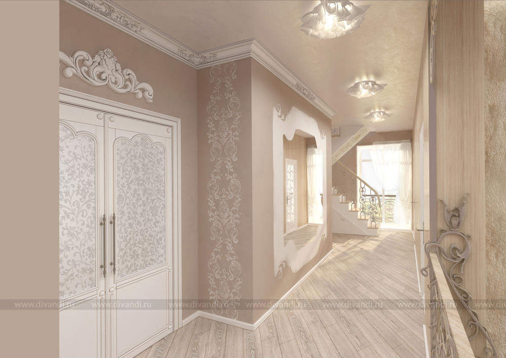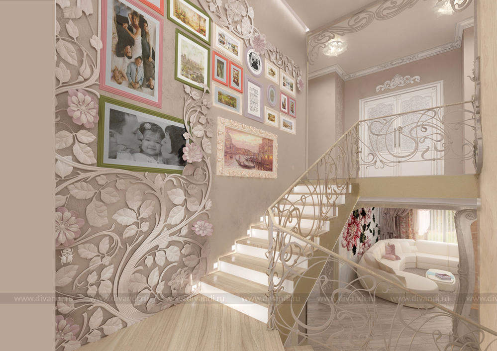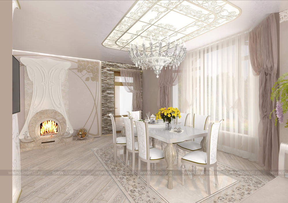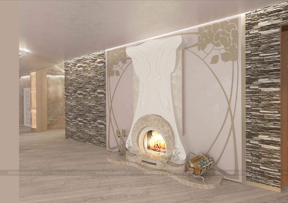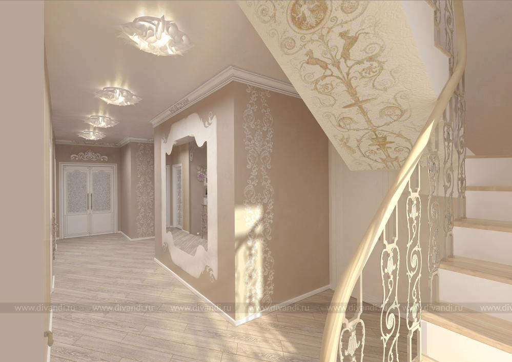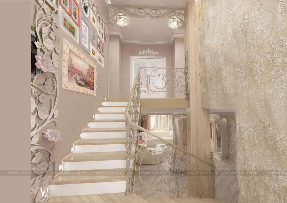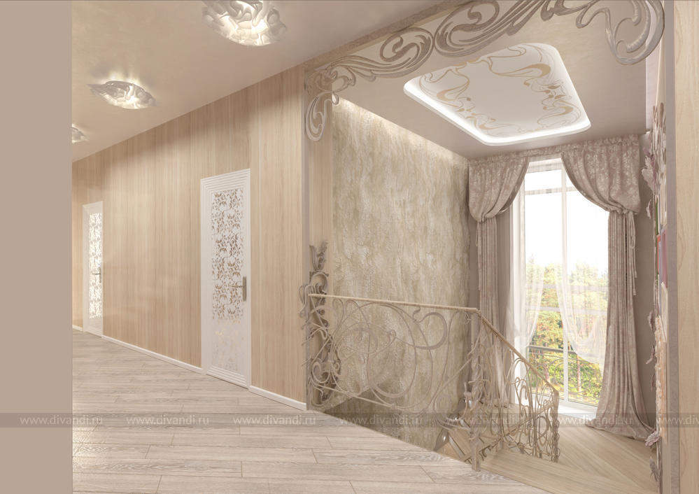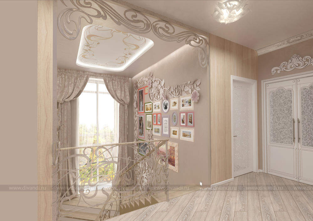 Коттедж расположен в поселке Лесные дачи особенностью этого поселка является то, что все дома построены в сосновом бору. Именно эта особенность вдохновила дизайнера на создание интерьера коттеджа в стиле модерн. В интерьере использовались, как натуральные материалы, так и материалы имитирующие их внешний облик: имитация дикой стены в лестничном холле, стена под плитняк у камина из мрамора, стены имитирующие деревянную фактуру в прихожей, мебель из натурального дерева и декоративные штукатурки. В интерьере коттеджа преобладают скругленные формы, плавные линии, растительные и цветочные мотивы. Цветовая гамма коттеджа выполнена в светлых тонах с акцентами, что придает интерьеру легкость и увеличивает пространство. Все пространство коттеджа заполнено авторскими изделиями: цветочный барельеф в гостиной, камин в стилистике Антонио Гауди, росписи на потолке, многочисленная лепнина, витраж в столовой, перегородка из стекла с матовым рисунком, композиция из художественной ковки в лестничном холле, кованые перила, а так же многое другие детали в интерьере. Благодаря круглой композиции на потолке в гостиной, за счет цветной светодиодной подсветки, спокойный интерьер в вечернее время может, превращается в тусовочное место.