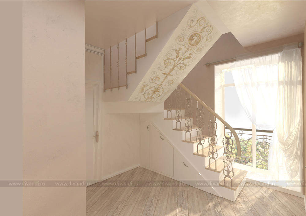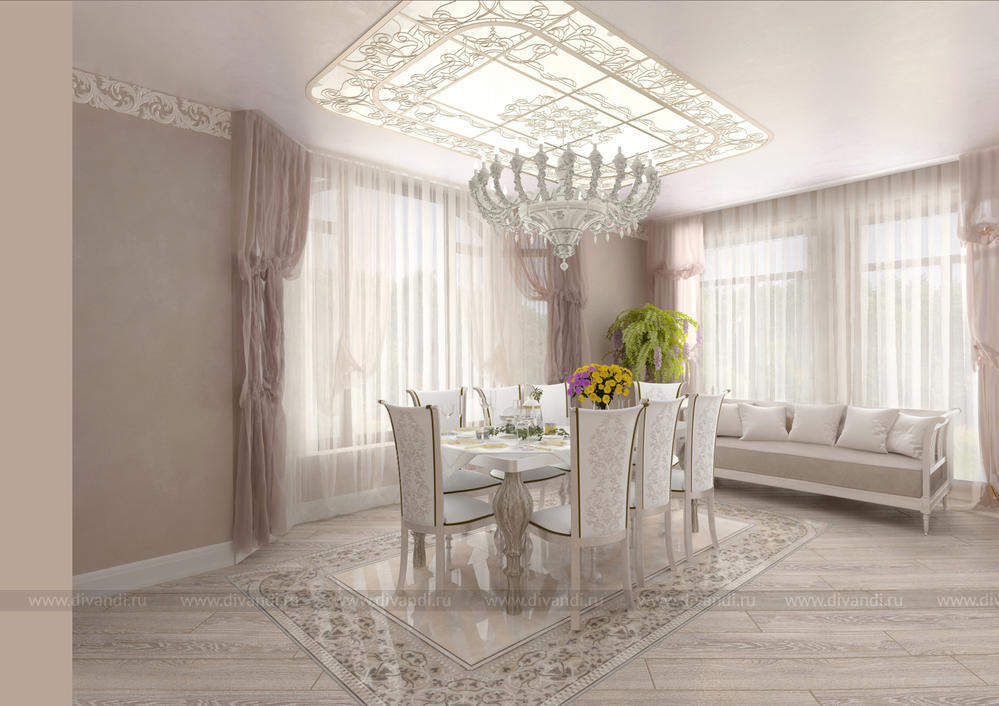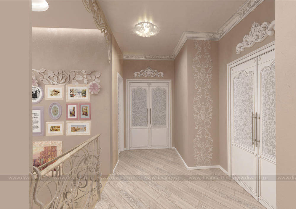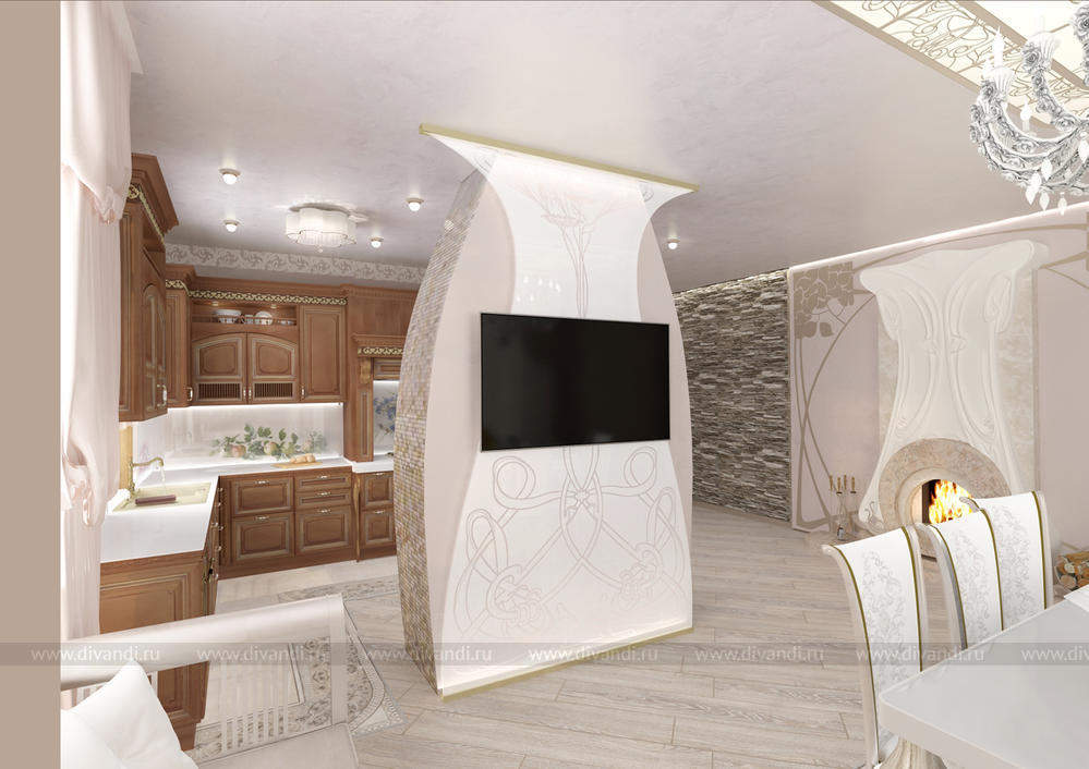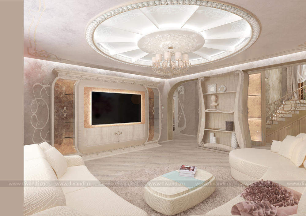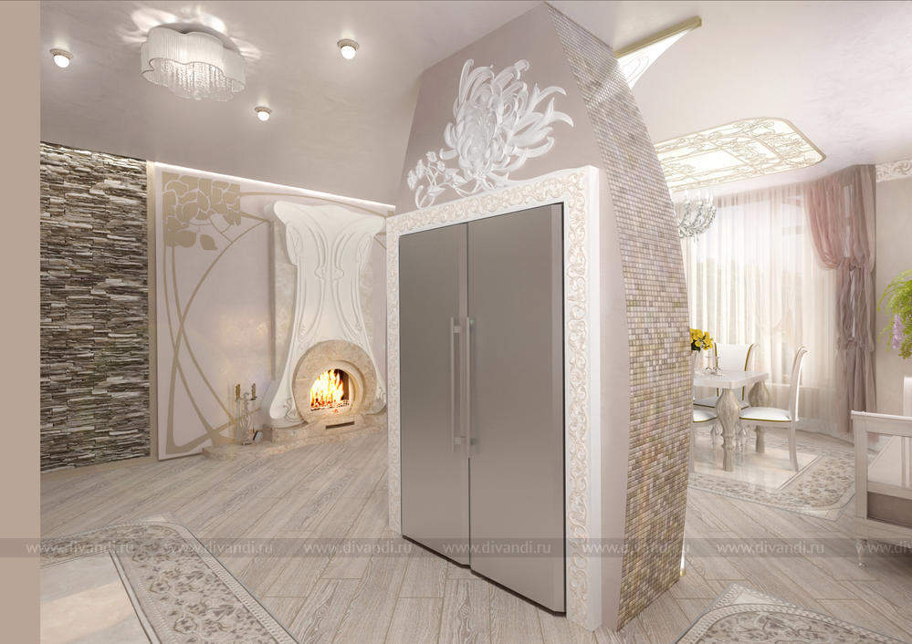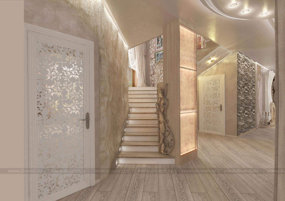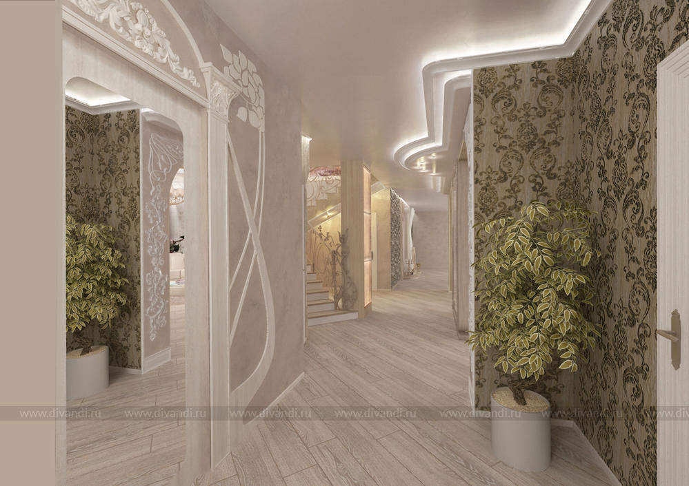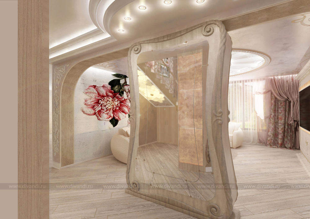 Коттедж расположен в поселке Лесные дачи особенностью этого поселка является то, что все дома построены в сосновом бору. Именно эта особенность вдохновила дизайнера на создание интерьера коттеджа в стиле модерн. В интерьере использовались, как натуральные материалы, так и материалы имитирующие их внешний облик: имитация дикой стены в лестничном холле, стена под плитняк у камина из мрамора, стены имитирующие деревянную фактуру в прихожей, мебель из натурального дерева и декоративные штукатурки. В интерьере коттеджа преобладают скругленные формы, плавные линии, растительные и цветочные мотивы. Цветовая гамма коттеджа выполнена в светлых тонах с акцентами, что придает интерьеру легкость и увеличивает пространство. Все пространство коттеджа заполнено авторскими изделиями: цветочный барельеф в гостиной, камин в стилистике Антонио Гауди, росписи на потолке, многочисленная лепнина, витраж в столовой, перегородка из стекла с матовым рисунком, композиция из художественной ковки в лестничном холле, кованые перила, а так же многое другие детали в интерьере. Благодаря круглой композиции на потолке в гостиной, за счет цветной светодиодной подсветки, спокойный интерьер в вечернее время может, превращается в тусовочное место.
