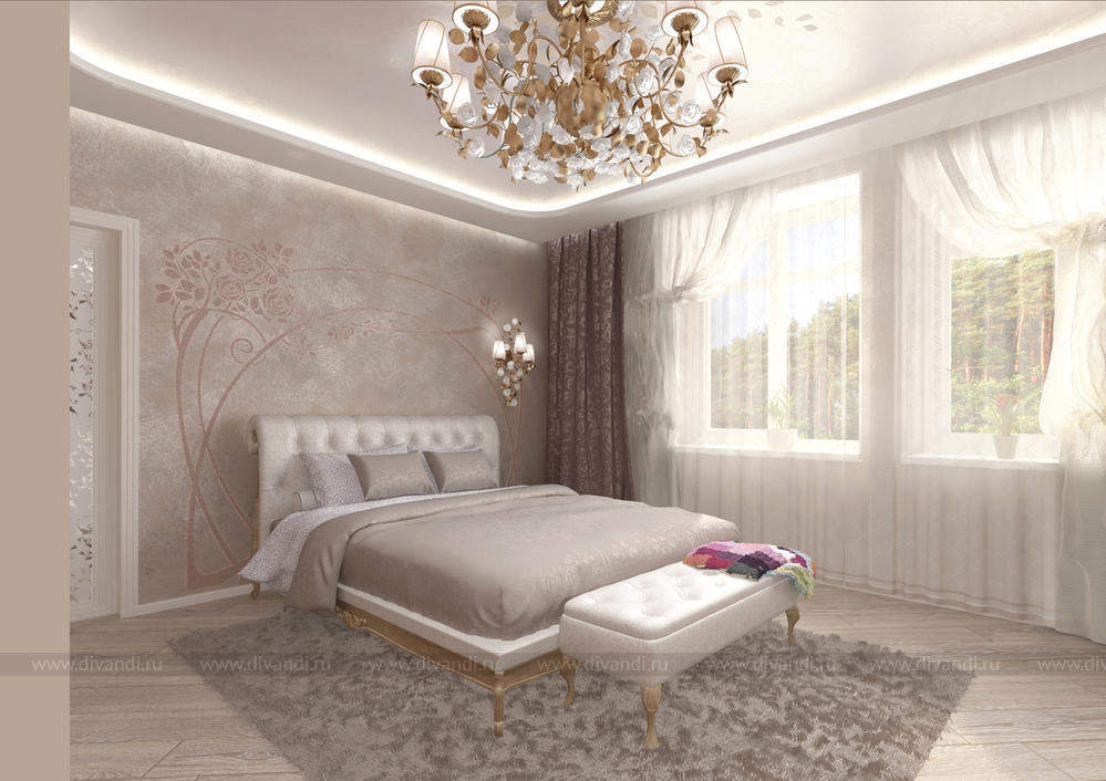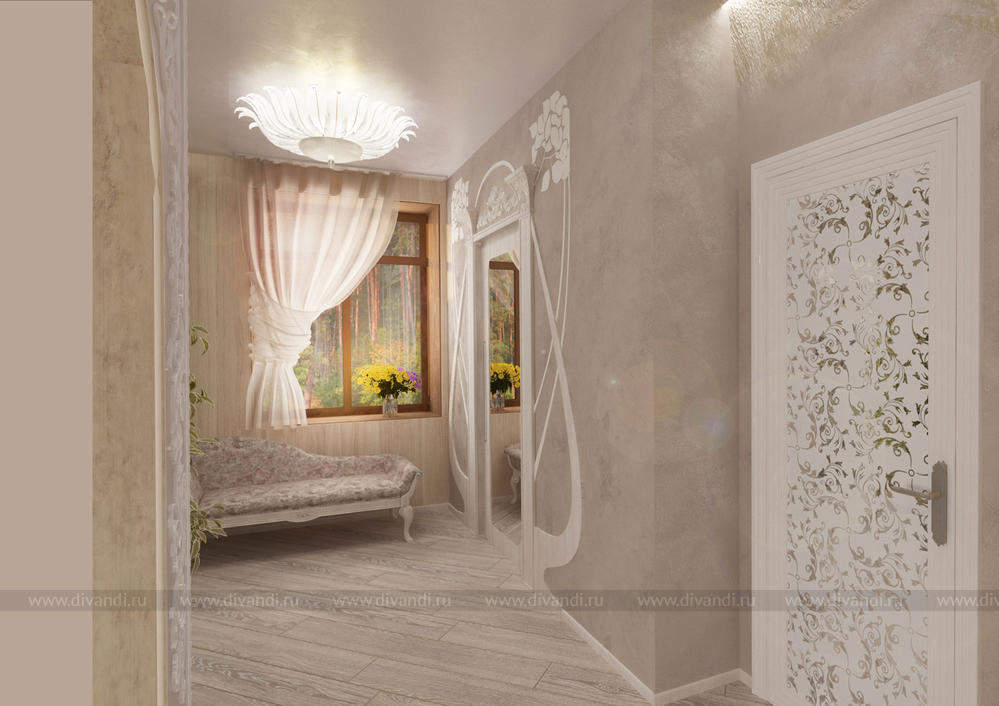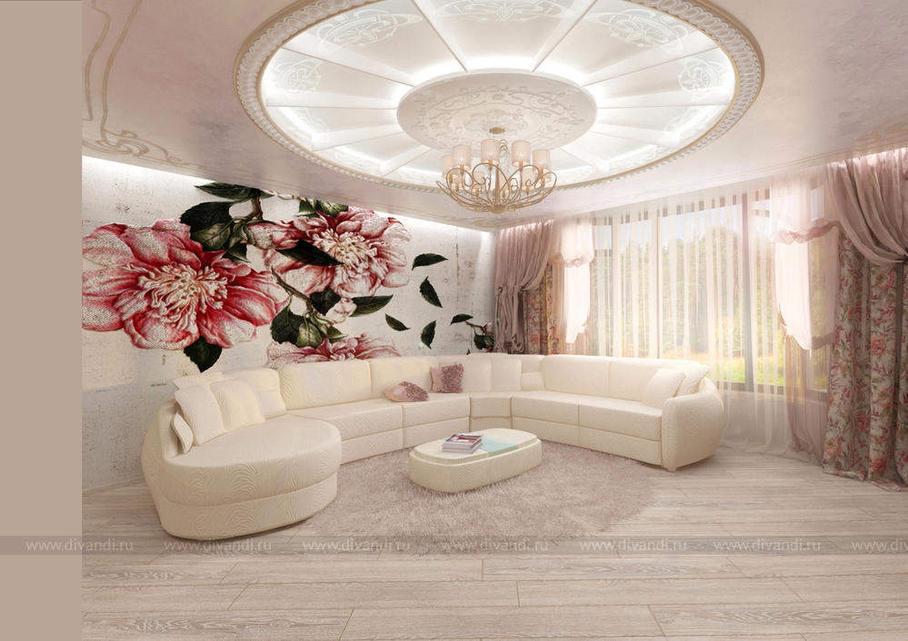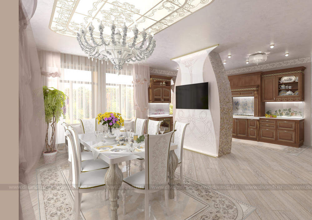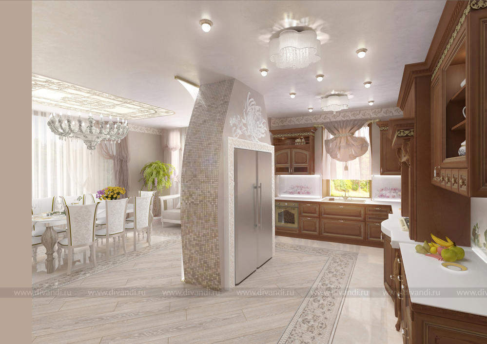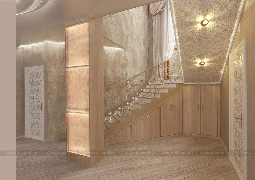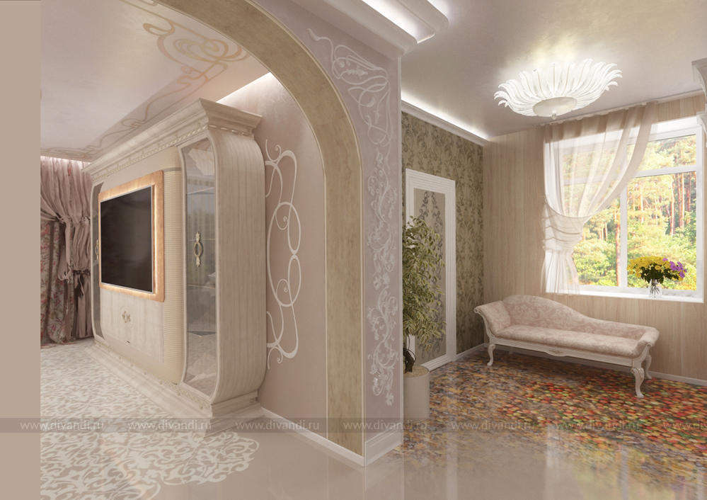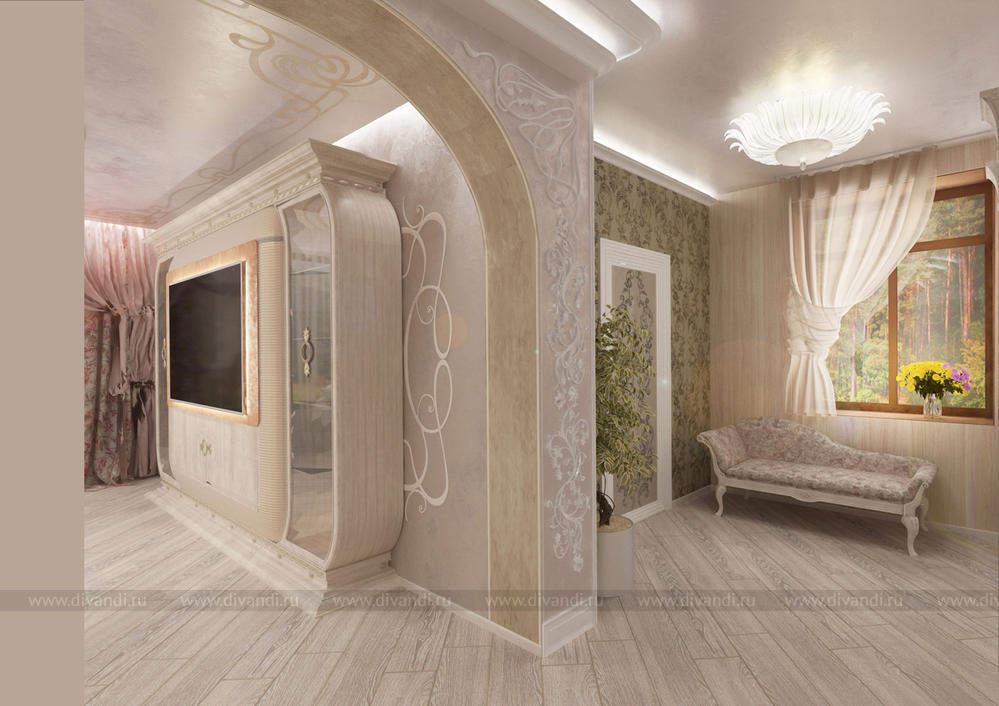Коттедж расположен в поселке Лесные дачи особенностью этого поселка является то, что все дома построены в сосновом бору. Именно эта особенность вдохновила дизайнера на создание интерьера коттеджа в стиле модерн. В интерьере использовались, как натуральные материалы, так и материалы имитирующие их внешний облик: имитация дикой стены в лестничном холле, стена под плитняк у камина из мрамора, стены имитирующие деревянную фактуру в прихожей, мебель из натурального дерева и декоративные штукатурки. В интерьере коттеджа преобладают скругленные формы, плавные линии, растительные и цветочные мотивы. Цветовая гамма коттеджа выполнена в светлых тонах с акцентами, что придает интерьеру легкость и увеличивает пространство. Все пространство коттеджа заполнено авторскими изделиями: цветочный барельеф в гостиной, камин в стилистике Антонио Гауди, росписи на потолке, многочисленная лепнина, витраж в столовой, перегородка из стекла с матовым рисунком, композиция из художественной ковки в лестничном холле, кованые перила, а так же многое другие детали в интерьере. Благодаря круглой композиции на потолке в гостиной, за счет цветной светодиодной подсветки, спокойный интерьер в вечернее время может, превращается в тусовочное место.