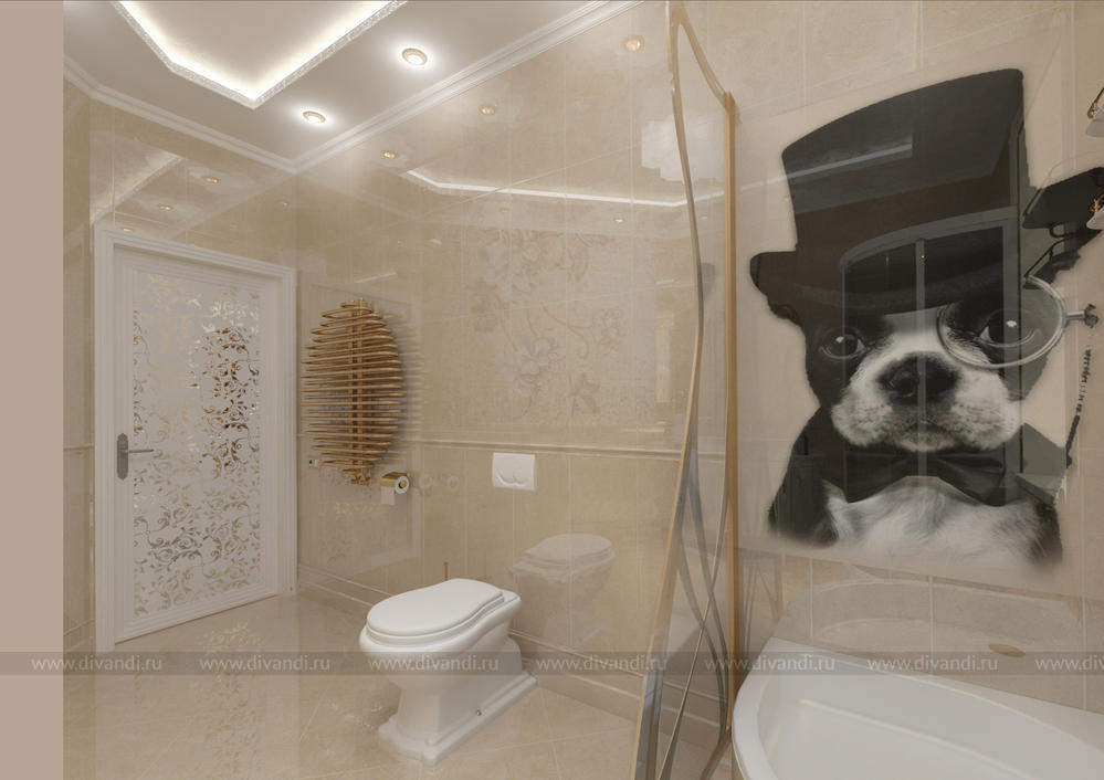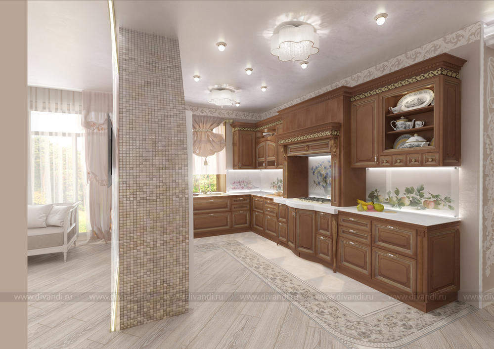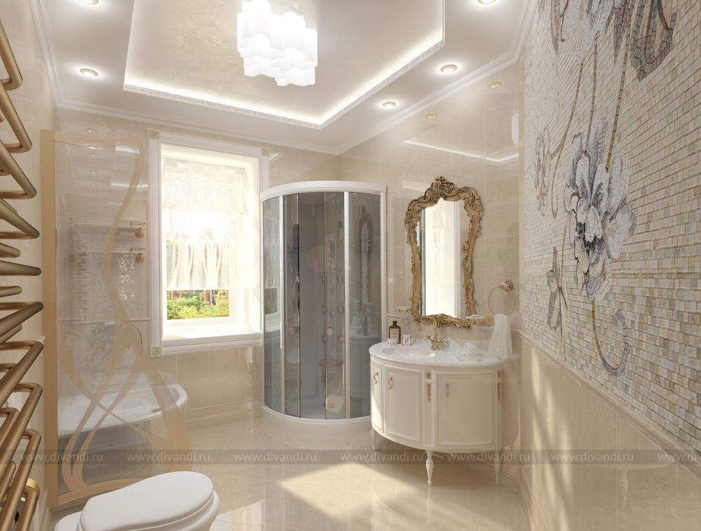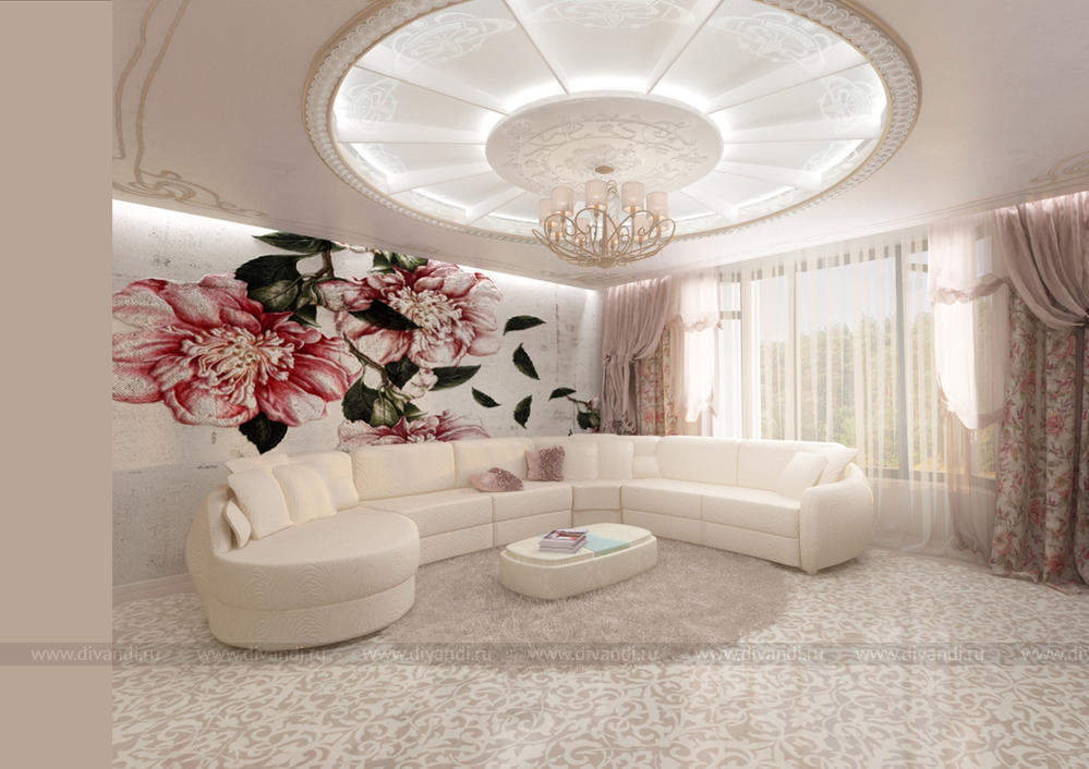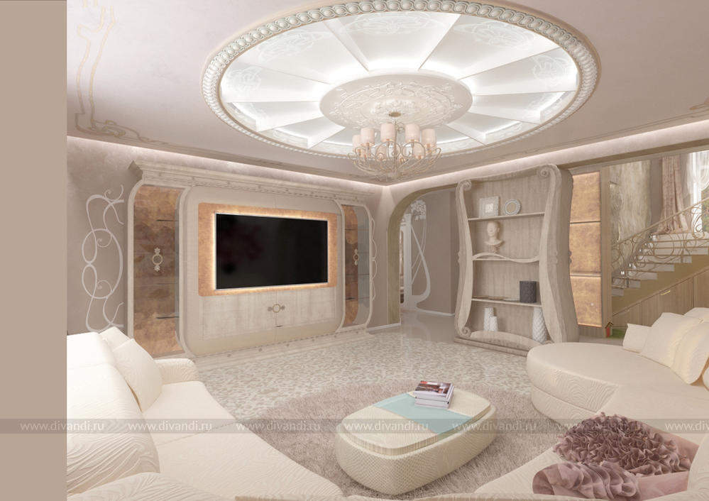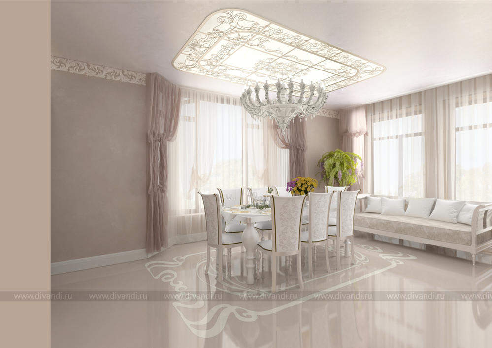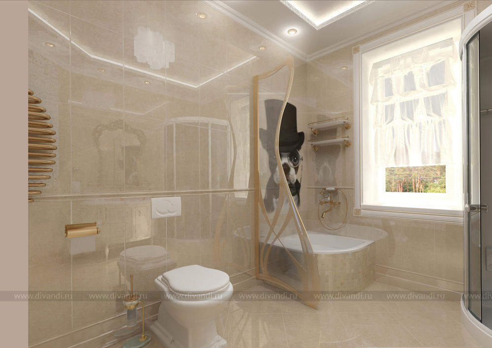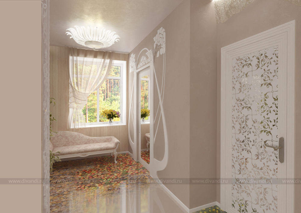 Коттедж расположен в поселке Лесные дачи особенностью этого поселка является то, что все дома построены в сосновом бору. Именно эта особенность вдохновила дизайнера на создание интерьера коттеджа в стиле модерн. В интерьере использовались, как натуральные материалы, так и материалы имитирующие их внешний облик: имитация дикой стены в лестничном холле, стена под плитняк у камина из мрамора, стены имитирующие деревянную фактуру в прихожей, мебель из натурального дерева и декоративные штукатурки. В интерьере коттеджа преобладают скругленные формы, плавные линии, растительные и цветочные мотивы. Цветовая гамма коттеджа выполнена в светлых тонах с акцентами, что придает интерьеру легкость и увеличивает пространство. Все пространство коттеджа заполнено авторскими изделиями: цветочный барельеф в гостиной, камин в стилистике Антонио Гауди, росписи на потолке, многочисленная лепнина, витраж в столовой, перегородка из стекла с матовым рисунком, композиция из художественной ковки в лестничном холле, кованые перила, а так же многое другие детали в интерьере. Благодаря круглой композиции на потолке в гостиной, за счет цветной светодиодной подсветки, спокойный интерьер в вечернее время может, превращается в тусовочное место.
