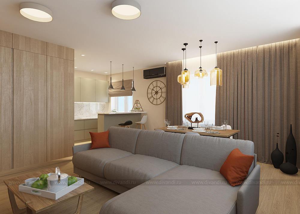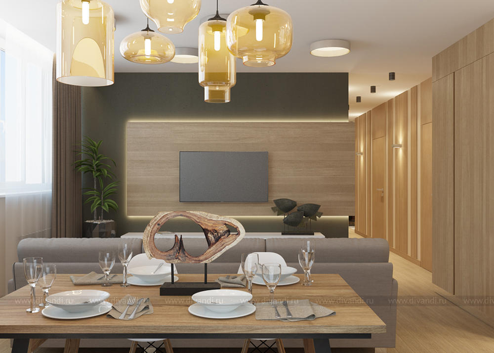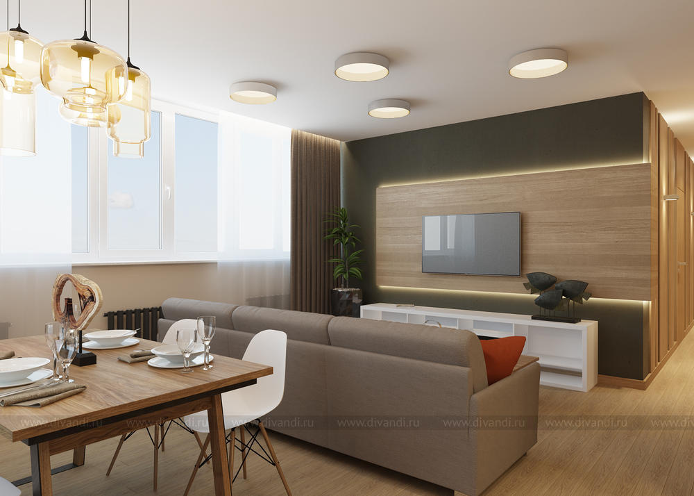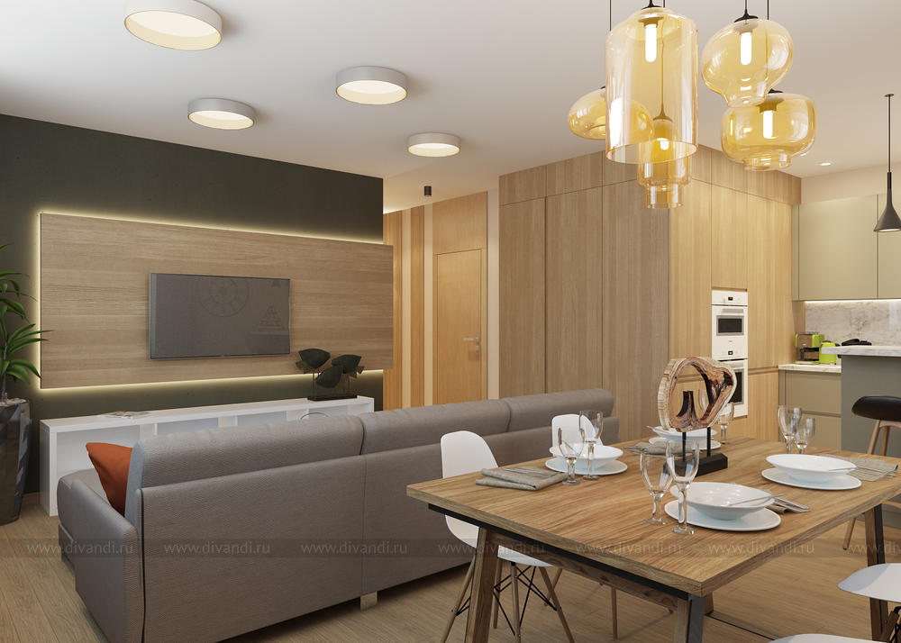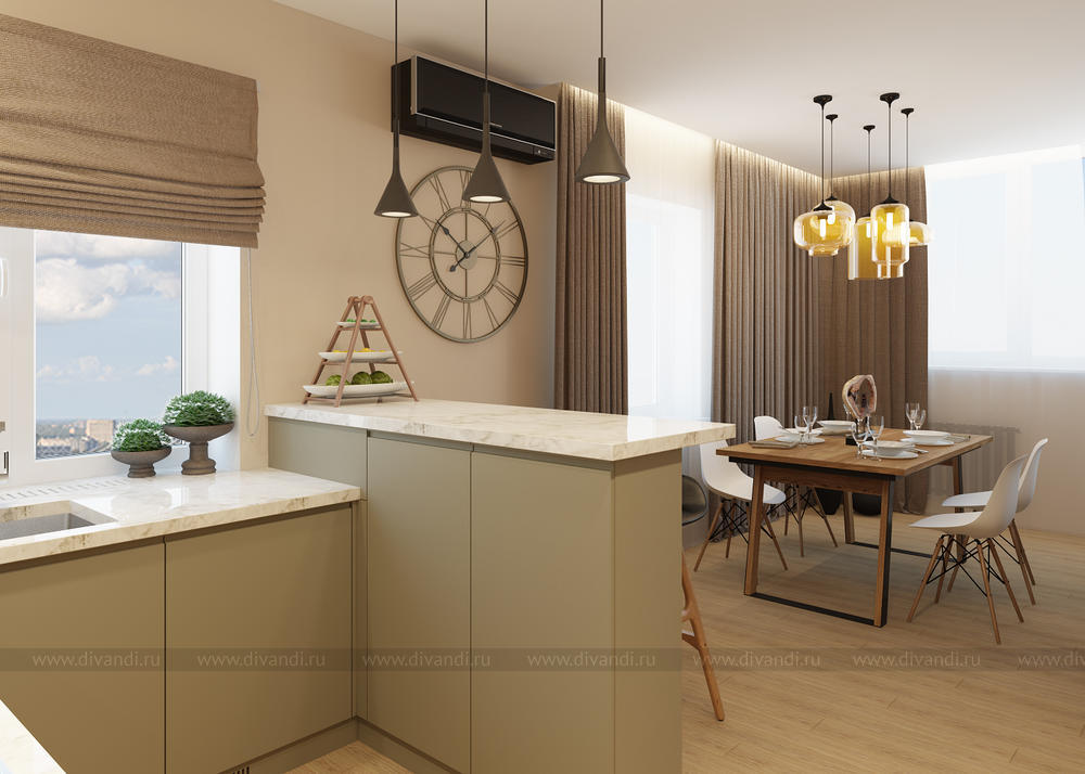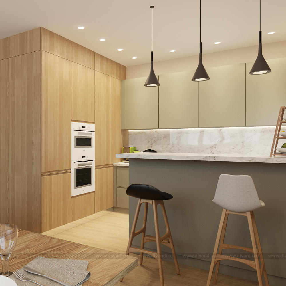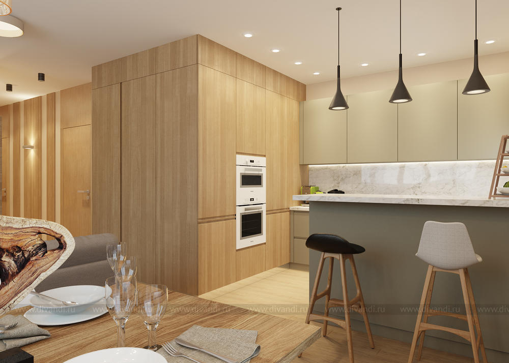 Кухня в 3 комнатной квартире совмещенная с гостиной. Задача стояла сделать современный и простой по форме и линиям интерьер, но что бы он был теплым и уютным. Хозяйка много готовит и давно мечтала о мойке у окна. Мы постарались учесть ее пожелание о мойке и при этом постараться прикрыть за счет браной стойки основное место готовки и нарезки, что бы сохранялось ощущение чистоты и порядка при взгляде на кухню из зала. Столешница и фартук это натуральный камень, фасады матовая покраска серо оливкового цвета, колонны выполнены в шпоне тонированного дуба. Холодильник у нас встроенный, его боковая часть плавно переходит и сливается с дверями за которыми спрятаны стеллажи для книг. Это сделано с той целью что бы весь элемент смотрелся одним единым массивом.