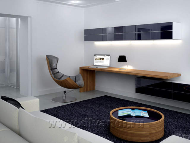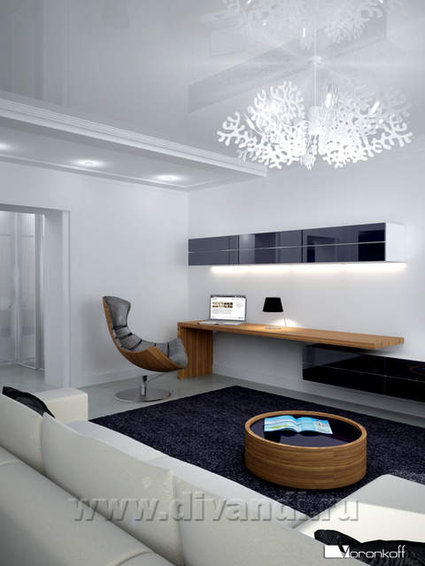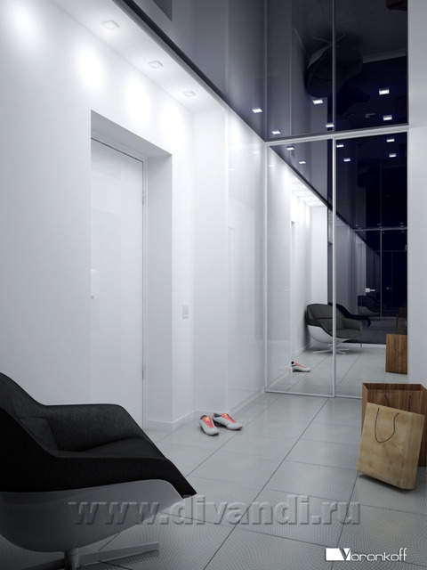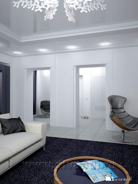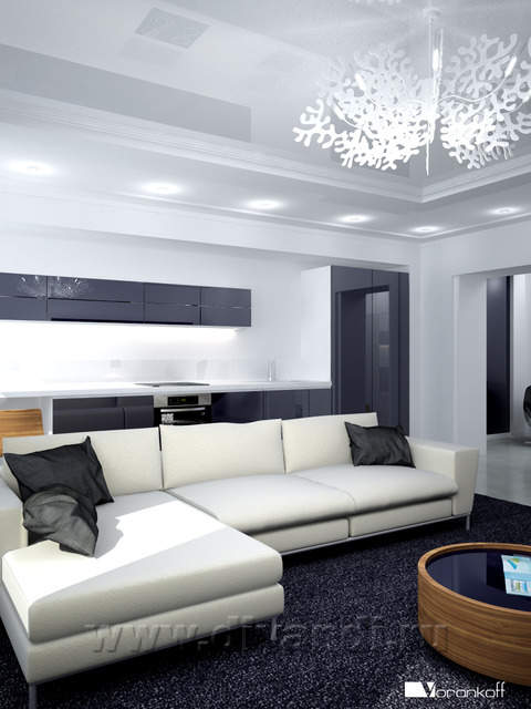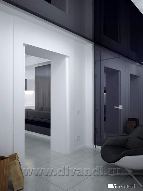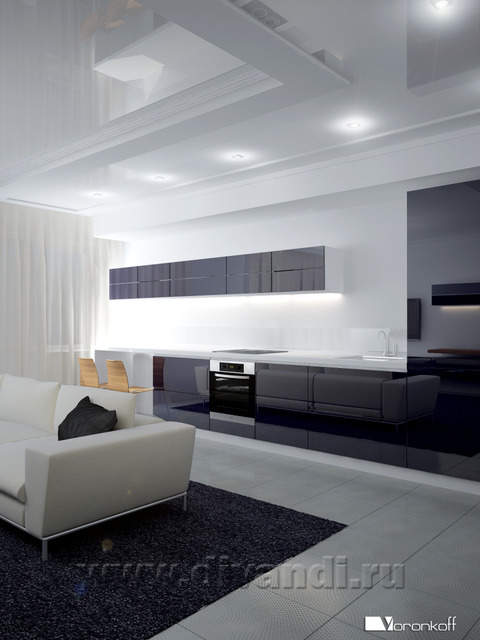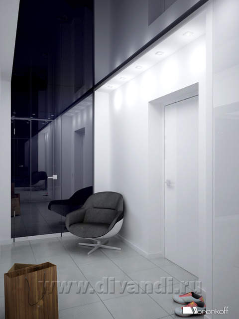 В этом интерьере хотелось уйти от ставшей уже банальной черно-белой гаммы, но в то же время остаться в стилистике темного глянца. Темно-синий цвет стал для этой задачи блестящим решением - остаться в цвете и не потерять глубины. Во всем интерьере применима авторская мебель за исключением пожалуй кресел - Cassina Auckland и Shelley, а так же дивана - Dogtas Emotion. На полу был использован керамогранит фабрики Dvarcioniu Keramika с покрытием под металл, стены покрыты декоративной штукатуркой.