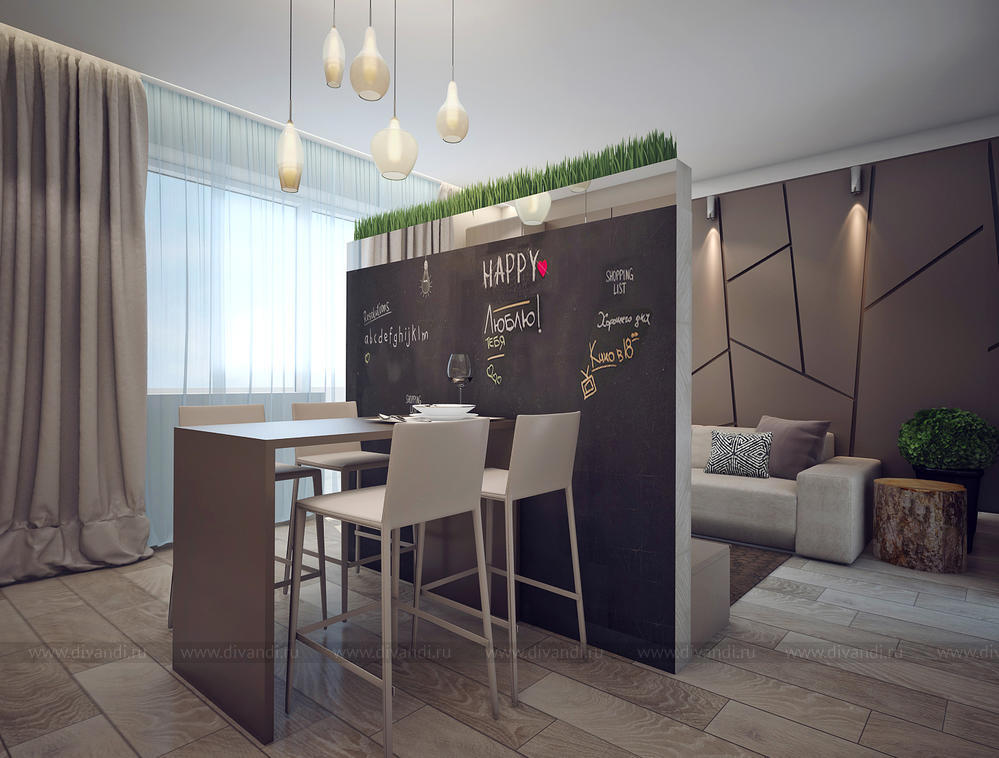 Грифельная доска — один из модных трендов последнего времени. Грифельную доску дожно приобрести готовую в магазине или воспользоваться специальной пленкой или краской с эффектом грифельной доски. Смотрится это очень эффектно и не требует больших затрат. Грифельное покрытие легко можно использовать для украшения всевозможных предметов мебели и декора. Мы применили грифельное покрытие в интерьере кухни-на перегородке между гостиной и кухней.