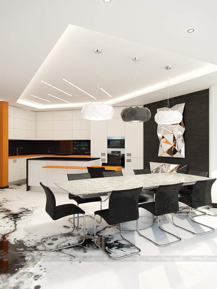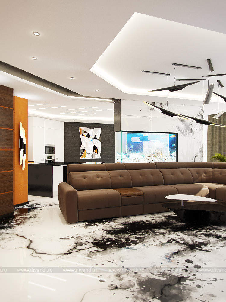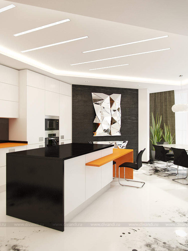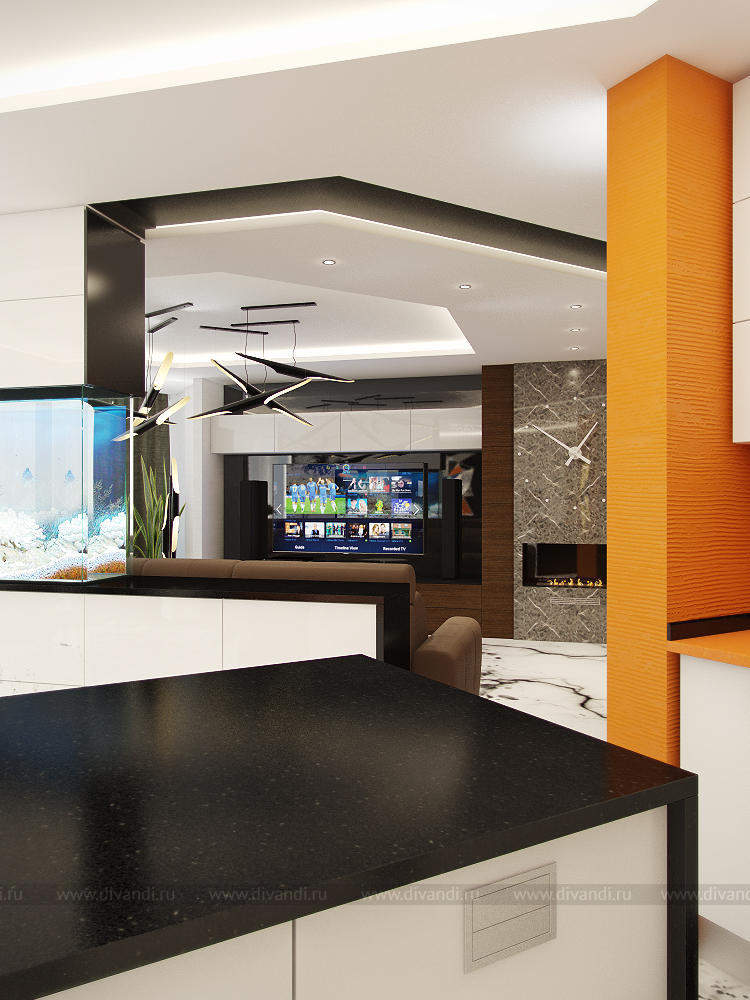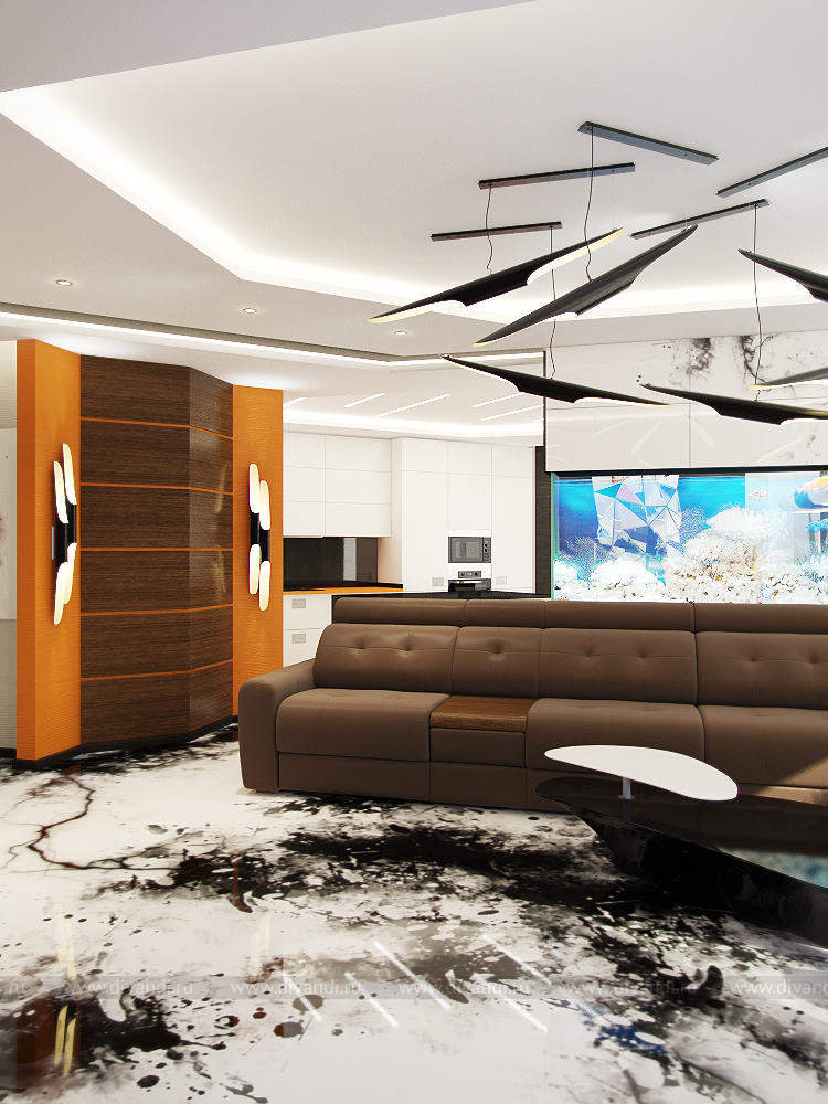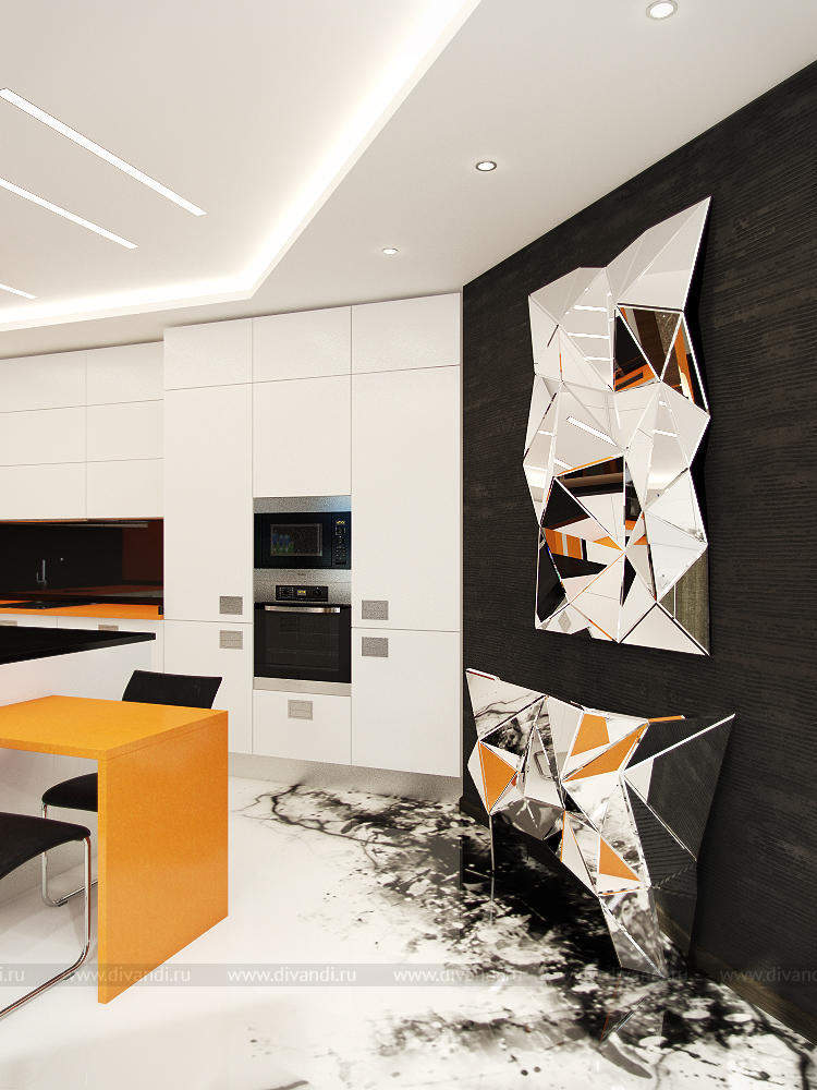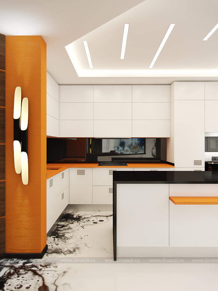 Задача стояла в том, что бы сделать необычный интерьер, ни как у всех, основные цвета выбраны заказчиками, обязательное использование наливного пола и оранжевого цвета! Идея рисунка на полу это авторский эскиз черных пятен молний и клякс, в хаотичном порядке.