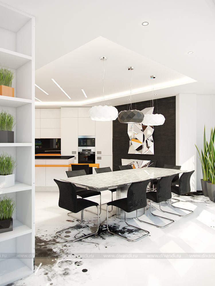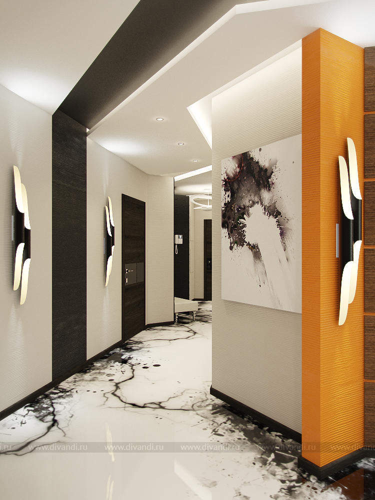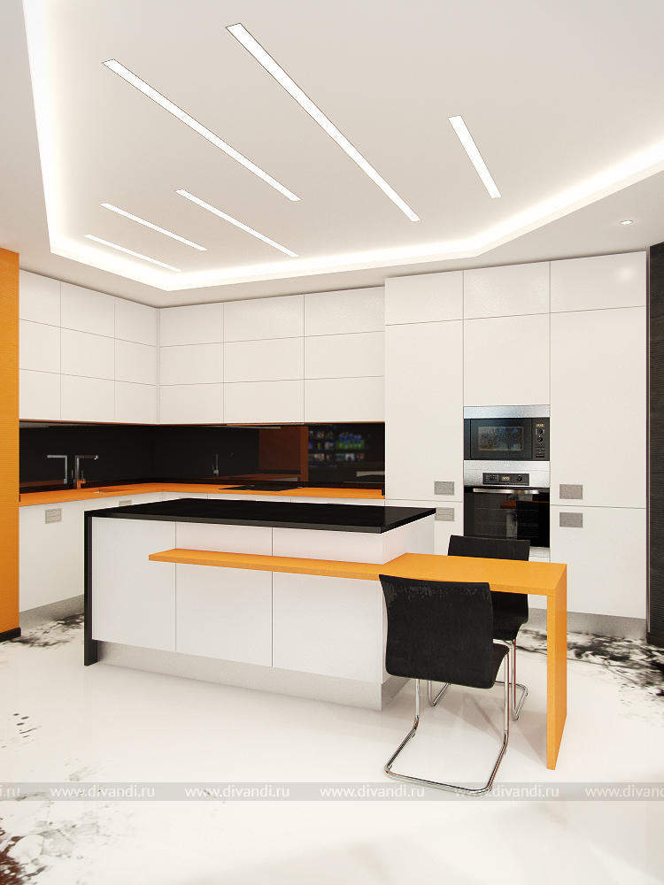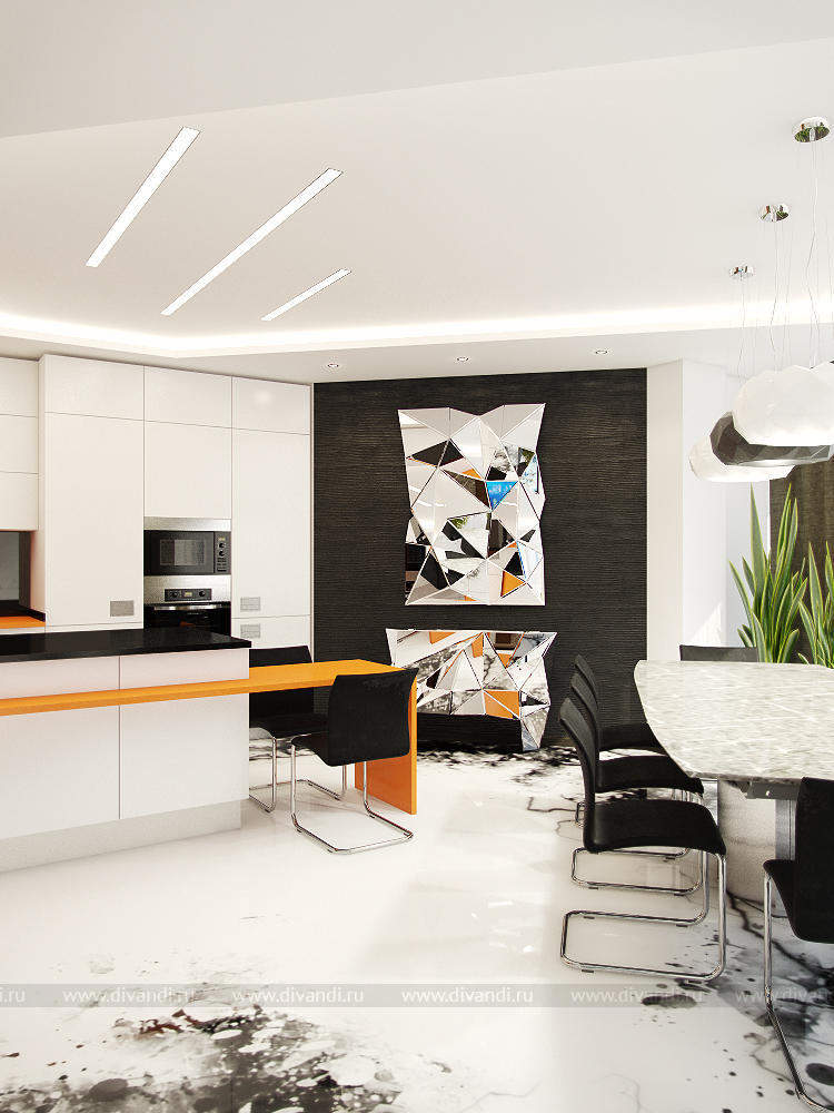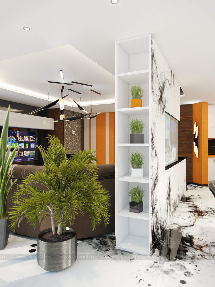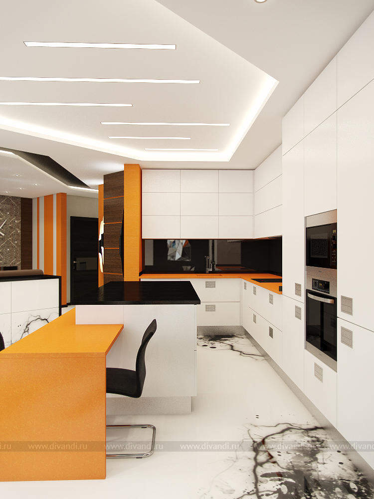 Задача стояла в том, что бы сделать необычный интерьер, ни как у всех, основные цвета выбраны заказчиками, обязательное использование наливного пола и оранжевого цвета! Идея рисунка на полу это авторский эскиз черных пятен молний и клякс, в хаотичном порядке.