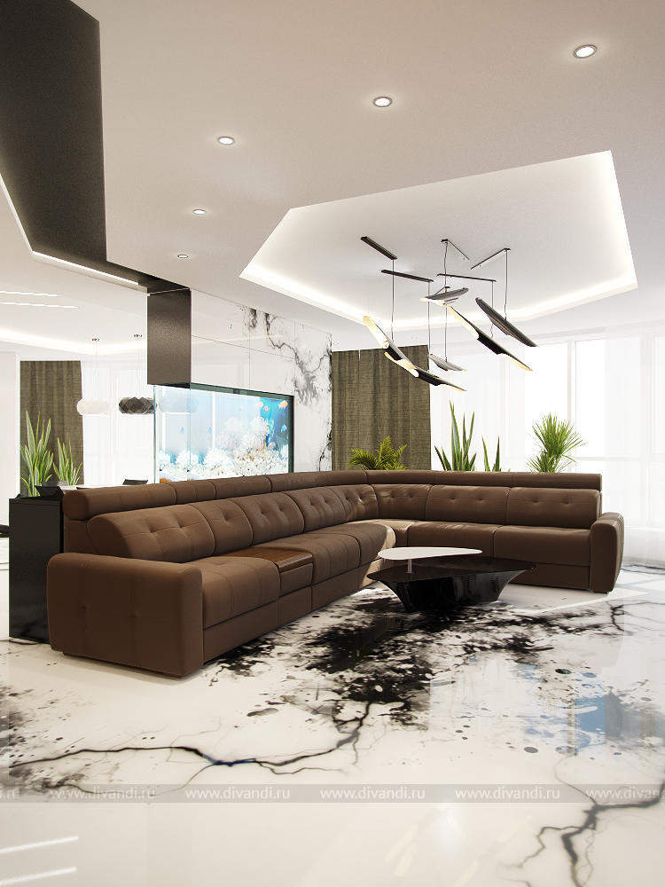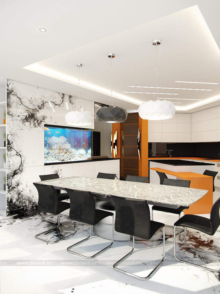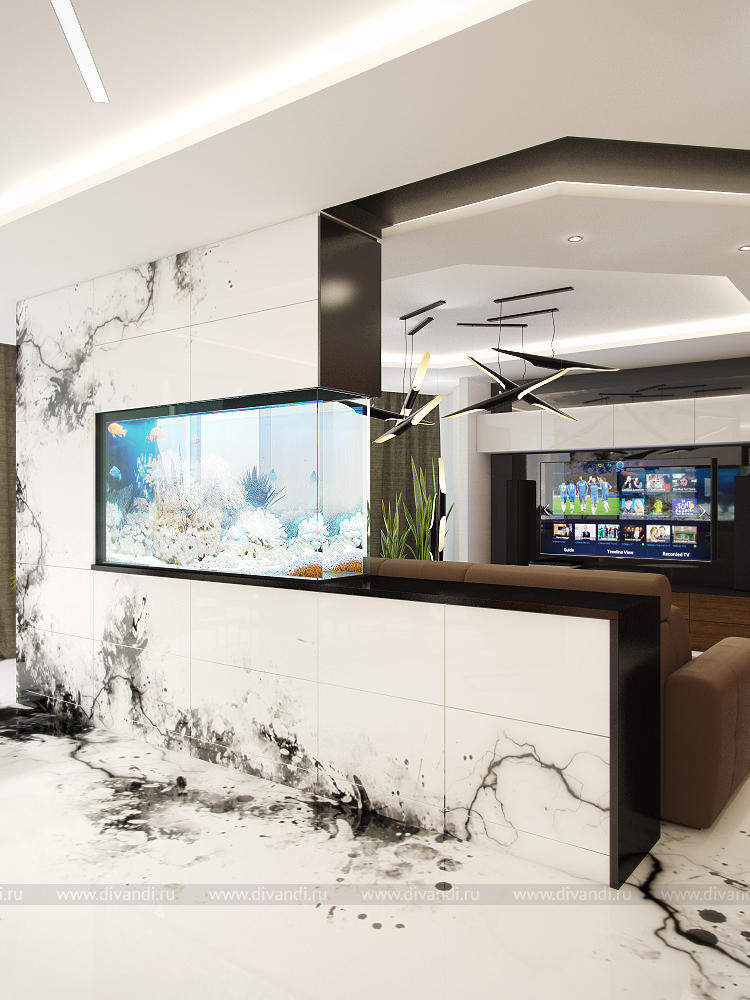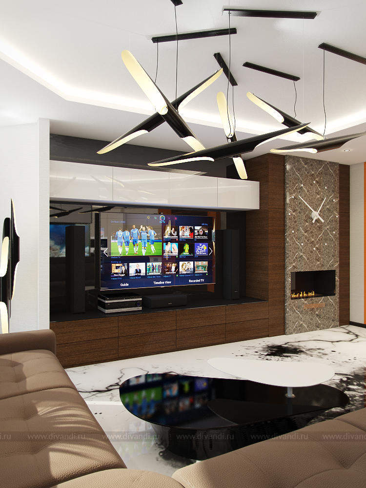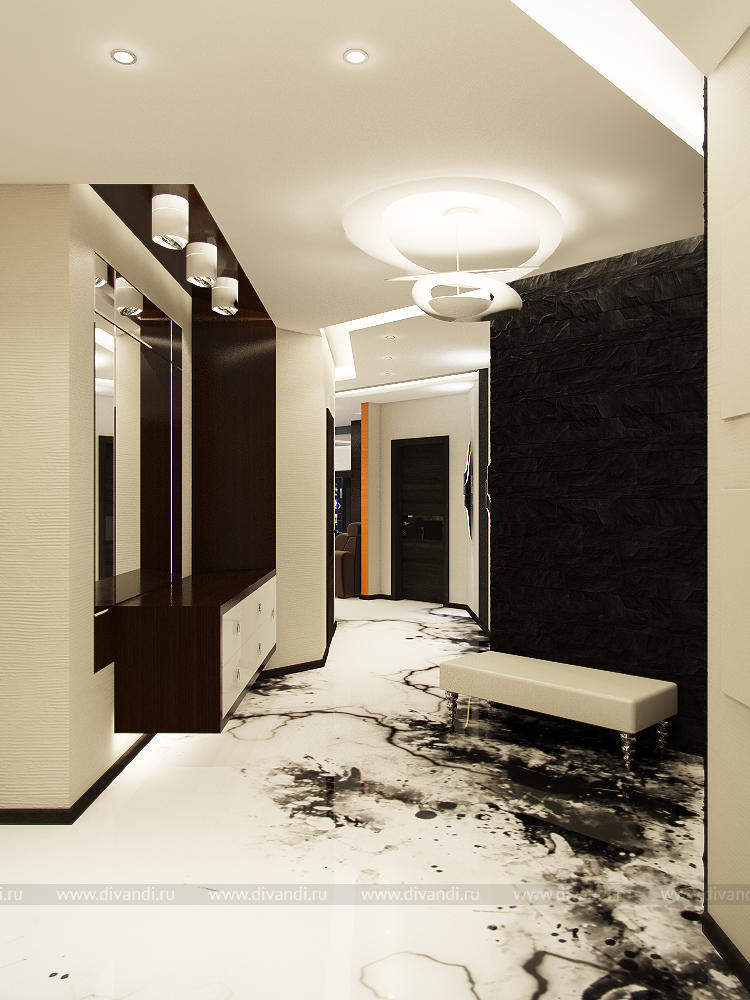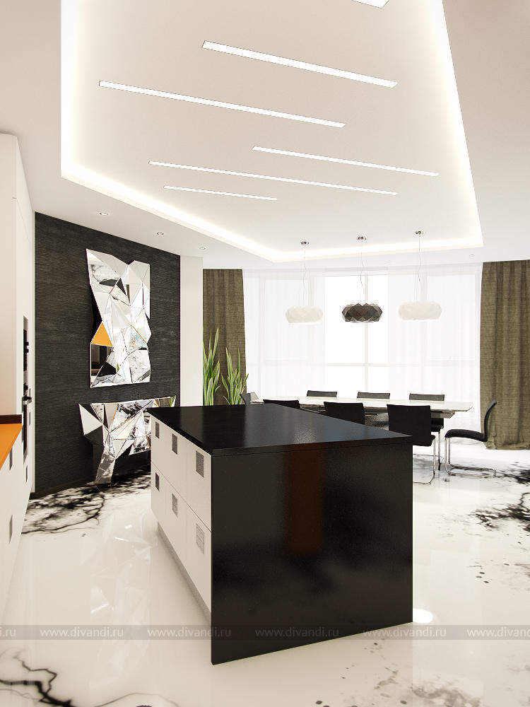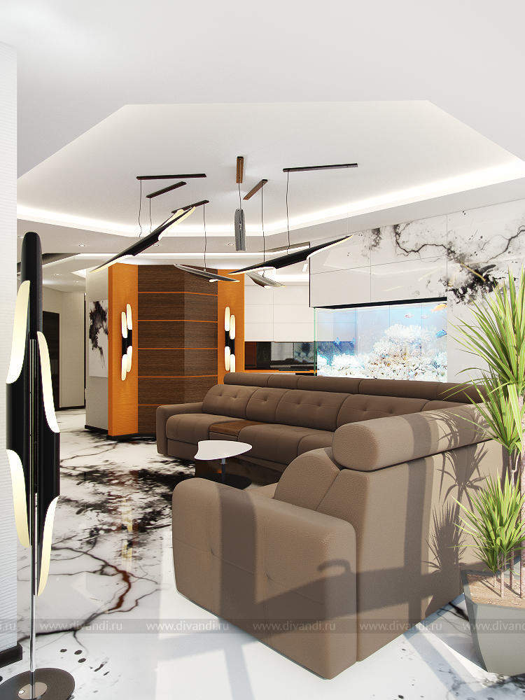 Задача стояла в том, что бы сделать необычный интерьер, ни как у всех, основные цвета выбраны заказчиками, обязательное использование наливного пола и оранжевого цвета! Идея рисунка на полу это авторский эскиз черных пятен молний и клякс, в хаотичном порядке.